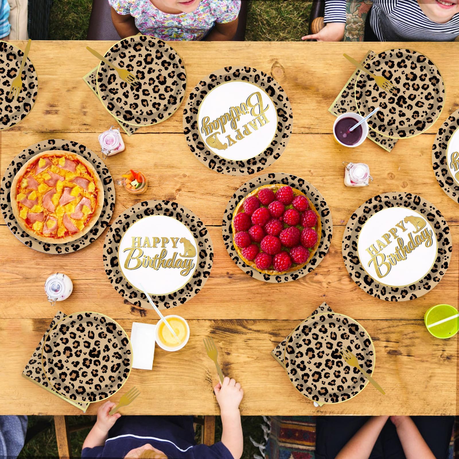 Leopard Print Design: This all-inclusive leopard print party tableware set is just for your jungle animal friends and your guests will love them too. The plates feature leopard print spots and reads "Happy Birthday". They add speckled style to your parties and other fun gatherings. Ideal for creating a celebratory atmosphere for your upcoming safari party