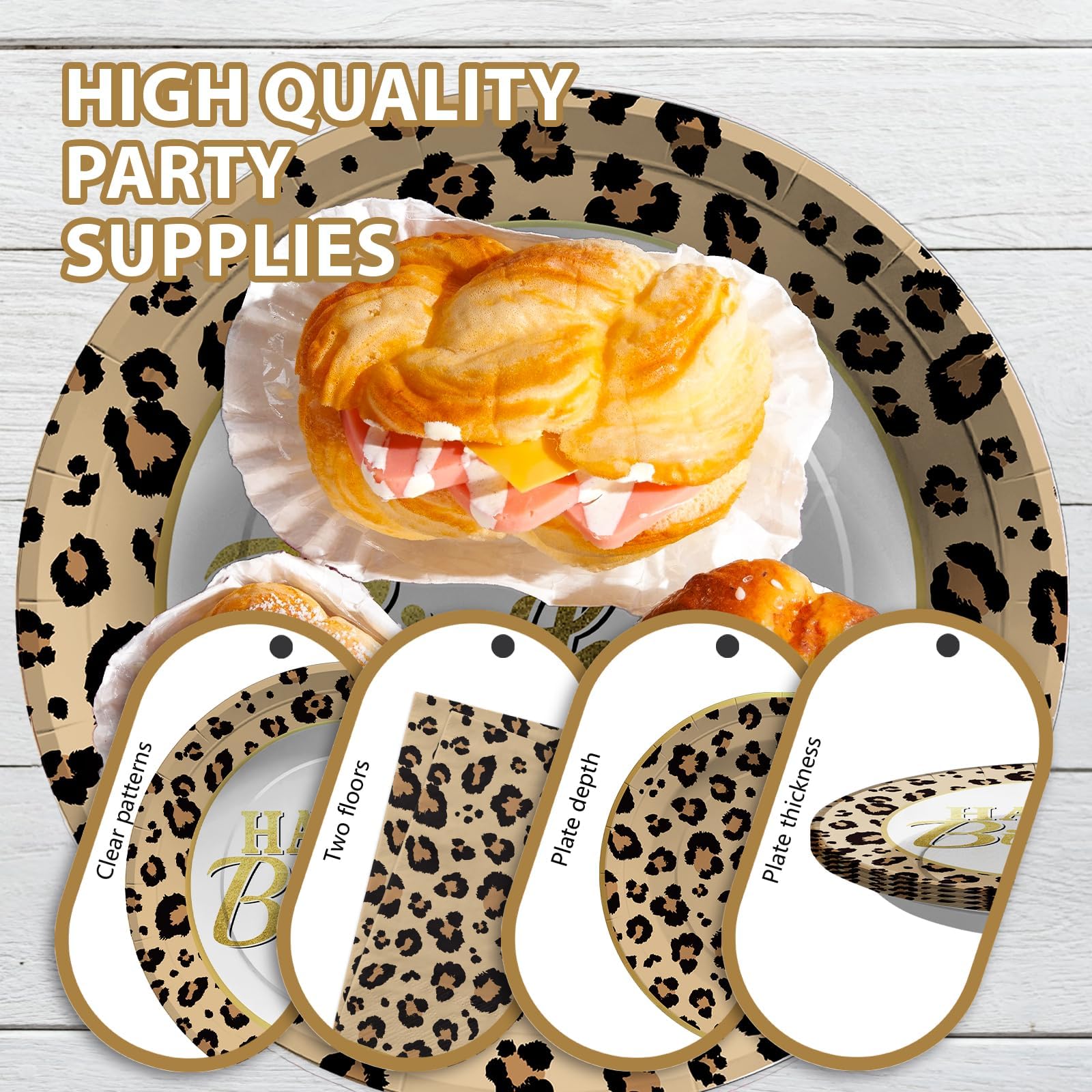 Premium Material: The brown leopard disposable plates are made of heavy duty paper. brown leopard disposable party plates are designed to be strong enough to hold a full plate of food without folding and tearing. Napkins are soft and absorbent. Napkins are 2-layered thick to ensure durability. (Tips:Please do not microwave these products.)