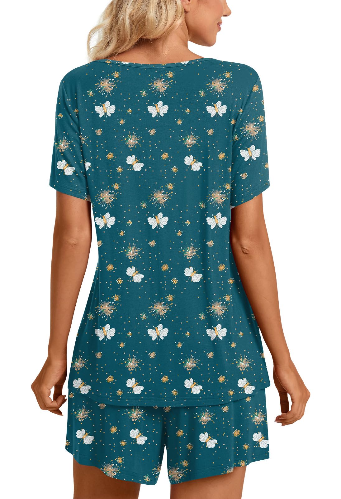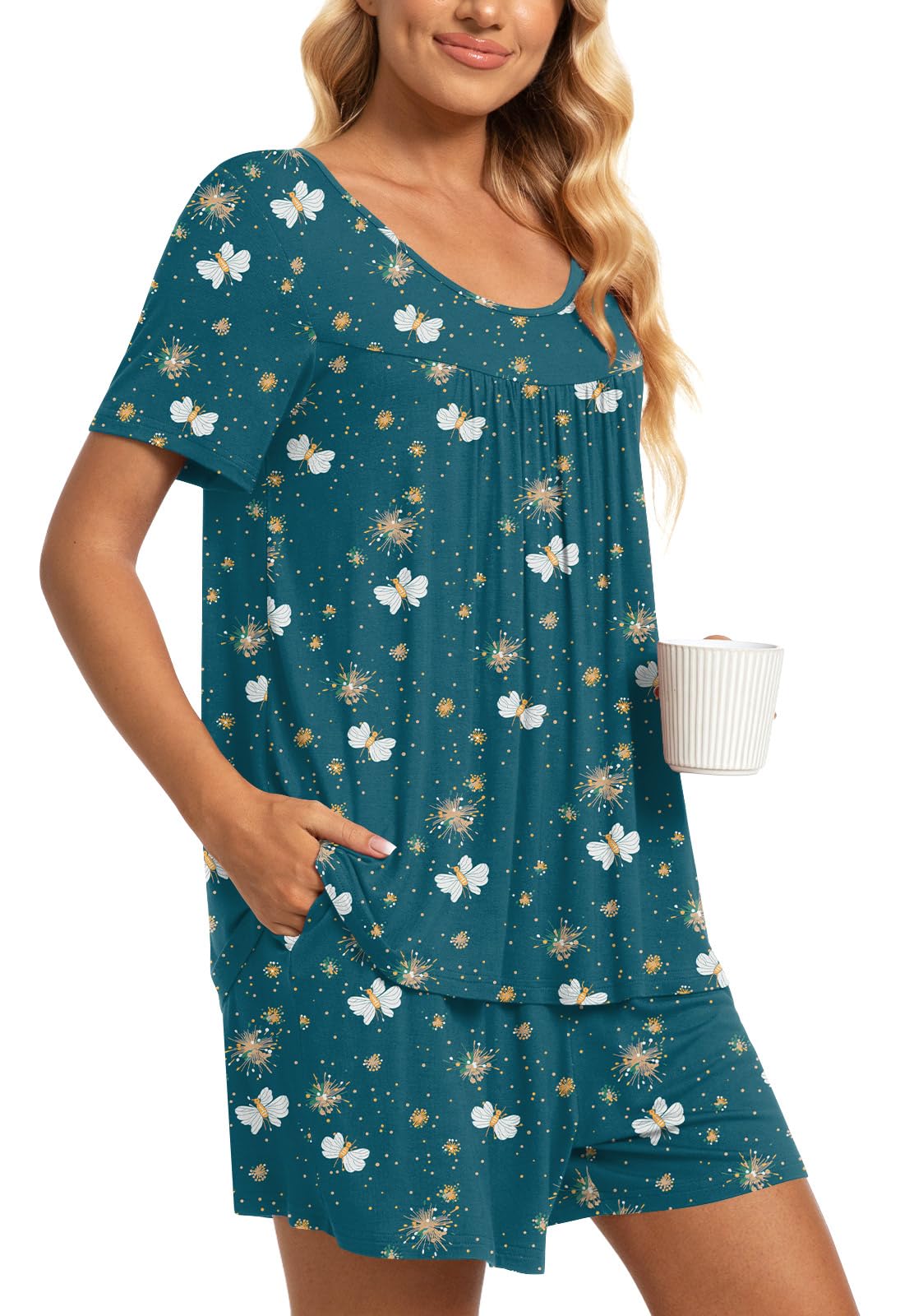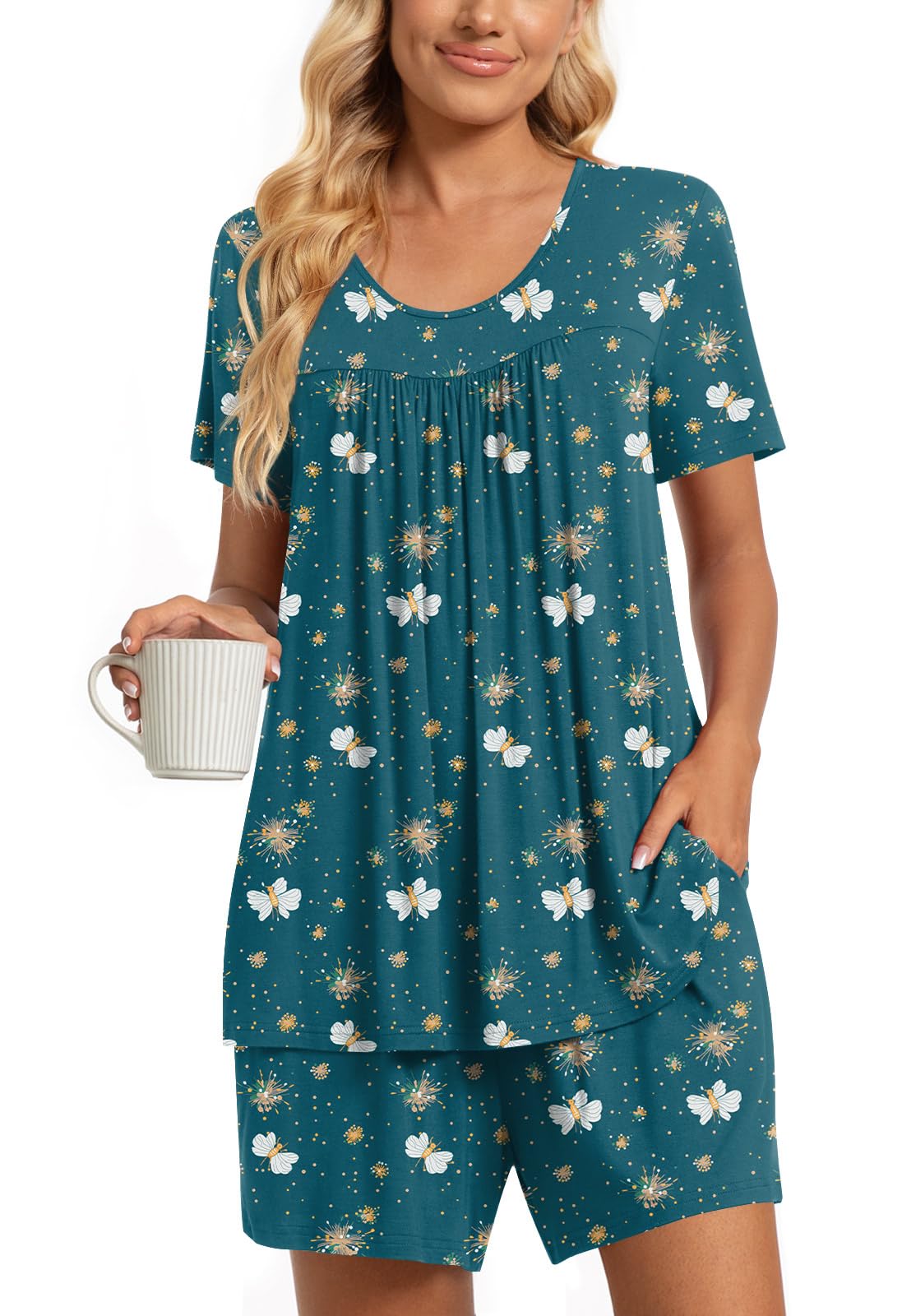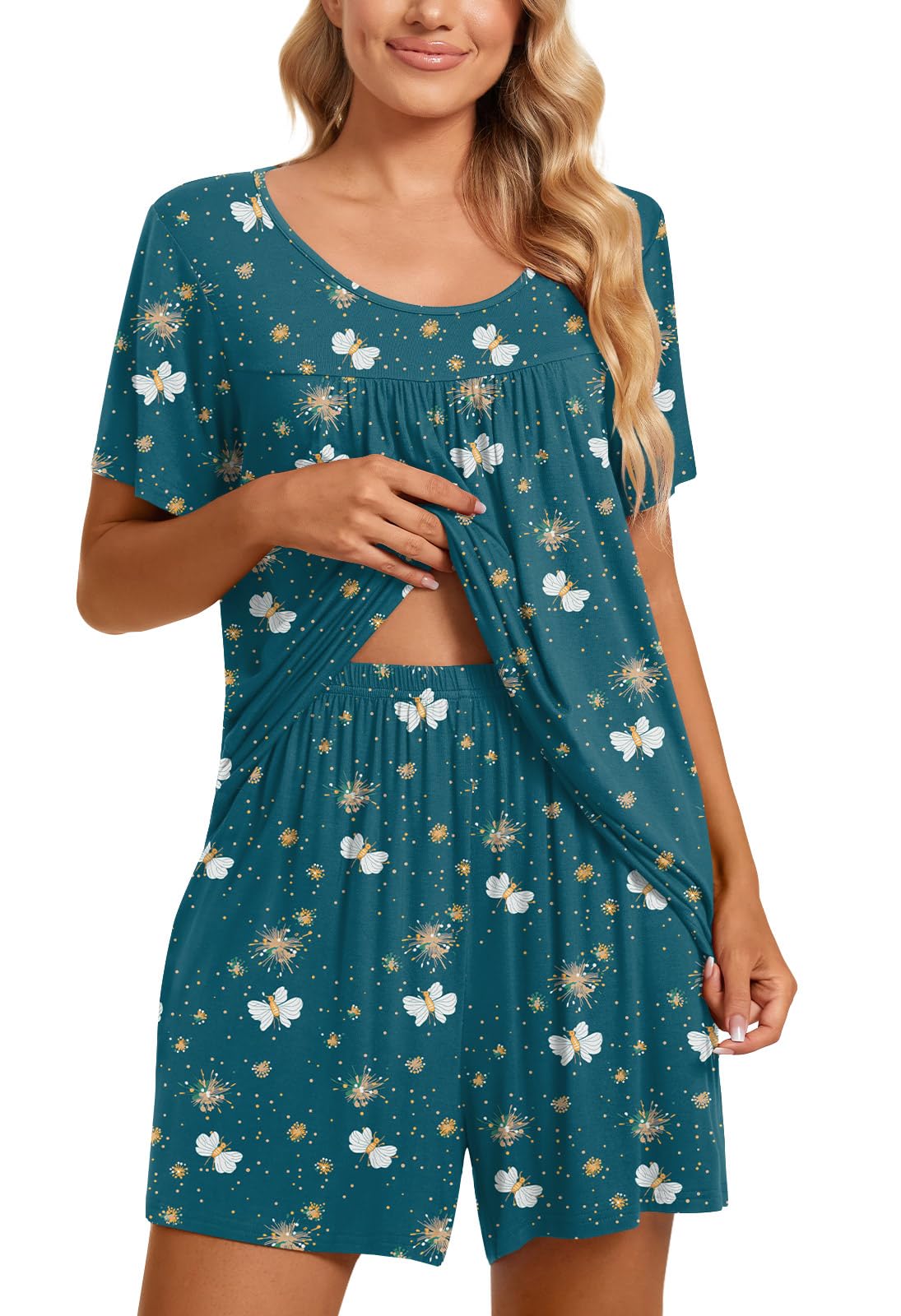 Fashion-Simple Design: Cute two piece outfits, short sleeve tops, soft nightwear, scoop neck and front pleated detailed design. Elastic waistband shorts, casual loose comfy, graceful and easeful