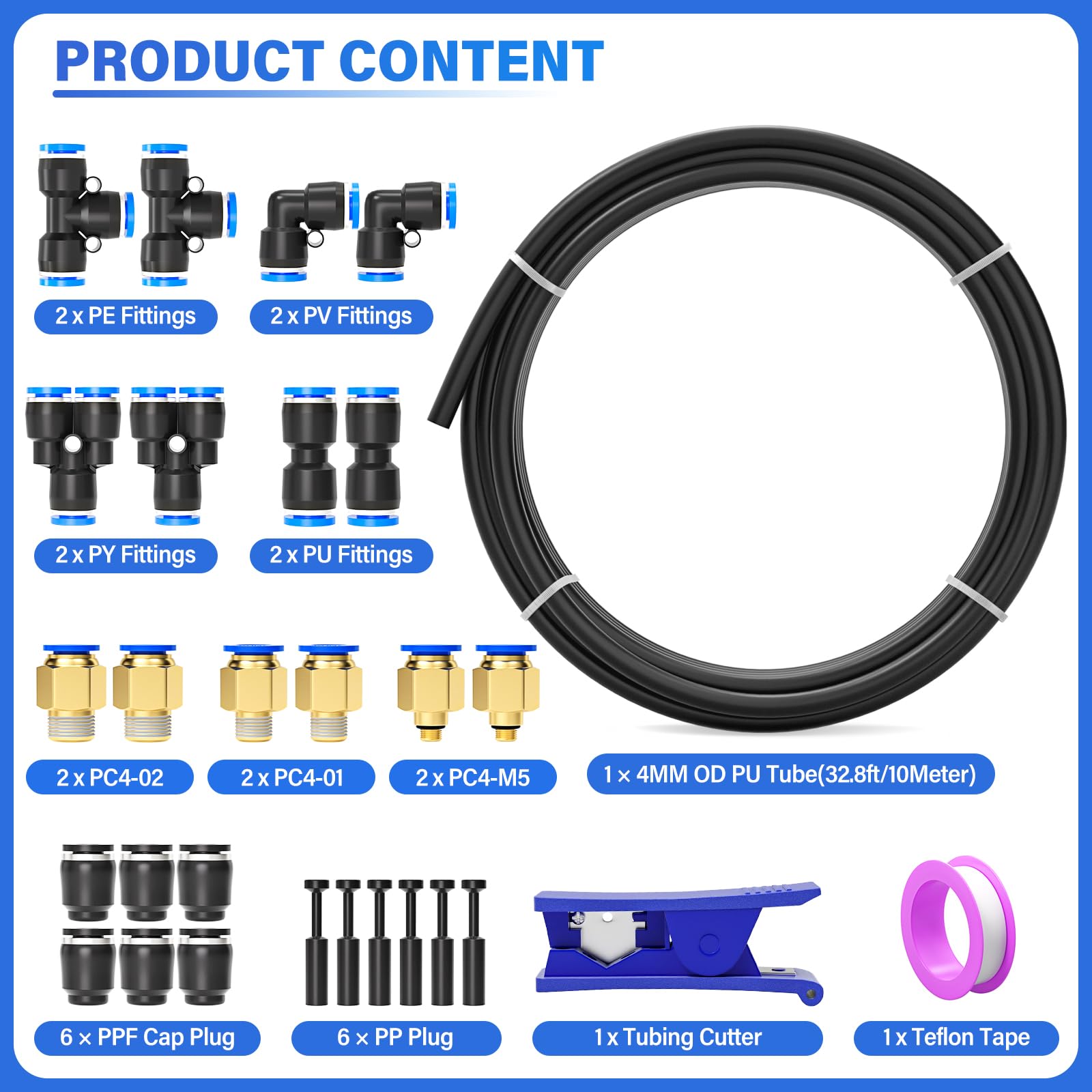 【Package Included】1 × 4mm PU Tube(10Meter),2 × PE-4(Union Tee),2 × PV-4(Elbows),2 × PY-4(Y Spliters),2 × PU-4(Straight Unions),2 × PC4-M5,2 × PC4-01(1/8PT),2 × PC4-02(1/4PT),6× PPF(4MM OD),6× PP(4MM OD),1× Teflon Tape,1× Tracheal Scissors