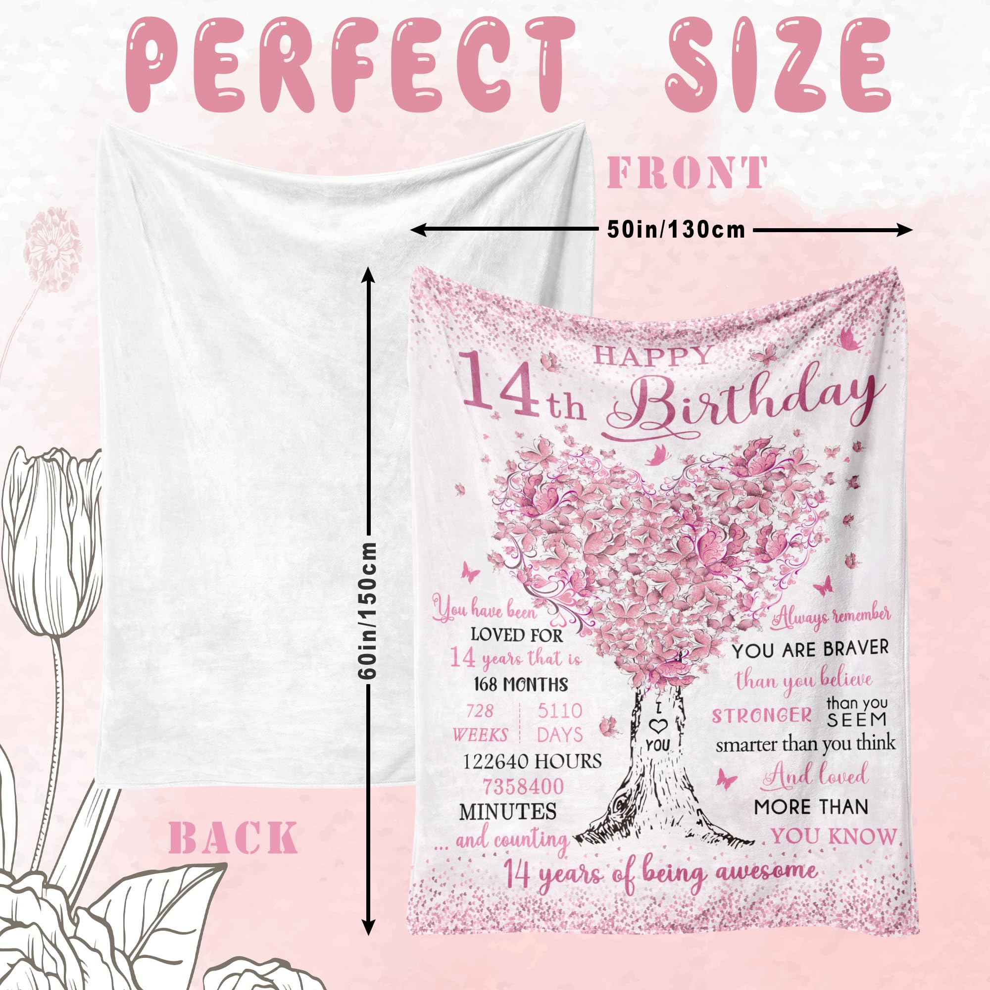 đ©·ăBirthday Gift for 14 Year Old Girlă: Looking for gifts for your 14 year old girl but don't know what to get her? Look no further than the soft and heartfelt Birthday Blanket! Adorned in soft pink, it features a charming pink tree of life, flowers, and butterflies. This thoughtful design signifies growth and new beginnings. This heartwarming blanket delivers both warmth and sentiment, making it a perfect choice for this special milestone of turning 14.