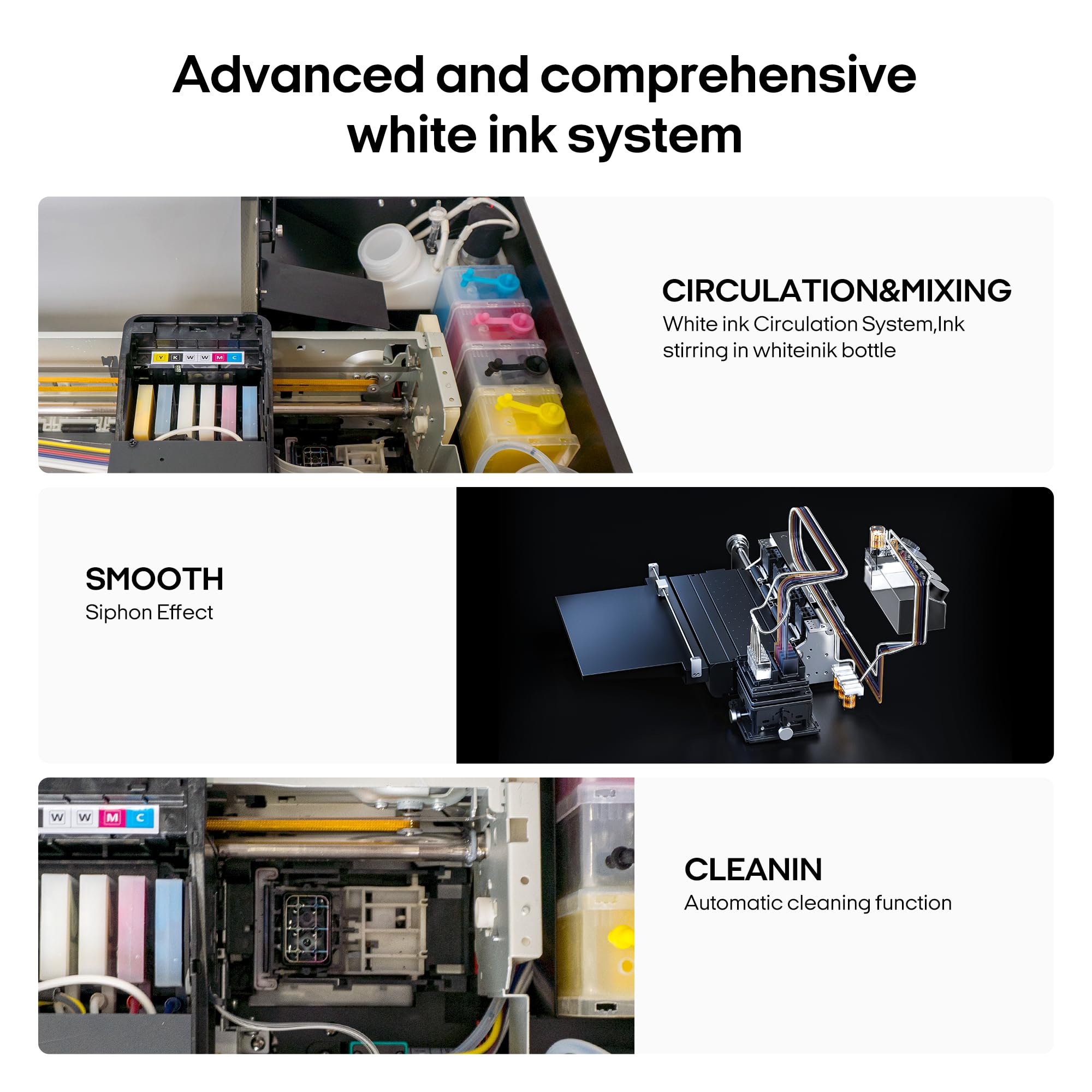 Enhanced Performance: Say farewell to print head clogs with our DTF Printer's innovative siphon filtration diaphragm pump. By minimizing blockages, this feature ensures smooth printing sessions, allowing you to focus on unleashing your creativity.
