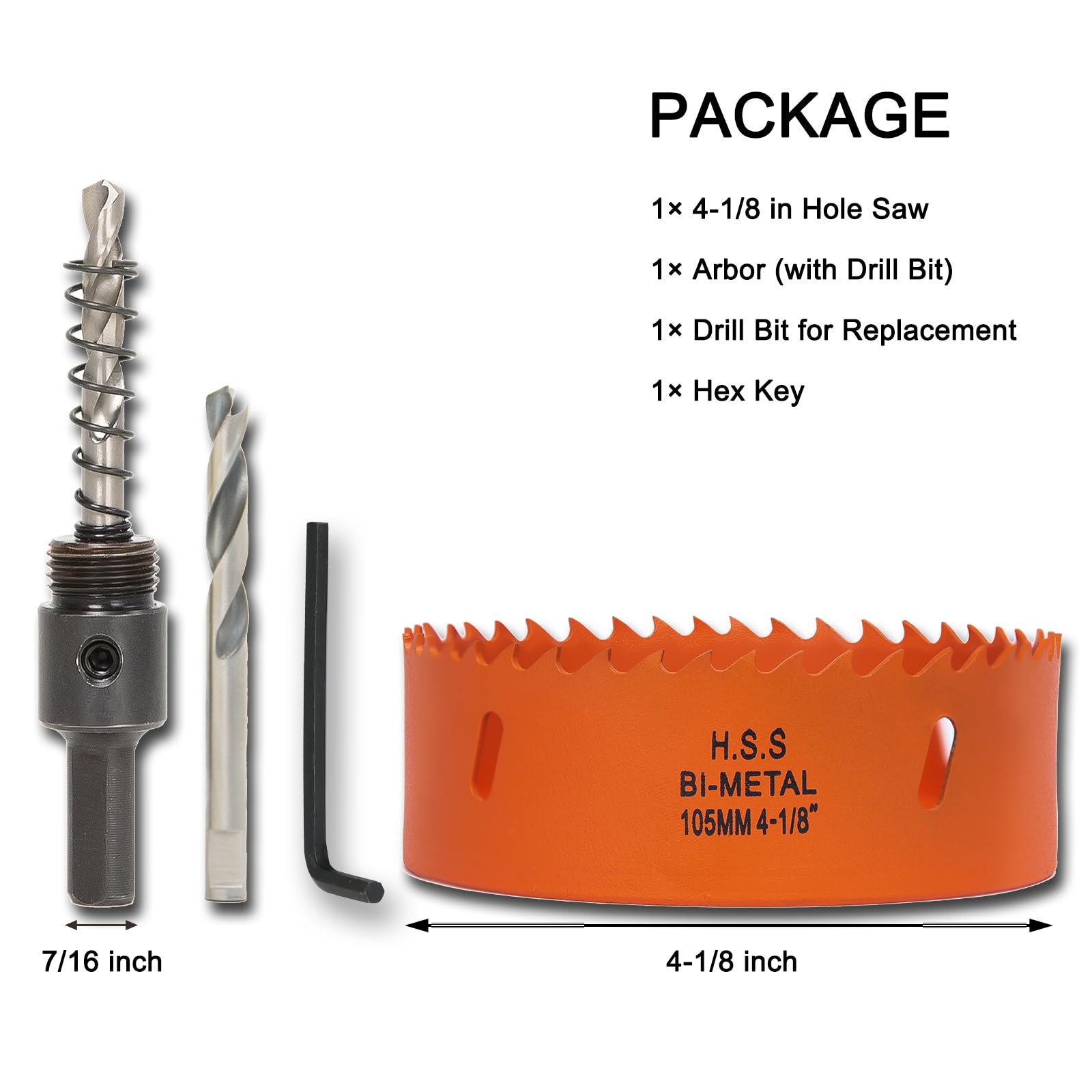 Package Included: 1 pc 4-1/8 inch hole saw, 1 pc arbor(with 1 drill bit), 1 pc replacement drill bit, 1 pc hex key
