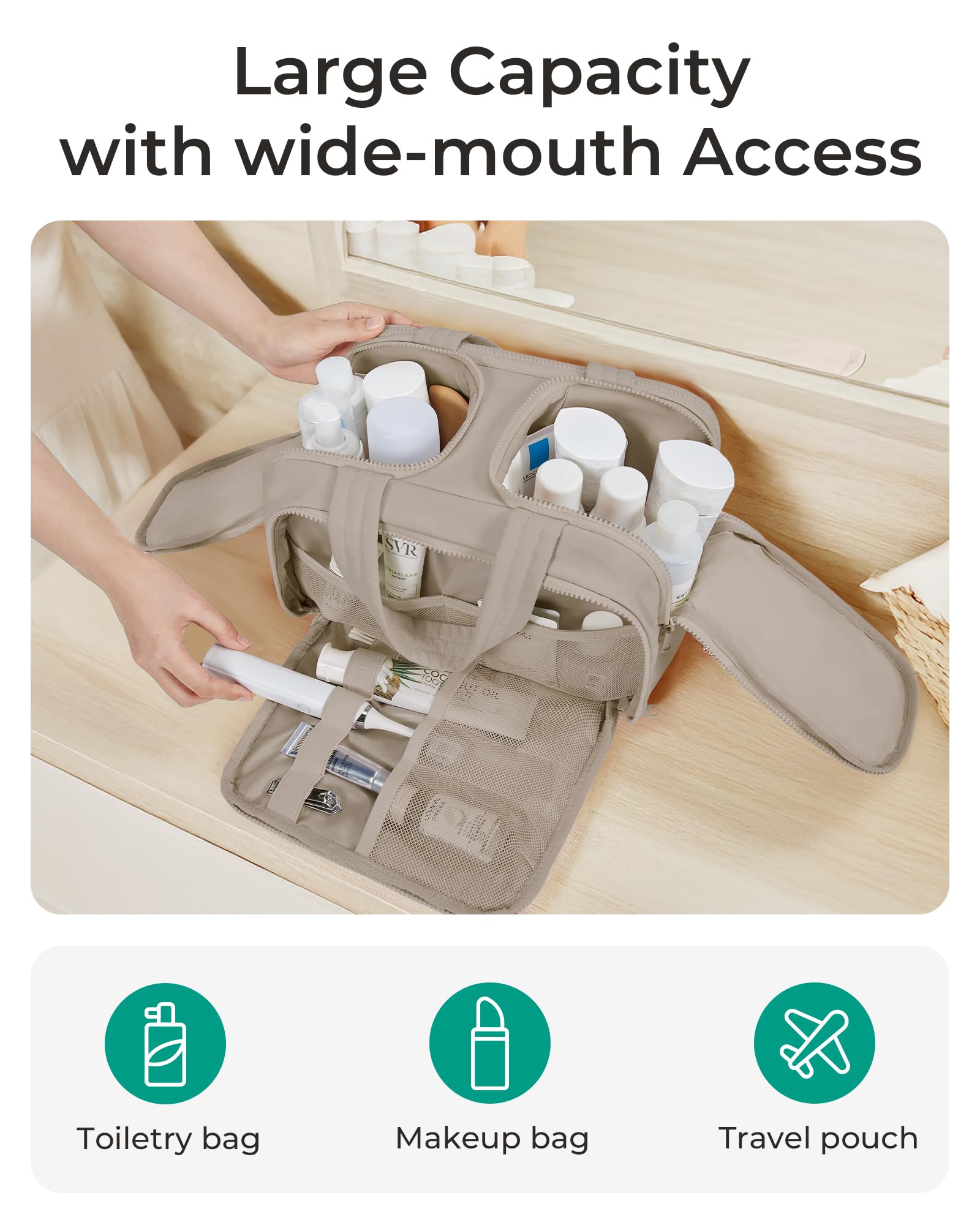 Easy Access and Keep Upright : Full opening and not piling up for easy access to items. Double side full open design of travel bag for toiletries keeps cosmetic bottles and toiletries can stand upright in the middle compartment. Avoid leakage during transit