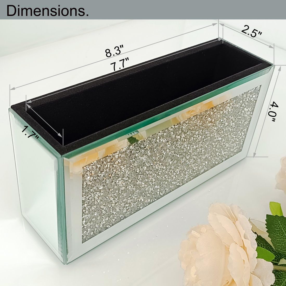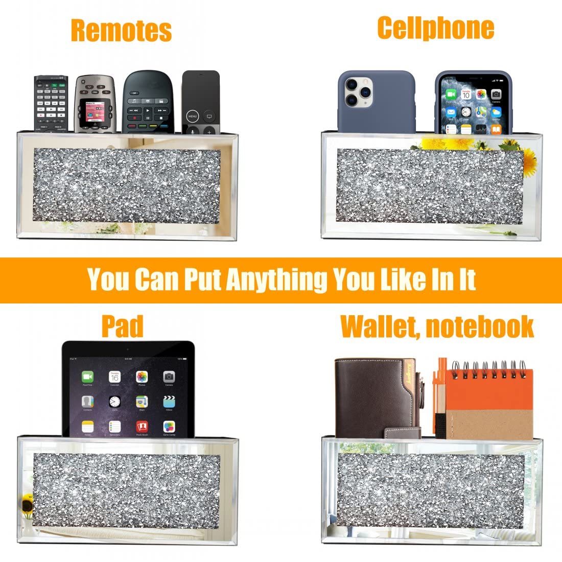USEFUL & BEAUTIFUL: Mirrored remote control holder with high-quality silver mirror and sparkling twinkling bling crush diamond,exquisite engraving and bevel edging, smooth, beautiful and fashionable. More than just hold stuff, but luxurious wall decor.