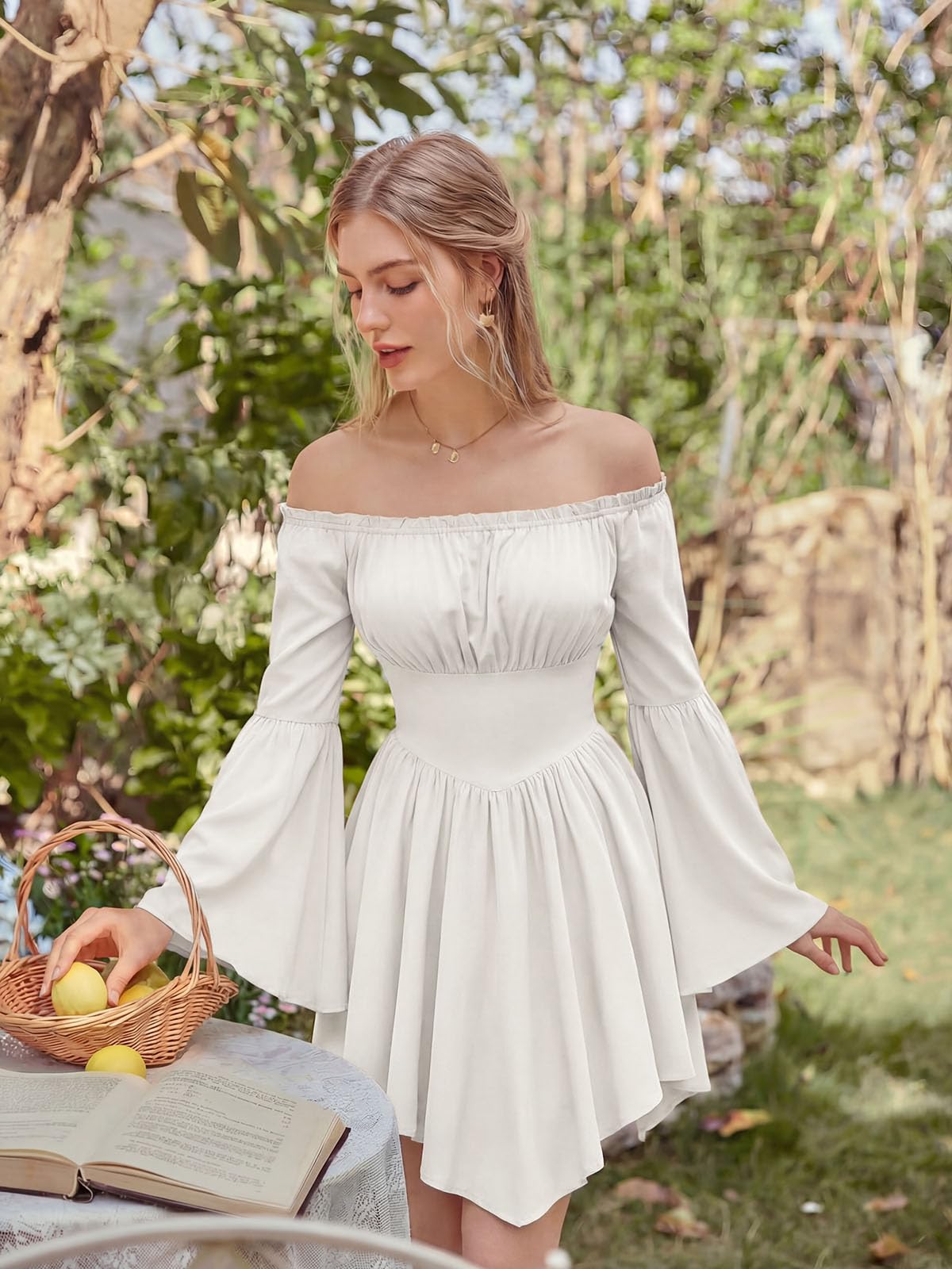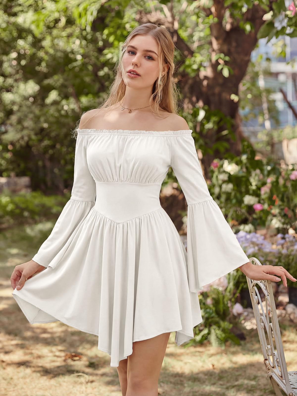 INSPIRATION - This women's off-shoulder dress features a stunning Renaissance-inspired irregular hem and beautiful agaric lace decoration at the neckline, creating a romantic and feminine silhouette