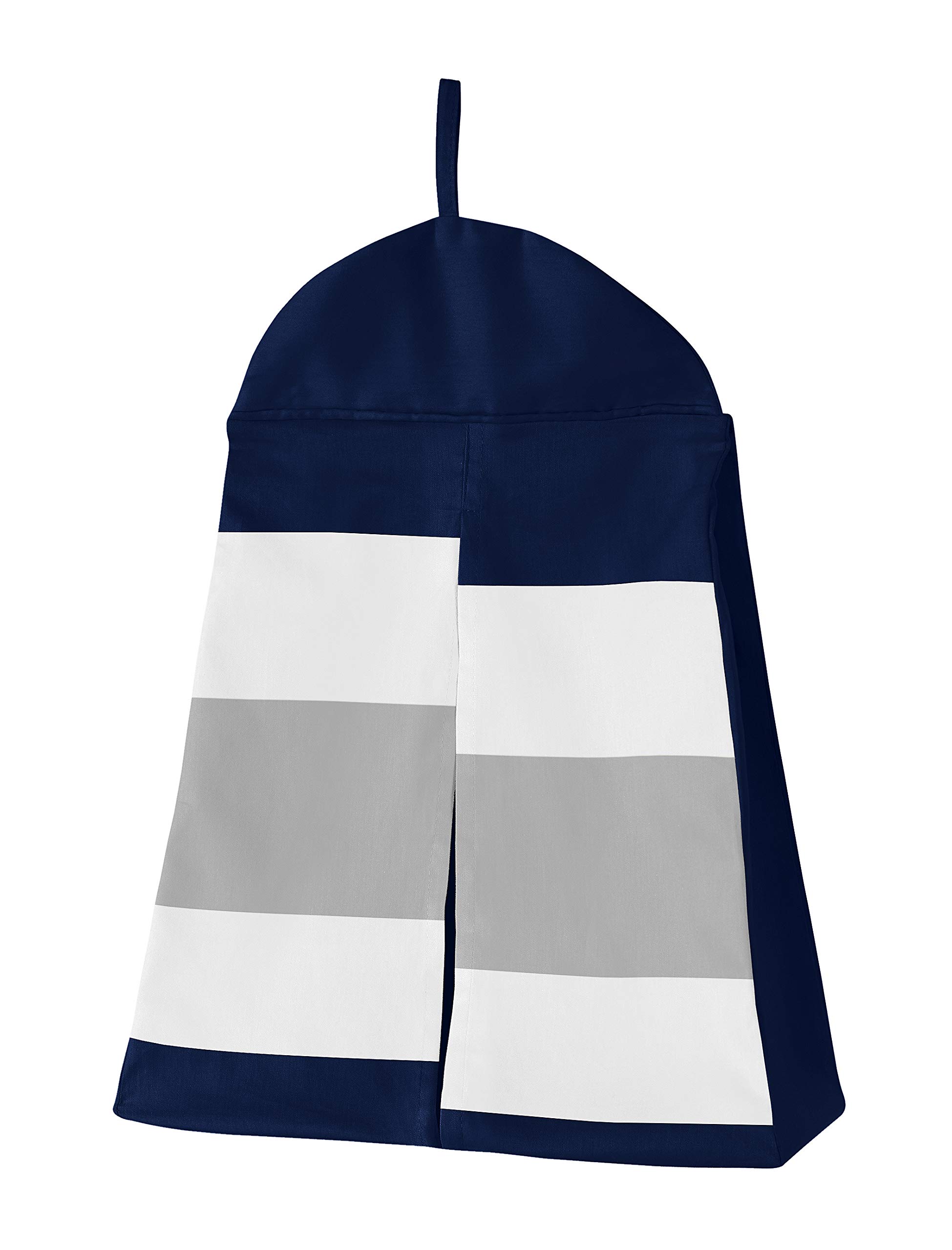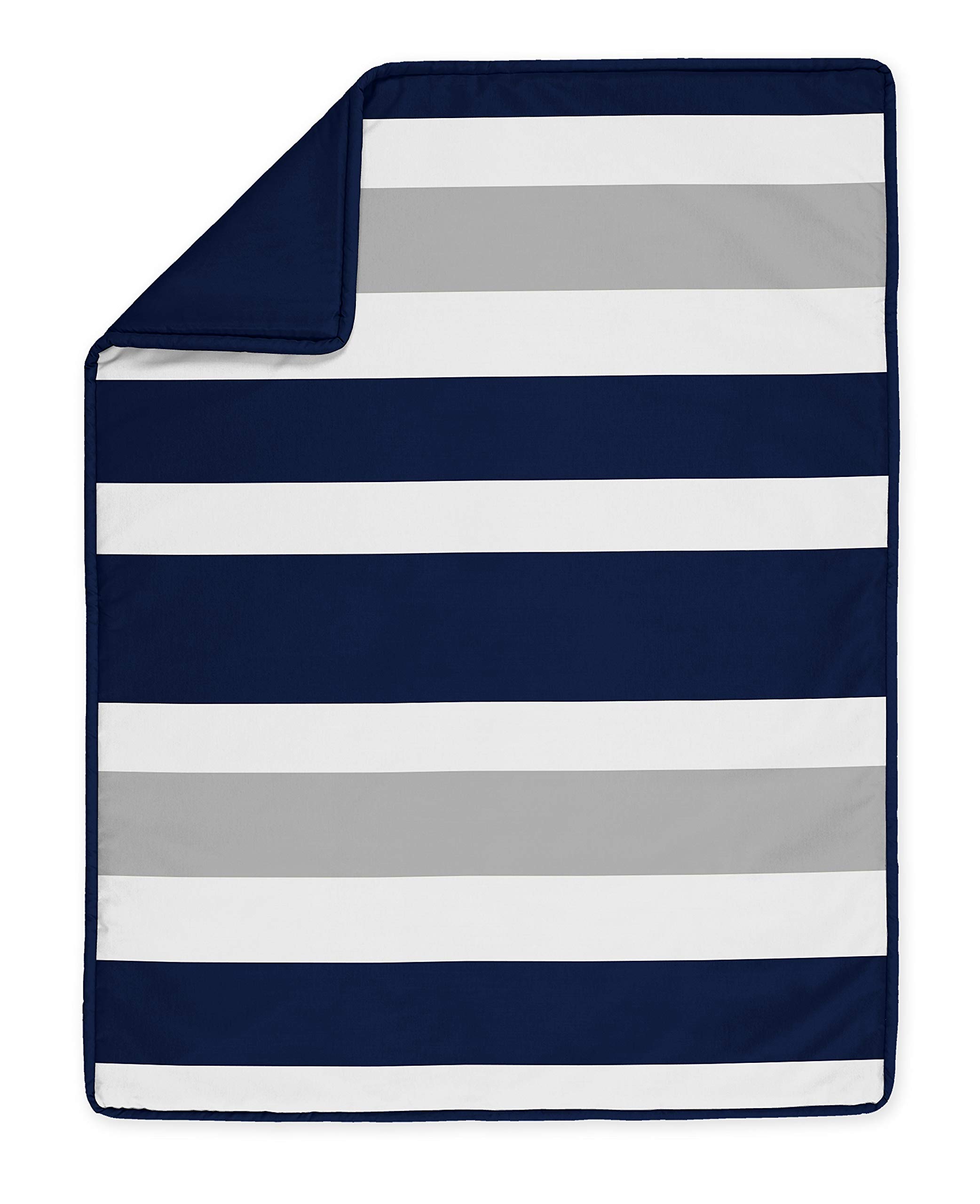 This baby boy bedding set features a large designer navy blue, gray and white stripe print