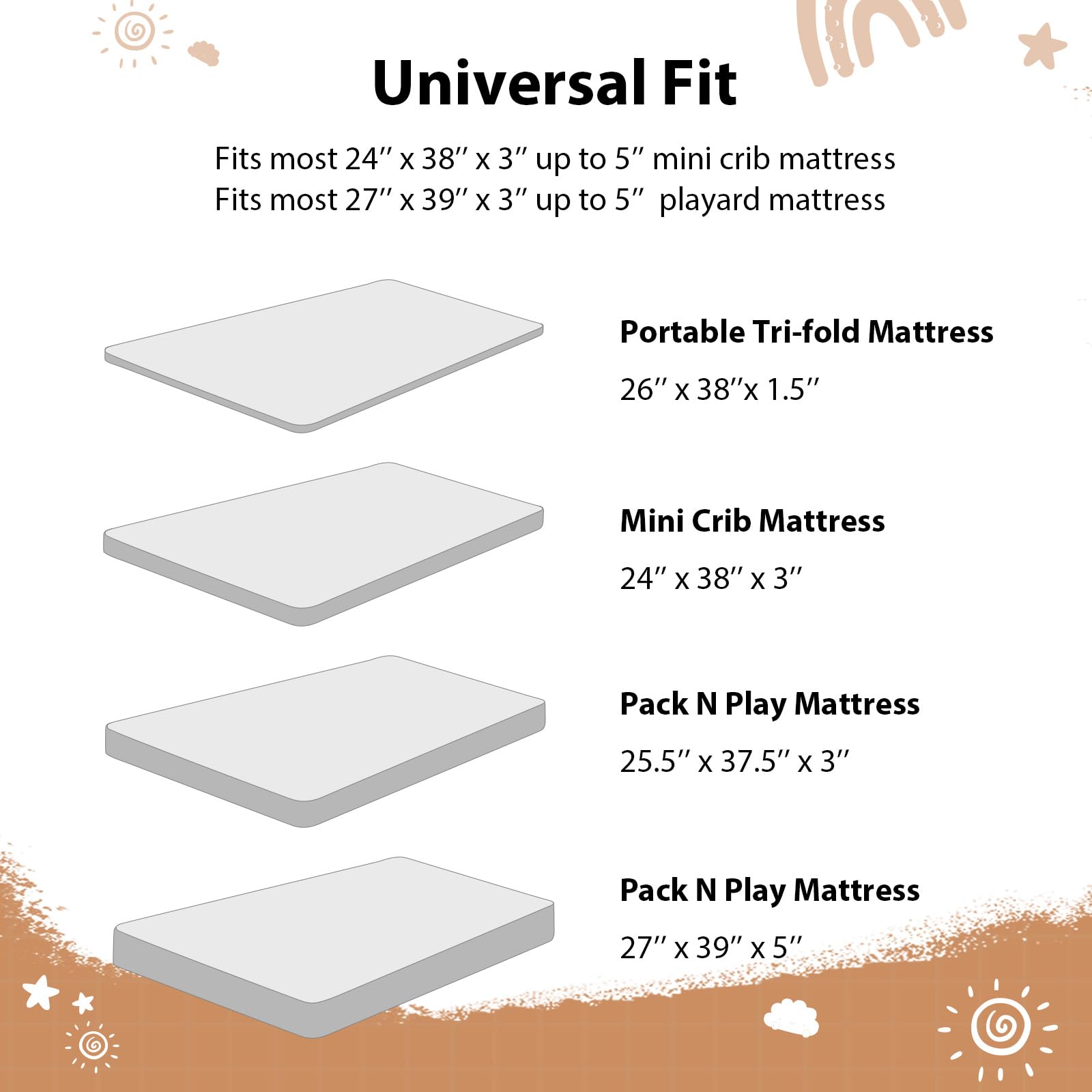 Snug Fit: Measuring 38β x 26β, our 3-pack mini crib sheets fit most baby portable plapens and pack n play mattresses. With elastic bands around the edges of the playard sheets, an 6-inch deep pocket, and stretchy fabric, they ensure a snug, wrinkle-free fit that stays securely in place.
