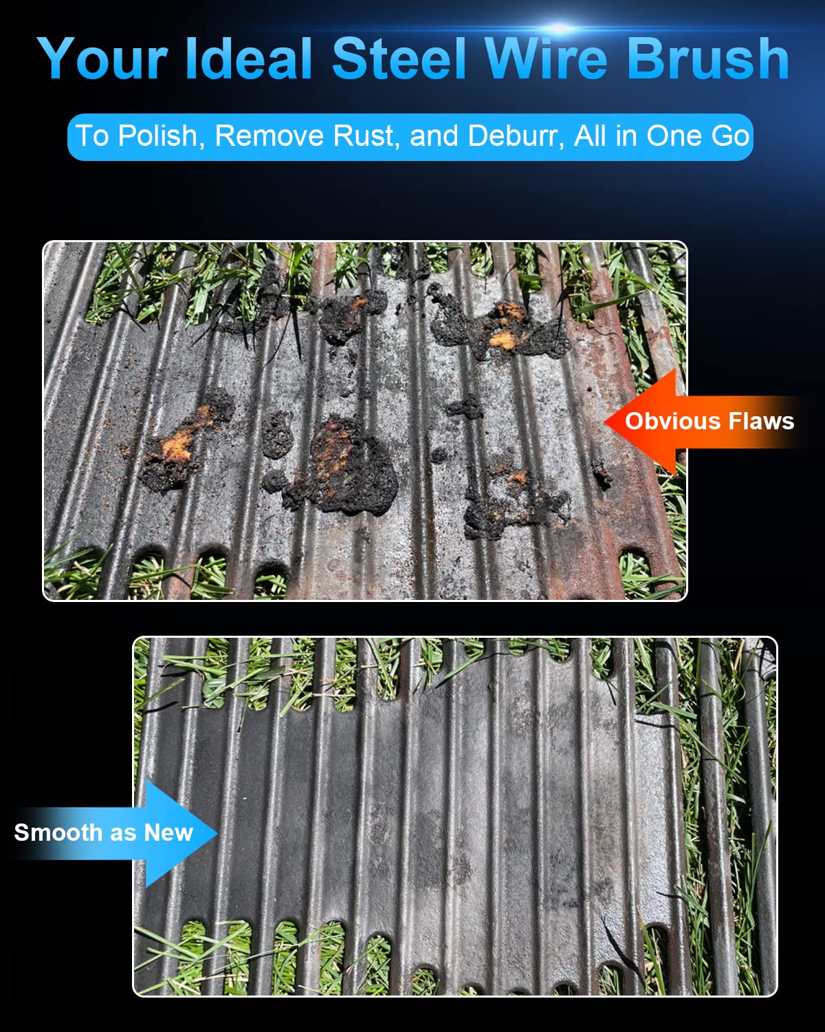 Wide Applications: Easily and smoothly remove heavy corrosion, rust, paint, spatter and scale removal while also clean weld edges, debur metal and paint.