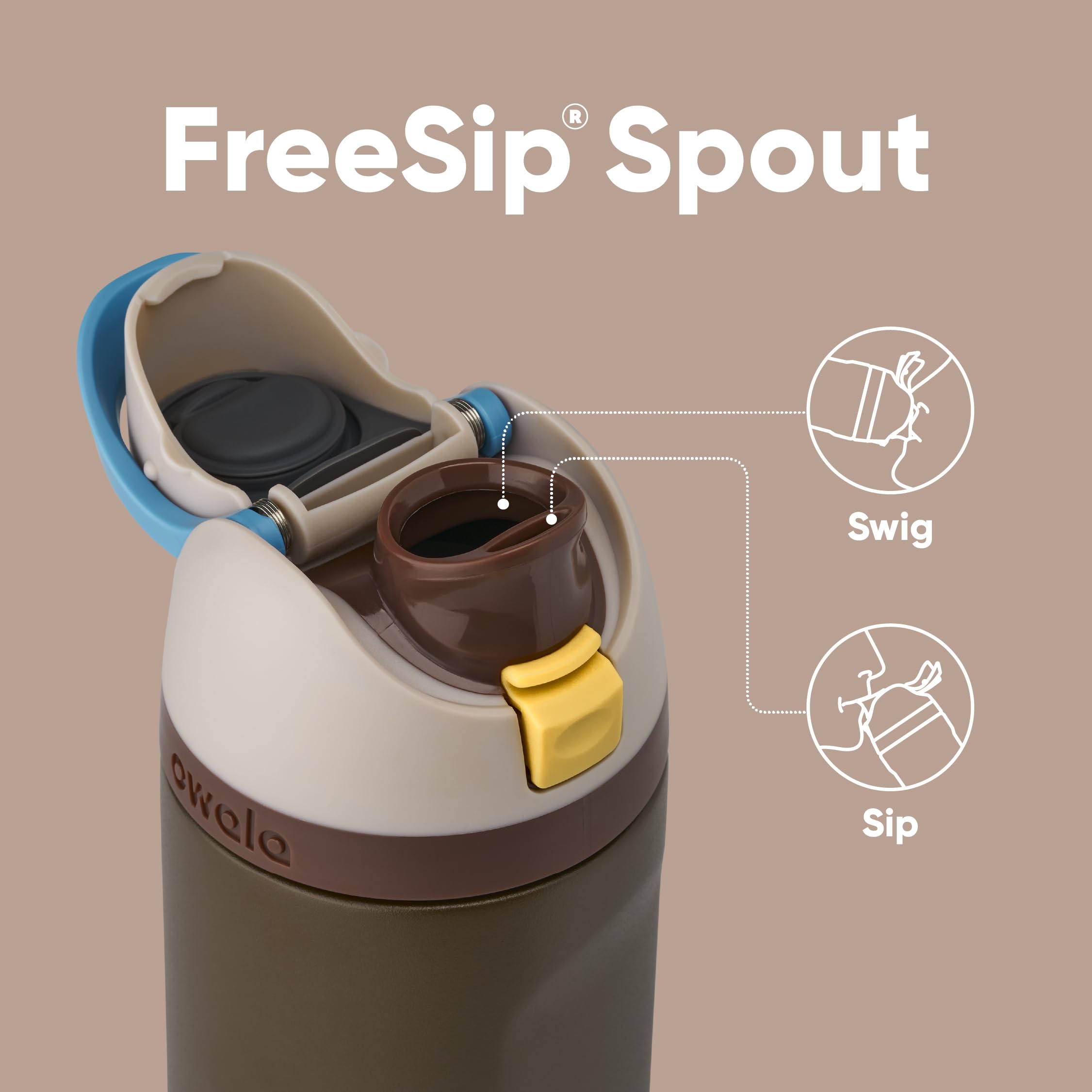 Patented FreeSip spout designed for either sipping upright through the built-in straw or tilting back to swig from the spout opening