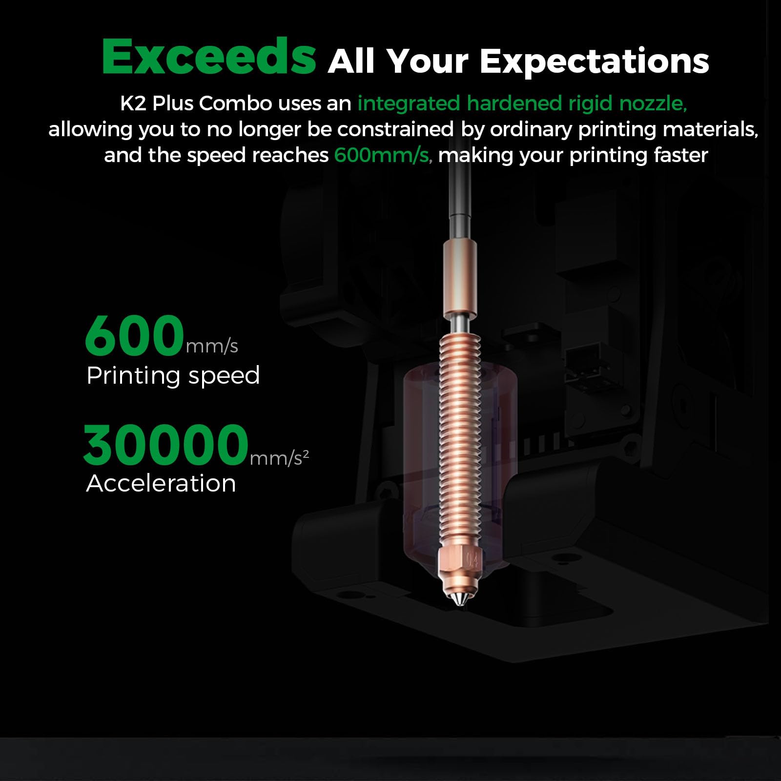 【Industrial Grade Speed and Accuracy】Driven with 600mm/s lightning printing and industry-leading 30,000mm/s² acceleration. The K2 Plus combination is equipped with a servo motor system and a 40mm³/s high flow heat terminal, which is 2-3 times faster than standard large printers