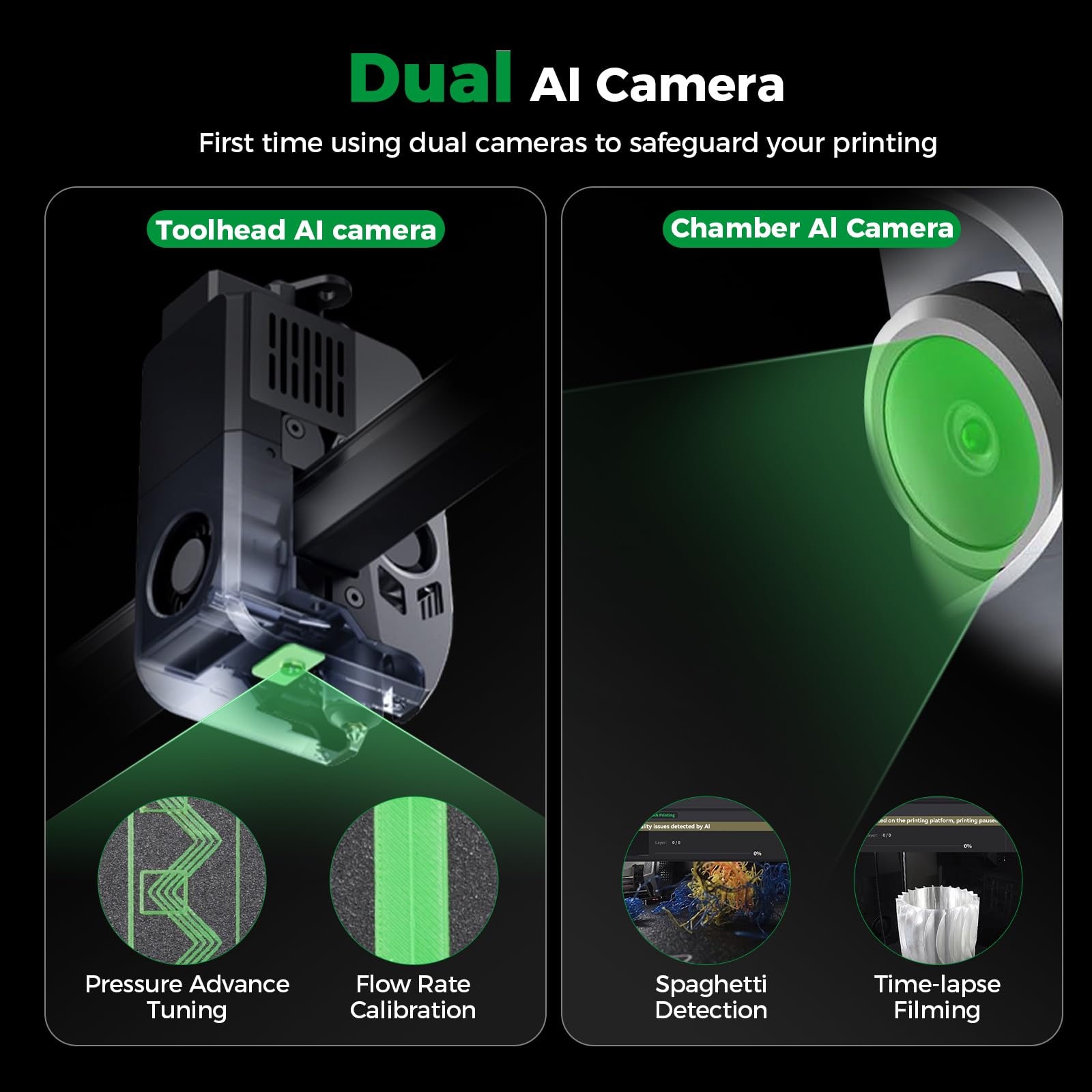 【Dual AI Camera Monitoring System】 K2 Plus uses AL camera indoors to observe pasta failures, foreign objects, idles, etc. It alerts you when an error occurs. It also supports real-time monitoring and time-lapse shooting