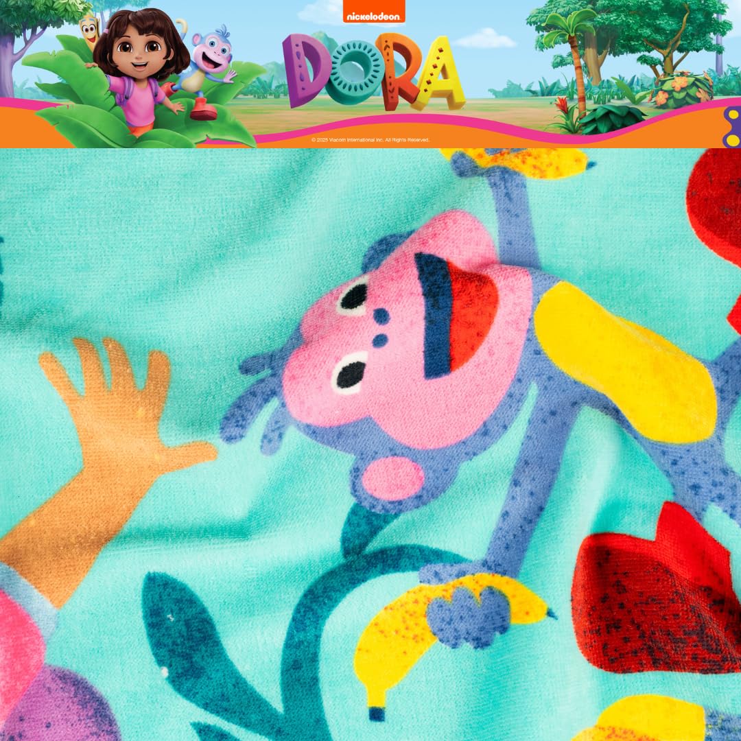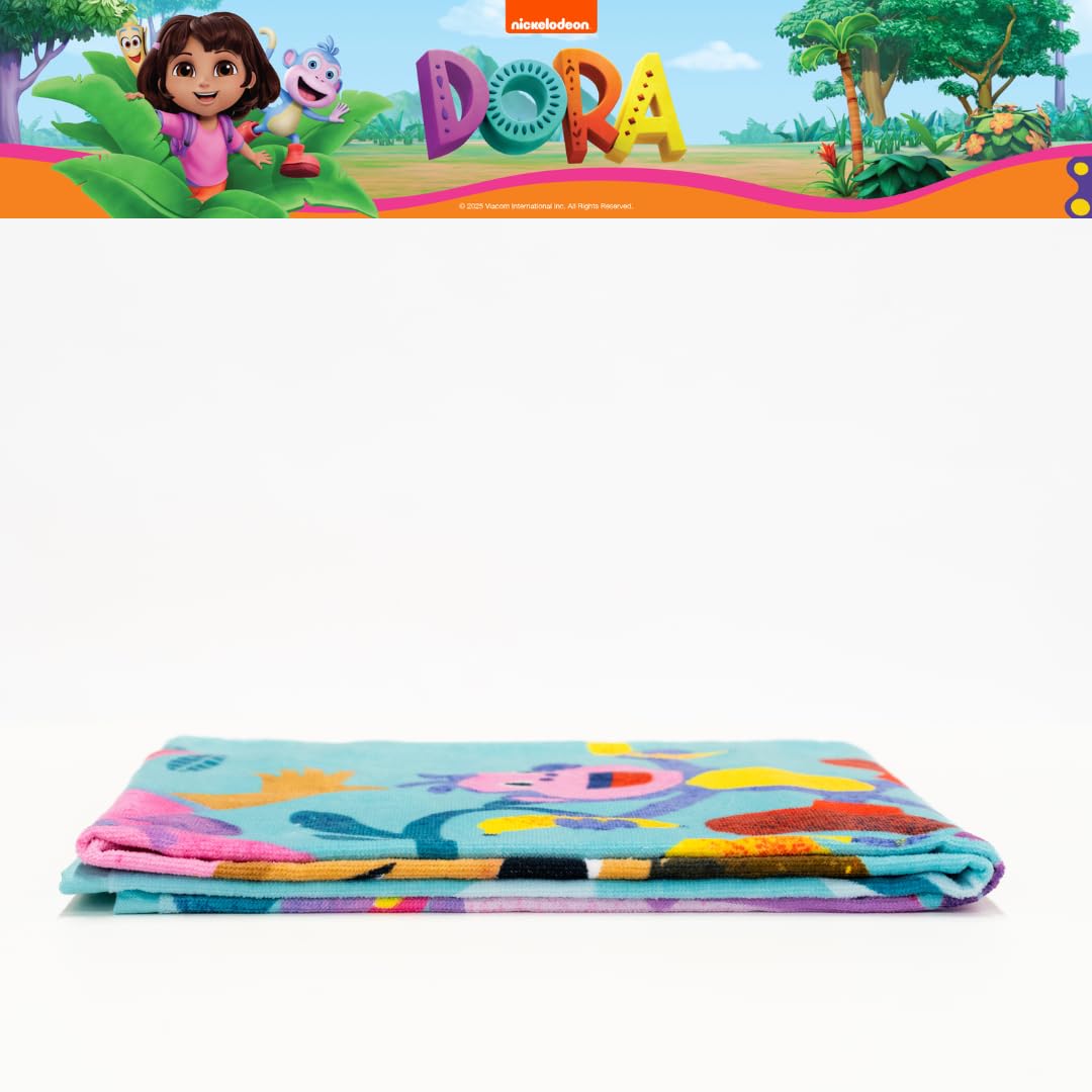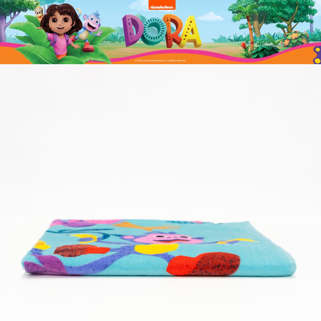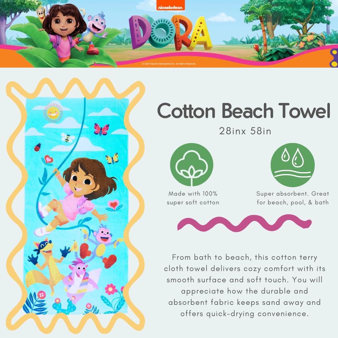 DORA THE EXPLORER DESIGN: Make a splash with Dora and friends on this vibrant 30x60 beach towel! Featuring Dora swinging through a colorful jungle scene with Boots, Swiper, and more, it’s the perfect companion for drying off or lounging in playful, adventurous style.