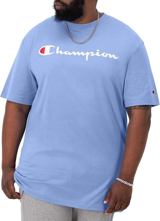 Description LAID-BACK, TO A TEE. Update your t-shirt rotation with this ultra-comfortable Big & Tall T-shirt for men. Crafted from a soft cotton or cotton blend, this casual-cool style delivers extra softness you'll appreciate. It features a crew neckline for classic styling, easy comfort, and can't-beat quality. You'll love the classic script spanning the chest and the iconic C logo patch on the sleeve - designed to represent your true brand pride. This crewneck comes in ton of colors, so pair it with your best Champion joggers or shorts for a simply iconic look.