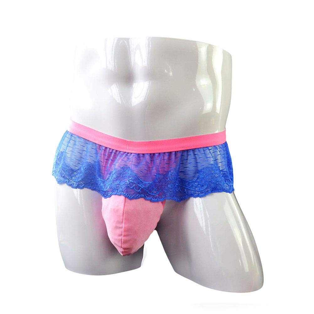 Male mens floral lace trim skirted sissy thong panties low rise bikini briefs underwear, girlie solid color bulge pouch design.