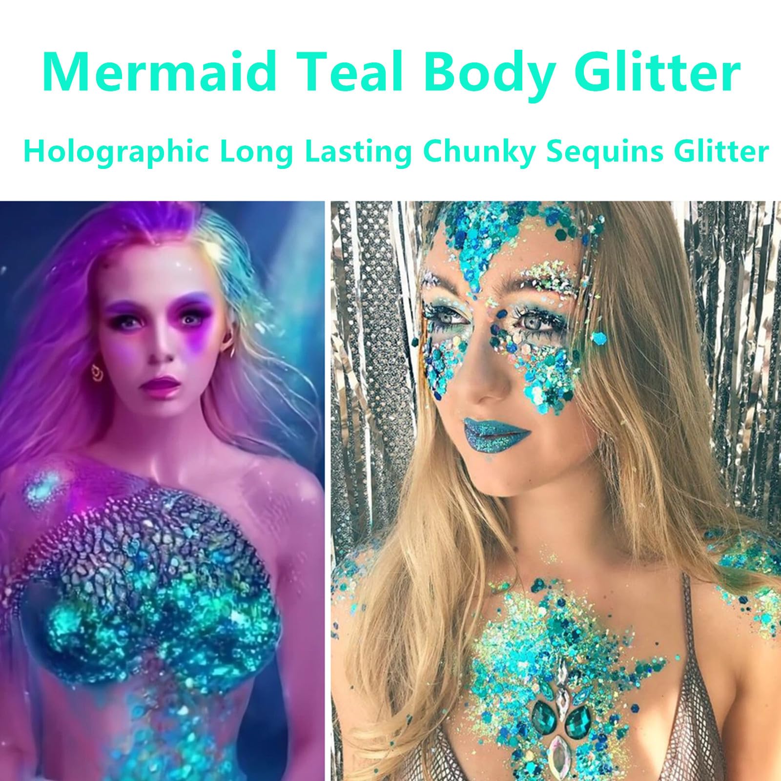 【Long Lasting Teal Face Body Glitter】Shine and durable teal holographic chunky glitter sequin gel,great for face,body,hair,eye,lip,nails glitter makeup and so on.You can easily use directly.It is self-adhesive sticky,non-sticky after dries,pretty for playing glitter dress up and body glitter paint .Unique safe material formula,it was long lasting like new after lots of sweat.