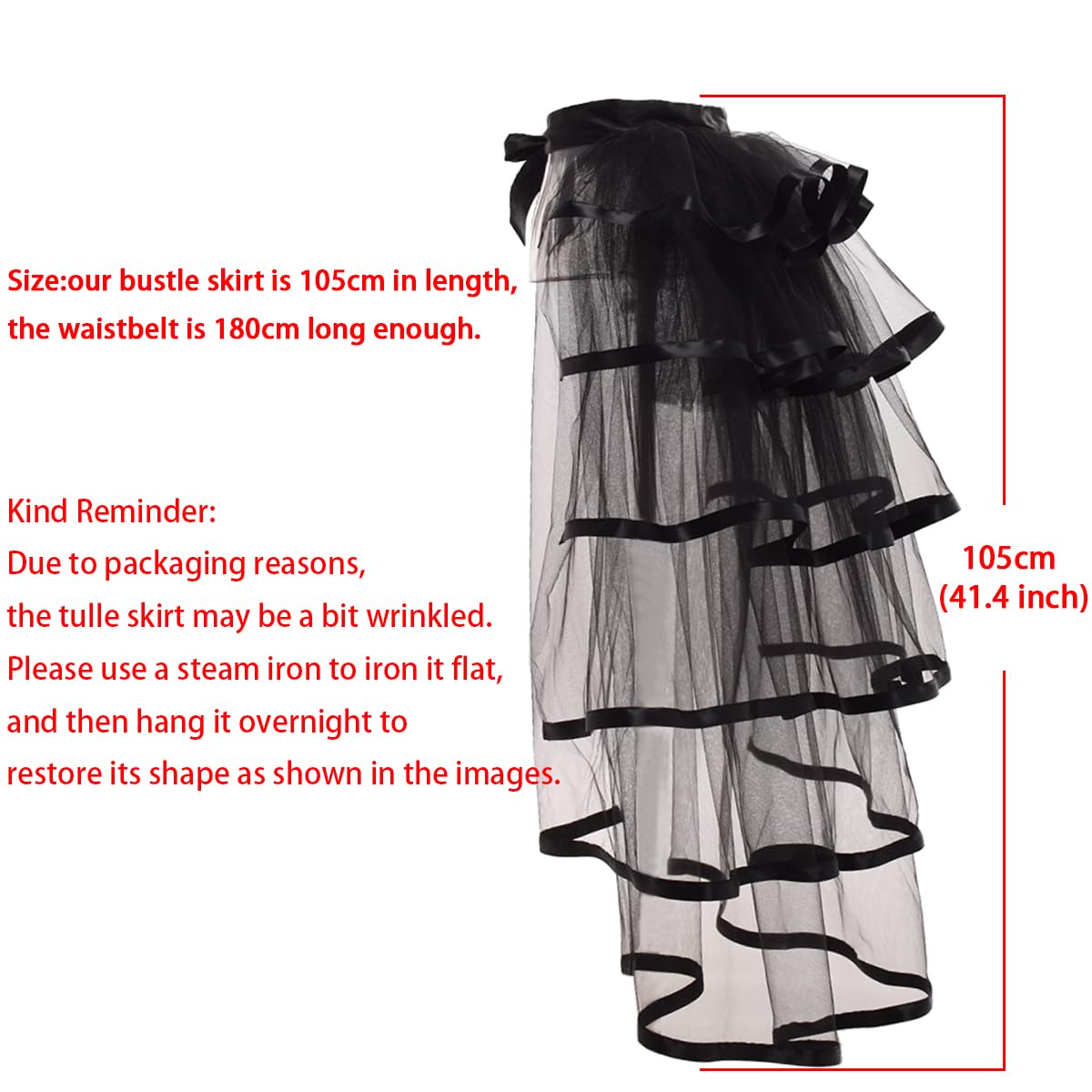 Size:our bustle skirt is 105cm in length; the waistbelt is 180cm in length (include the ribbon), and wide enough to cover your hip