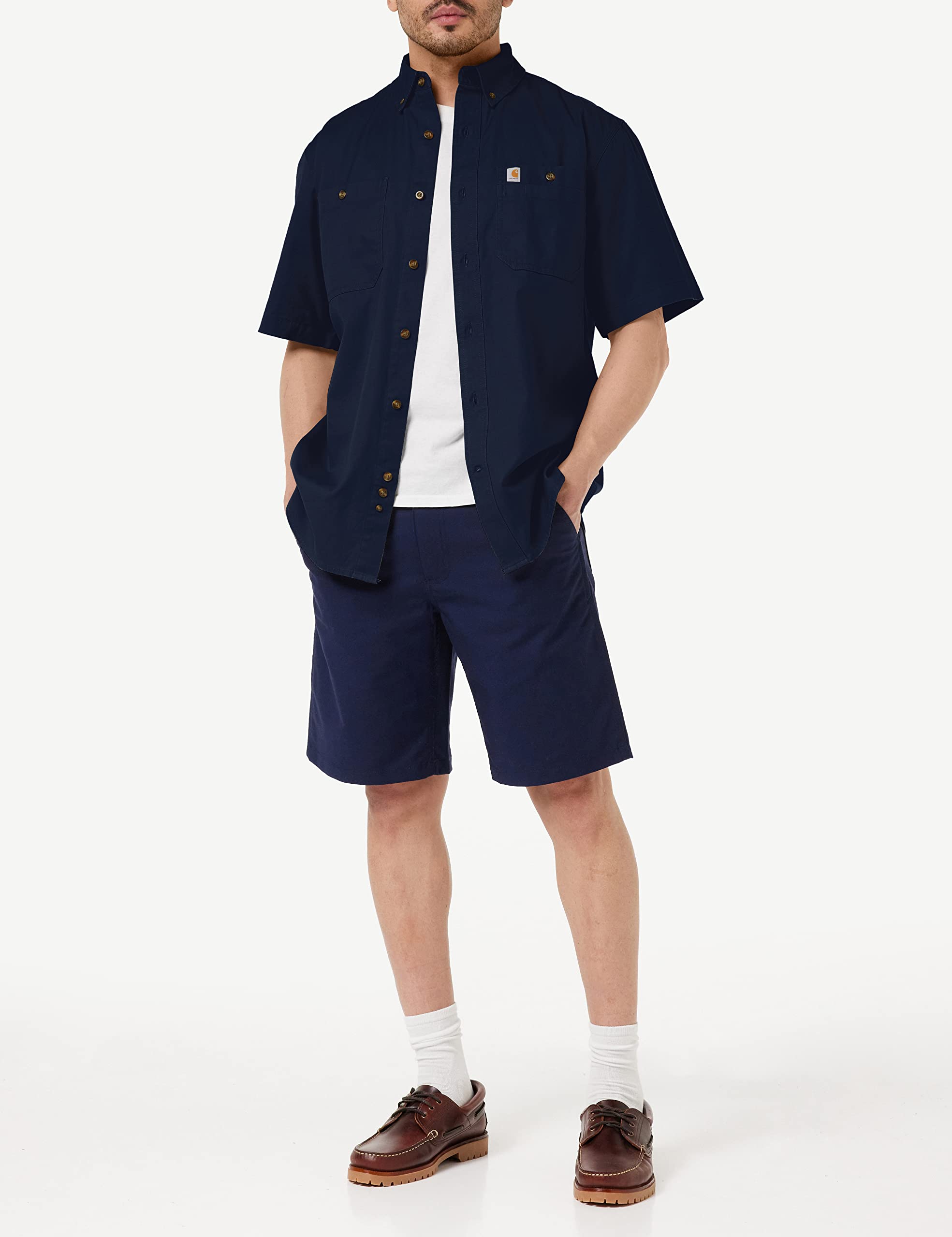 Description This durable short-sleeve work shirt comes standard with built-in stretch, so whatever you're doing, it's easier to do. Relaxed fit 6.5-Ounce, 98% cotton/2% Spandex rugged flex technology for ease of movement two chest pockets with additional left-chest pocket panel for added storage button-down collar two-button adjustable cuffs with extended plackets faux horn buttons drop-tail hem for additional coverage Carhartt-strong triple-stitched main seams imported
