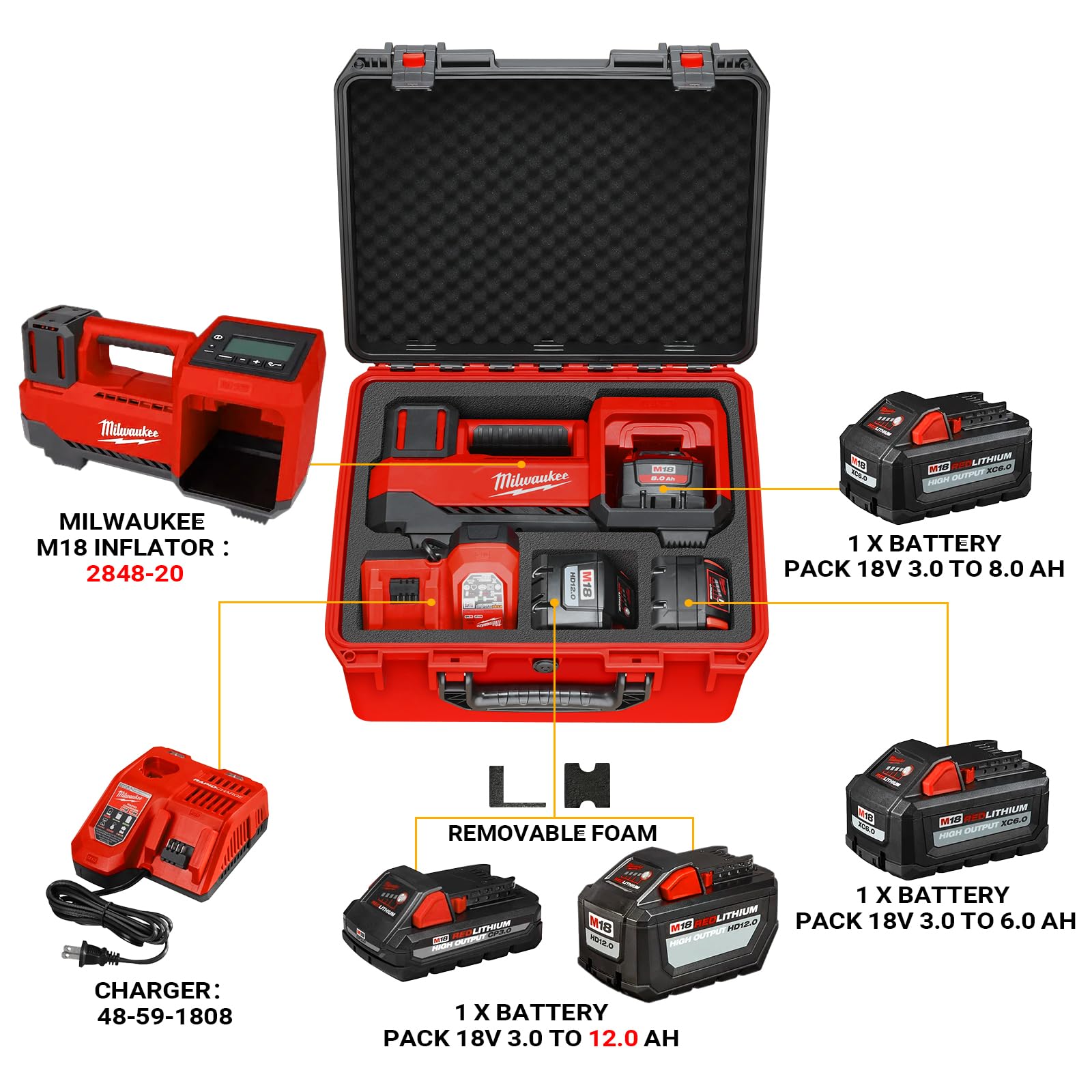 [Custom-Fit for Milwaukee M18 Inflator]: Designed specifically for Milwaukee inflator 2848-20, this case features custom foam inserts to securely hold your tire inflator portable air compressor and all related tools. Weatherproof case protects for Milwaukee M18 air compressor (2848-20) and accessories on construction sites - heavy-duty design withstands jobsite drops
