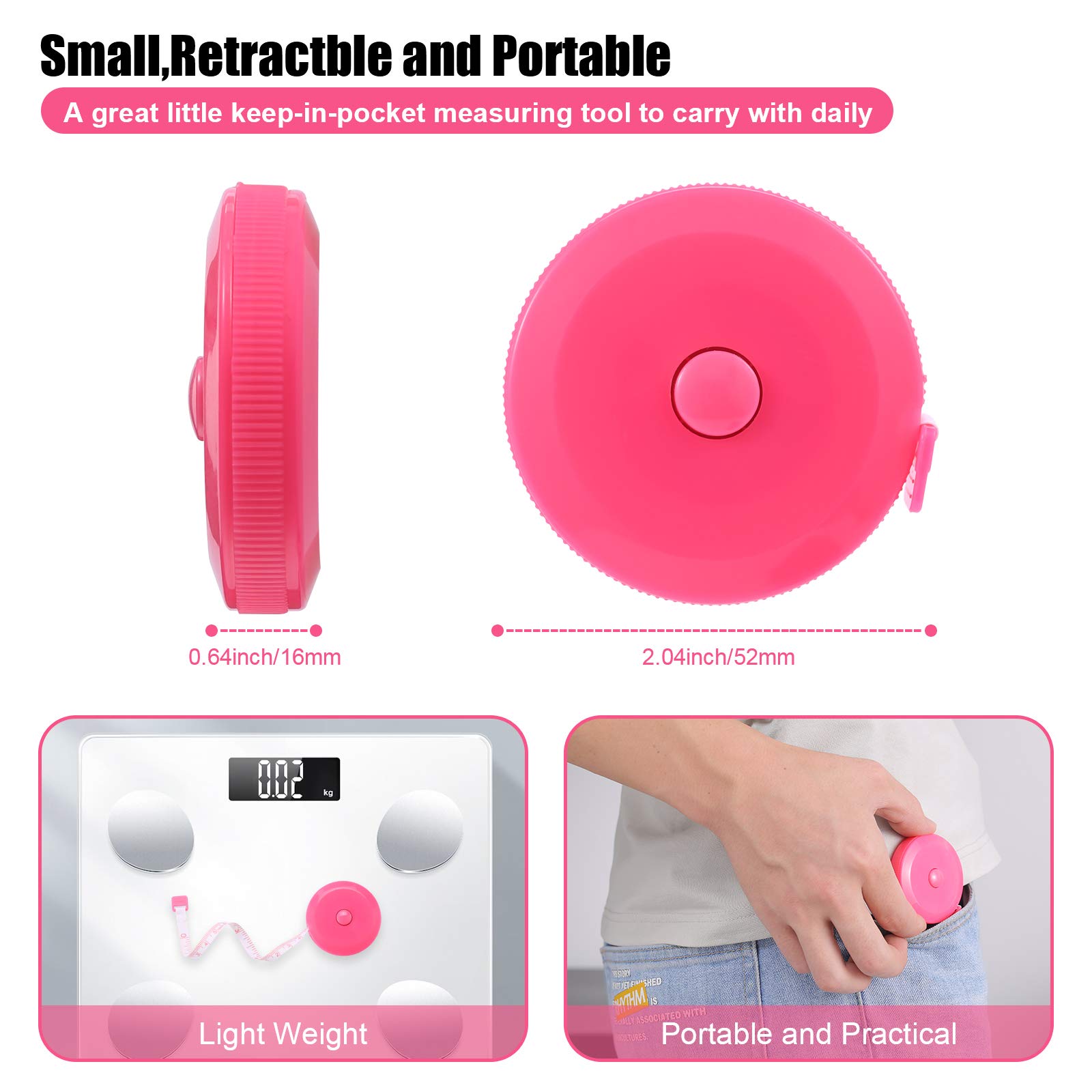 【Portable, Easy to Carry & Storage】- You can put it in purse or pocket, the plastic tape is small and won’t occupy any space. It can be used to measure clothes, your height, check up the waistline when you on a diet, record the head circumference of babies, your body measures etc.