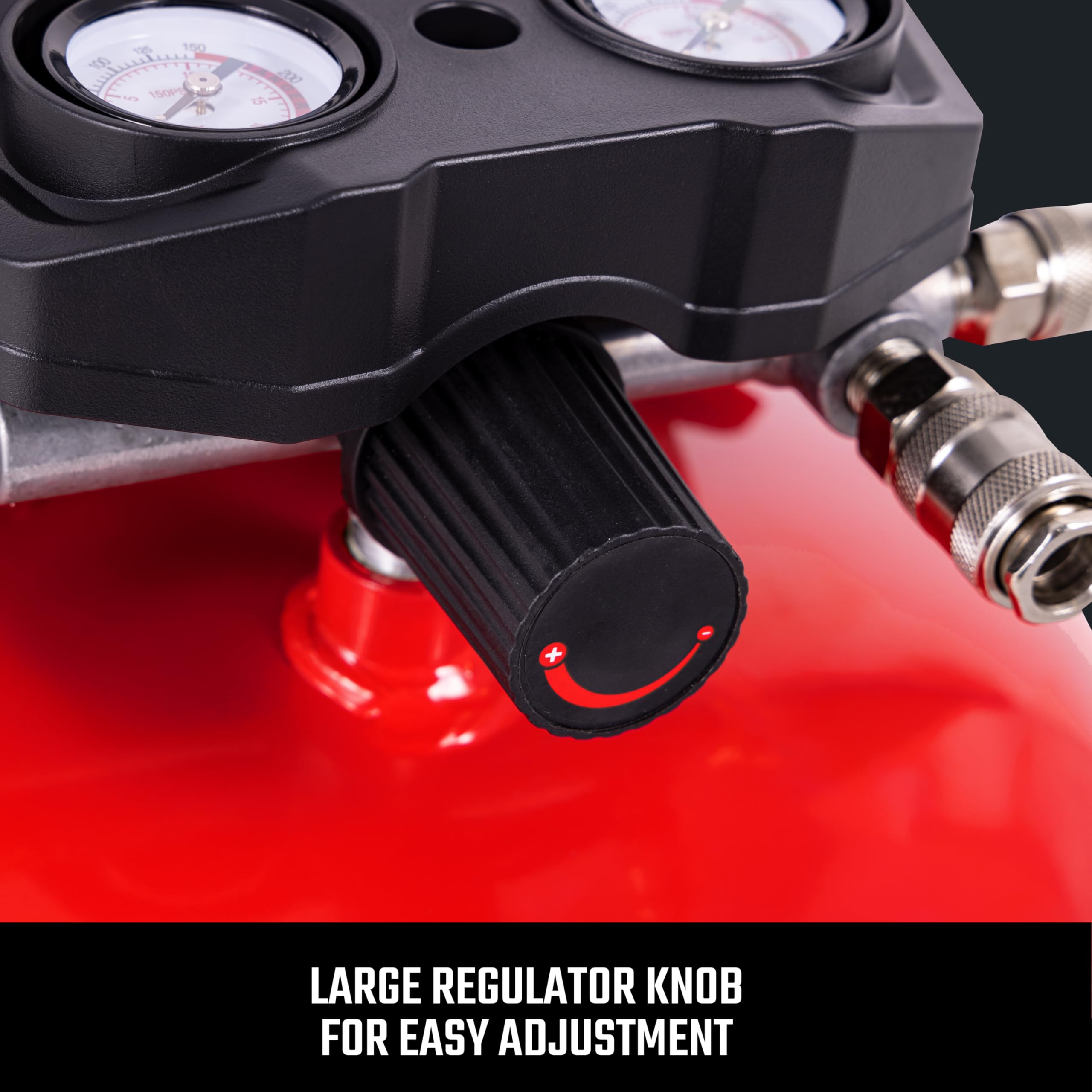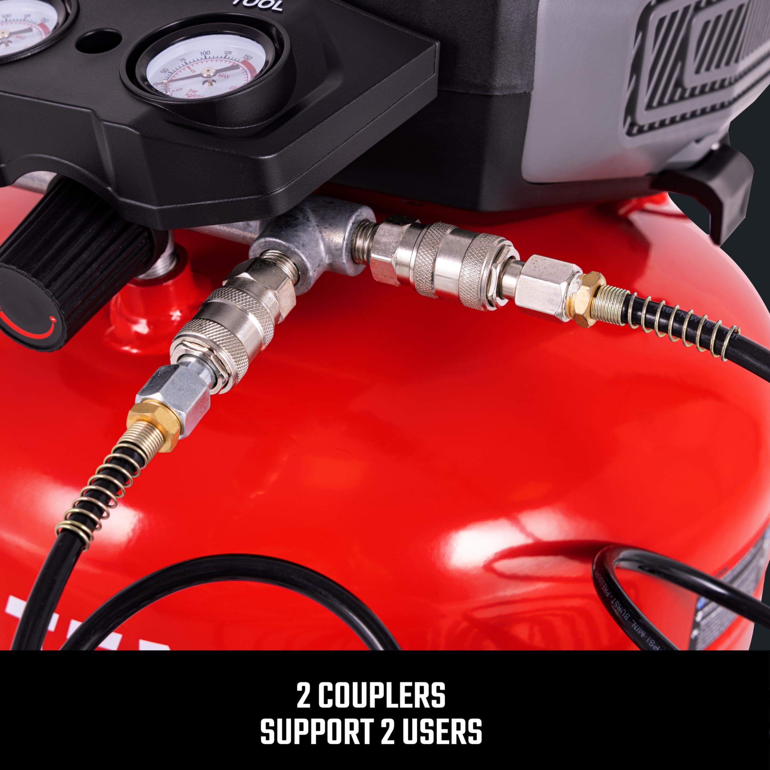 STRONG PERFORMANCE & EFFICIENCY: Oil-free, low-voltage start motor delivers 150 PSI max pressure and 2.6 SCFM at 90 PSI, powering multiple air tools at once with dual quick couplers