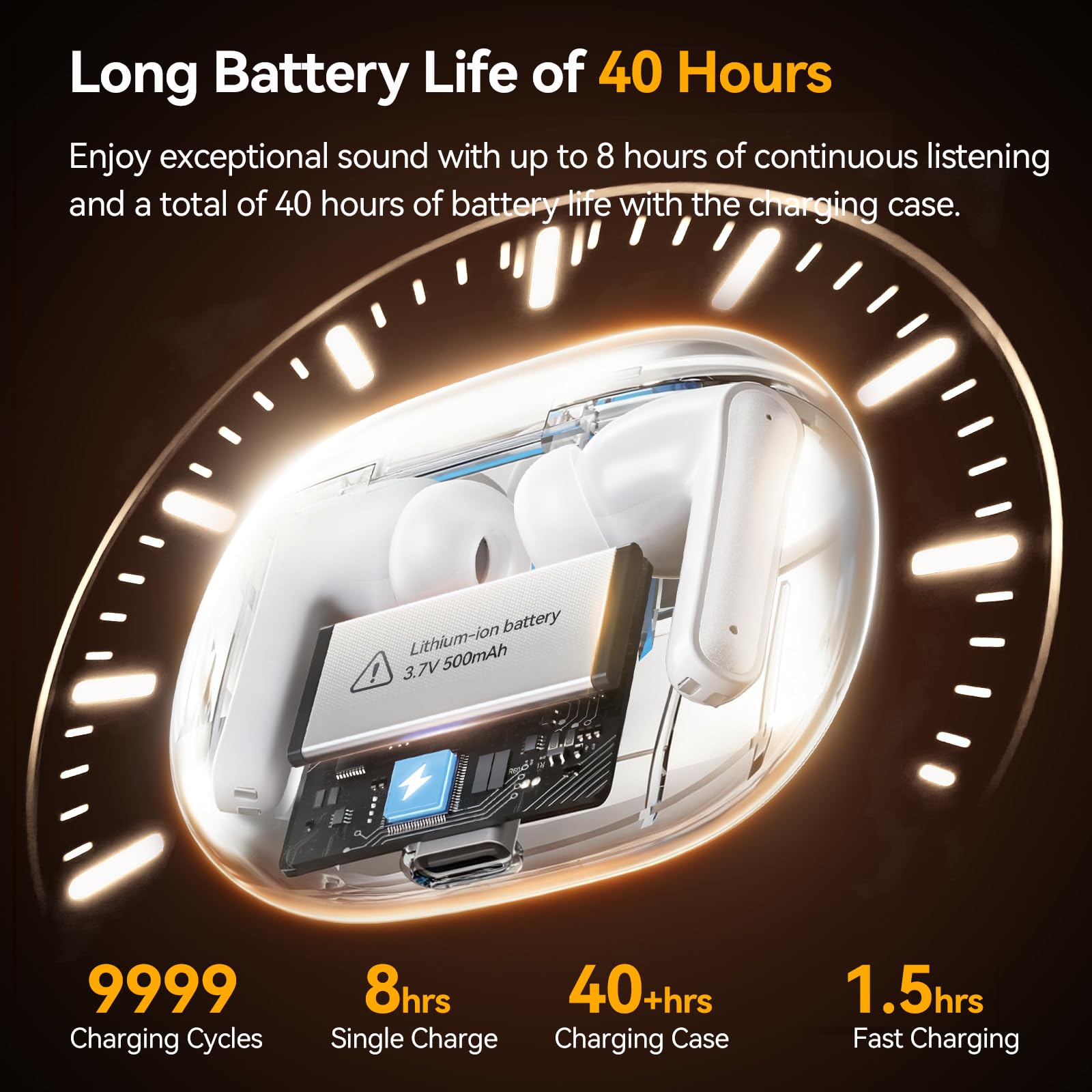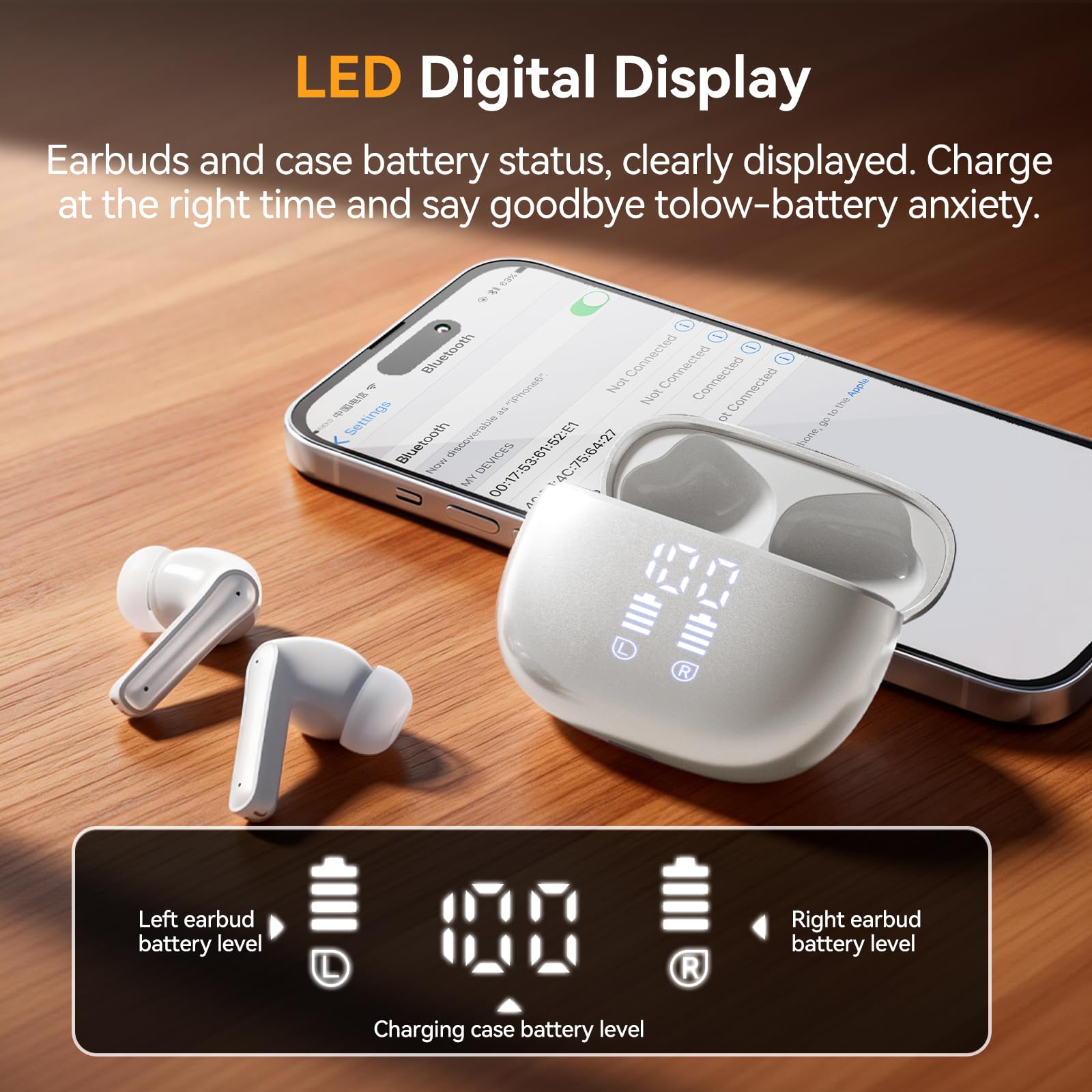 Dual LED Display, 40H Long Playtime: Keep the tunes flowing for an incredible 8 hours per charge, plus 32 additional hours from the sleek charging case. A mere 10-minute charge injects 1.5 hours of audio bliss into your day, ensuring your soundtrack continues with barely a pause.
