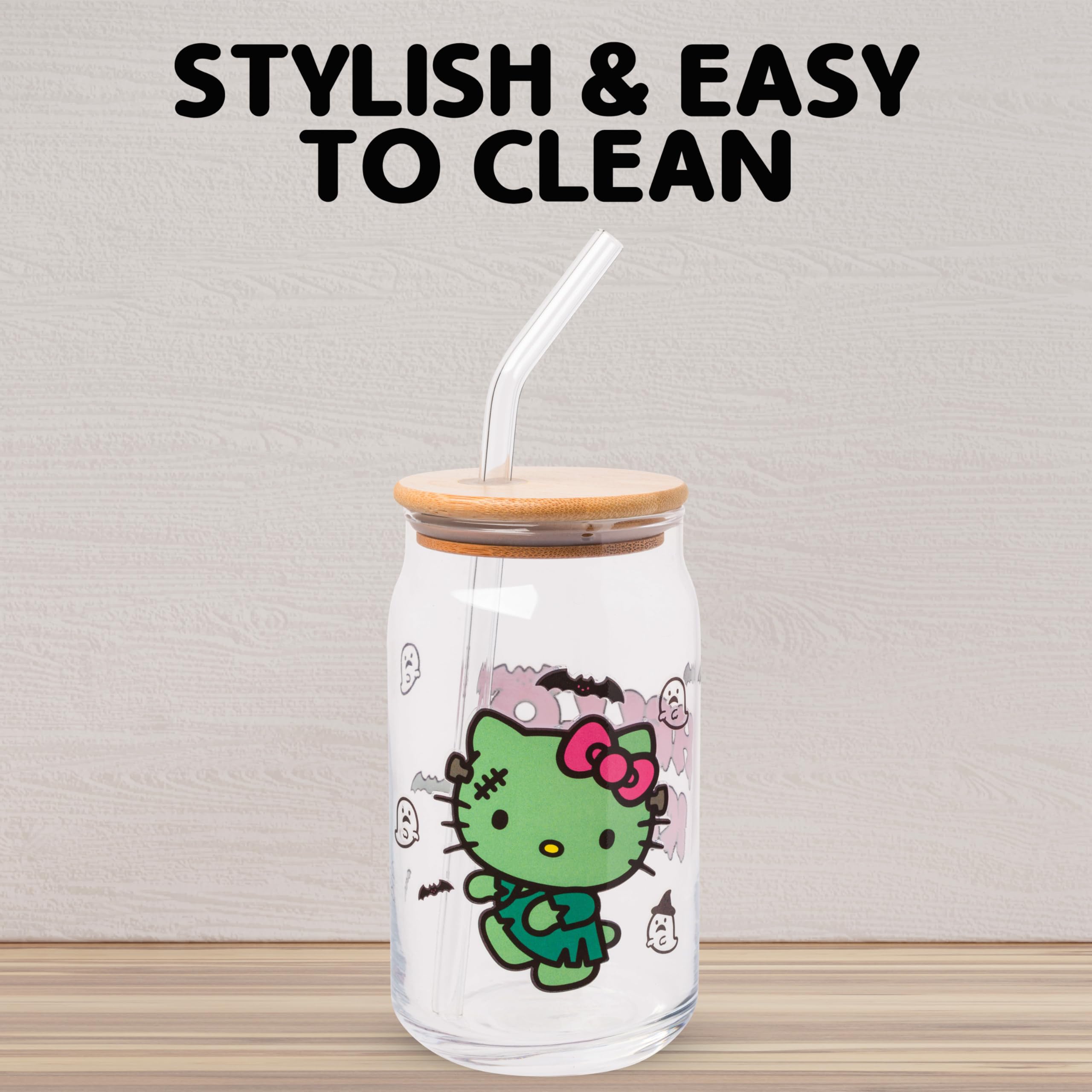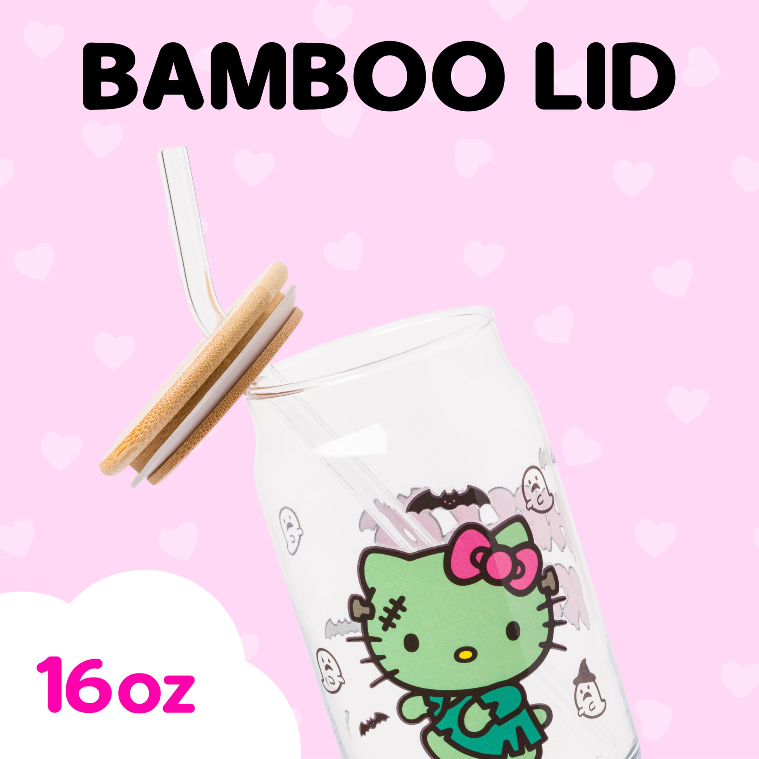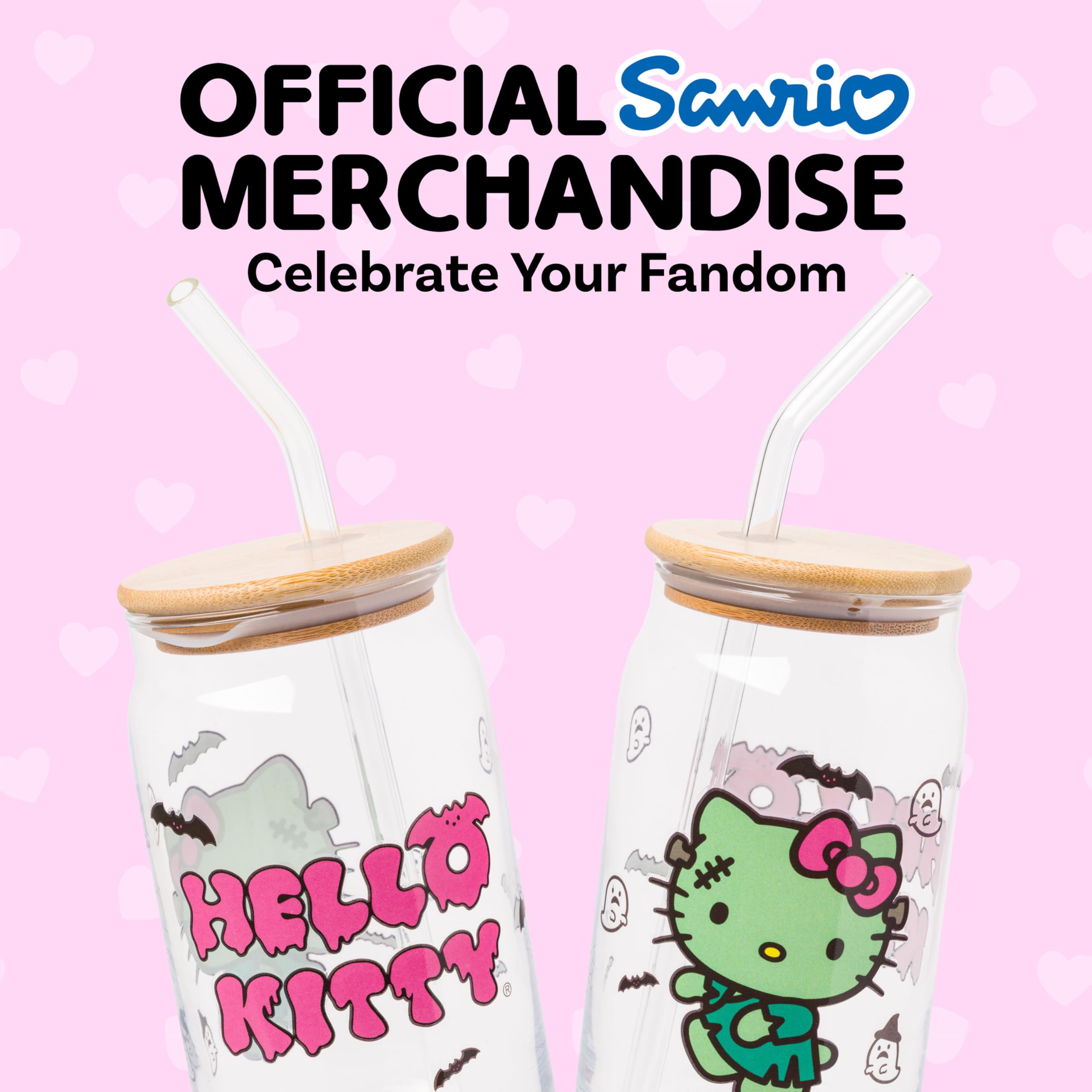 Trick or treat with Hello Kitty! This glass tumbler boasts a two sided design. The front features Hello Kitty, dressed as Frankenstein, surrounded by bats and ghosts. Written on the back is “Hello Kitty” in a pink spooky font. Glass tumbler is complete with a bamboo lid and glass straw, promoting eco-conscious living. Perfect for life on the go, this glass tumbler holds up to 16 ounces of your favorite beverage and comes with a secure bamboo lid to ensure mess-free hydration wherever you wander. Especially ideal for car use, sporting events, and picnics! HAND WASH ONLY, NOT microwave safe. This glass tumbler makes the sweetest Halloween treat for your favorite Hello Kitty fan. Perfect for enjoying your favorite drink or as a collectors item. Take a dive into the fictional world with Silver Buffalo! Silver Buffalo provides fans with official merchandise from their favorite characters. Working alongside licensors and brands, we create unique and imaginative products which are designed with great care and detail. Silver Buffalo aims to connect fans to their favorite cartoon characters, superheroes, movies, tv-series, and more. Celebrate your fandom!