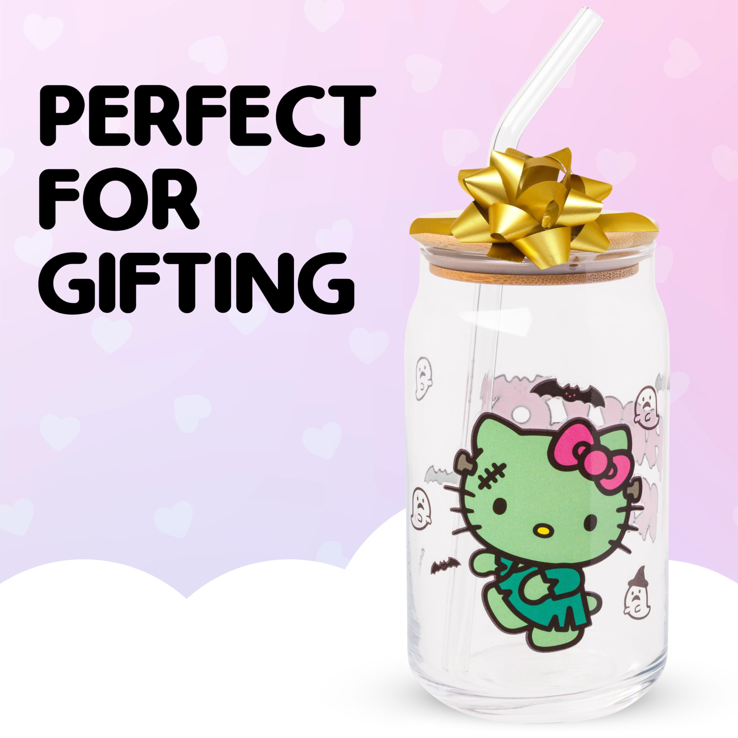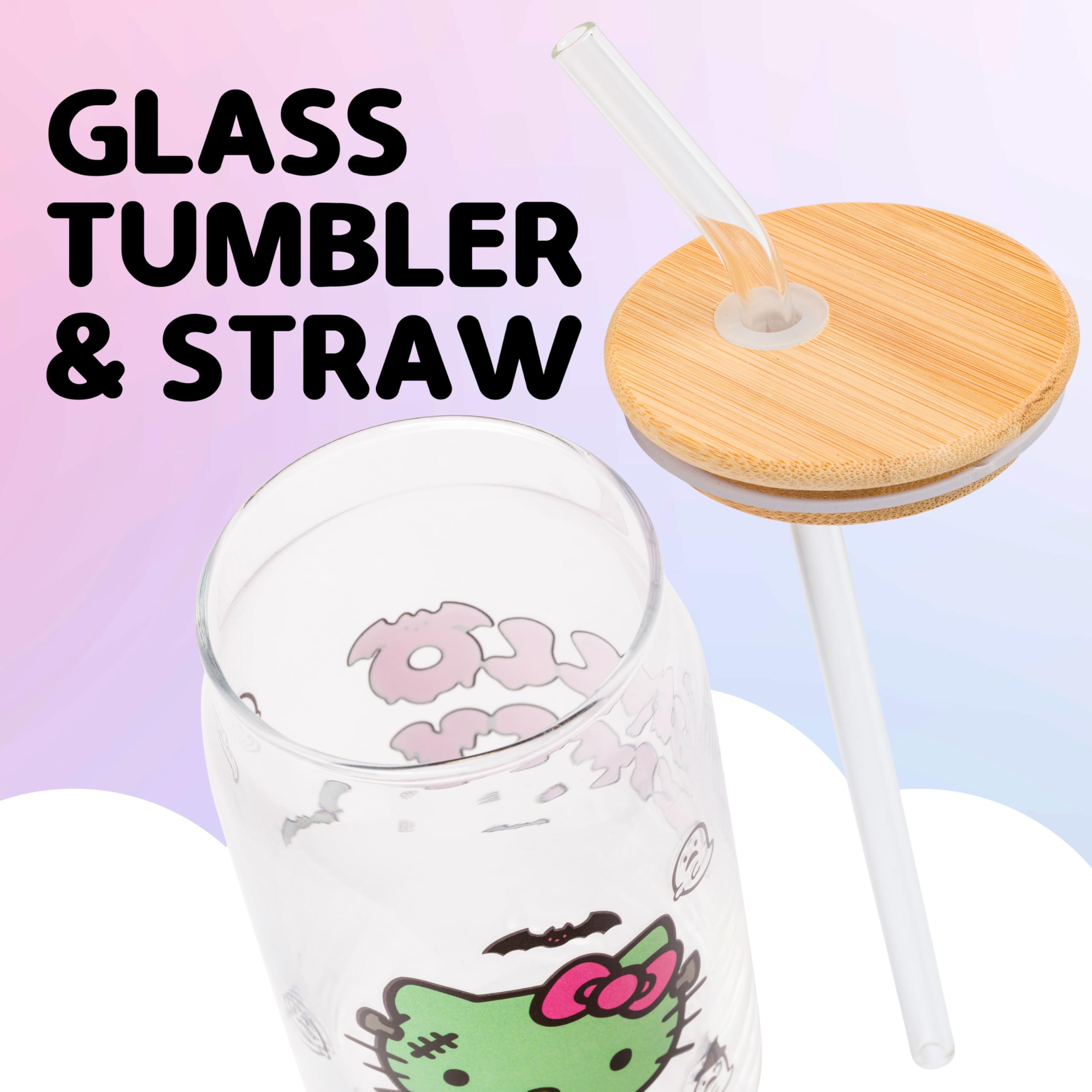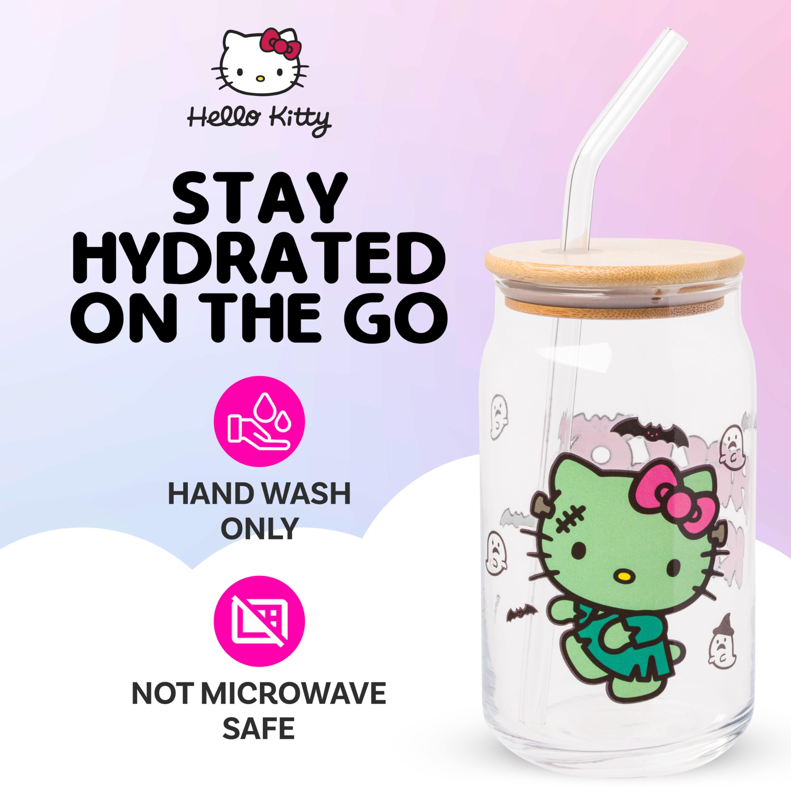 Trick or treat with Hello Kitty! This glass tumbler boasts a two sided design. The front features Hello Kitty, dressed as Frankenstein, surrounded by bats and ghosts. Written on the back is “Hello Kitty” in a pink spooky font. Glass tumbler is complete with a bamboo lid and glass straw, promoting eco-conscious living. Perfect for life on the go, this glass tumbler holds up to 16 ounces of your favorite beverage and comes with a secure bamboo lid to ensure mess-free hydration wherever you wander. Especially ideal for car use, sporting events, and picnics! HAND WASH ONLY, NOT microwave safe. This glass tumbler makes the sweetest Halloween treat for your favorite Hello Kitty fan. Perfect for enjoying your favorite drink or as a collectors item. Take a dive into the fictional world with Silver Buffalo! Silver Buffalo provides fans with official merchandise from their favorite characters. Working alongside licensors and brands, we create unique and imaginative products which are designed with great care and detail. Silver Buffalo aims to connect fans to their favorite cartoon characters, superheroes, movies, tv-series, and more. Celebrate your fandom!