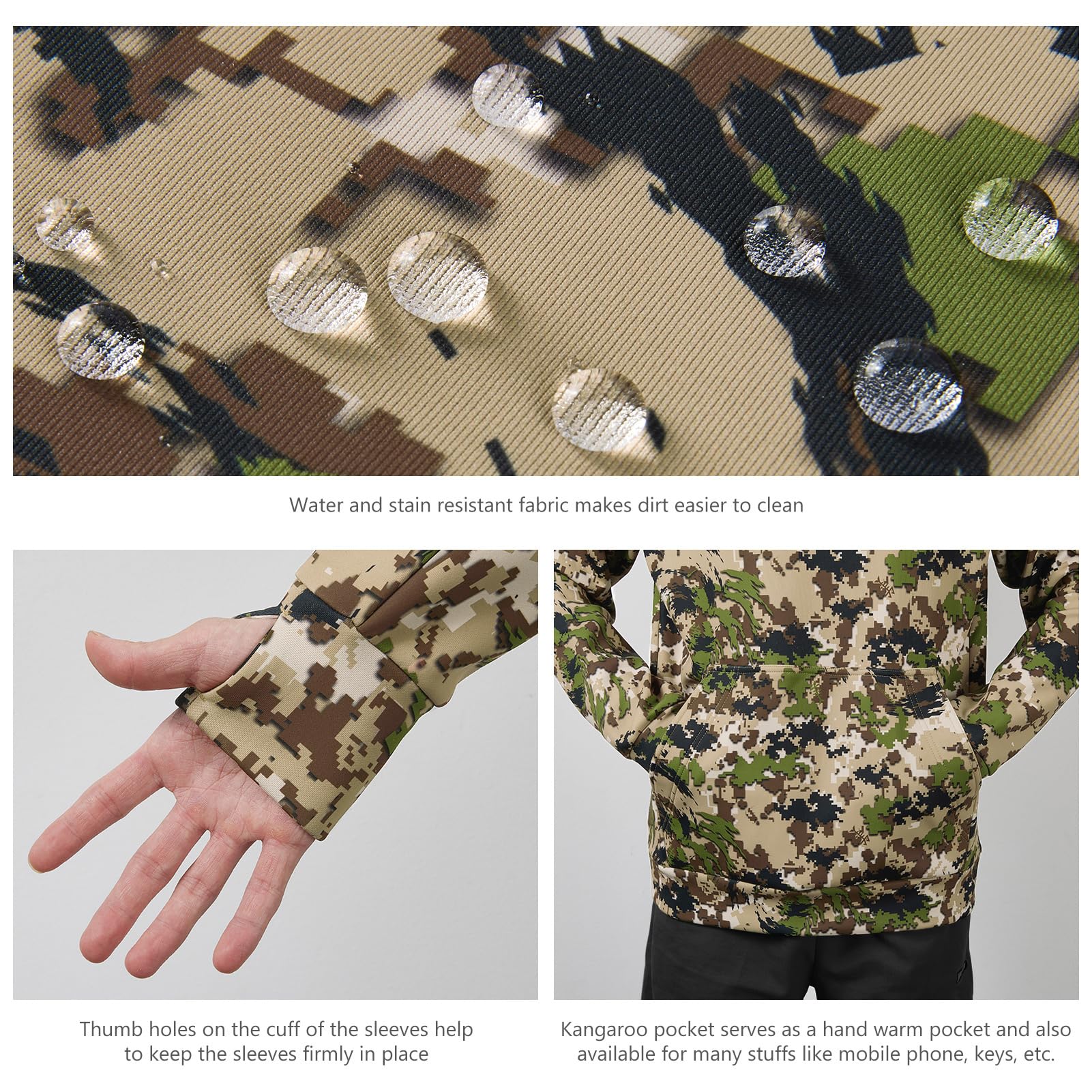 Water and stain resistant treatment makes dirt easier to clean as well as making the sweatshirt a nice gear for fishing on cool rainy days; Advanced pill-resistant and anti-static fabric with high-stitch density for durability; Stretchy elastic fabric for free movement; Soft fleeced lining provides extra warmth