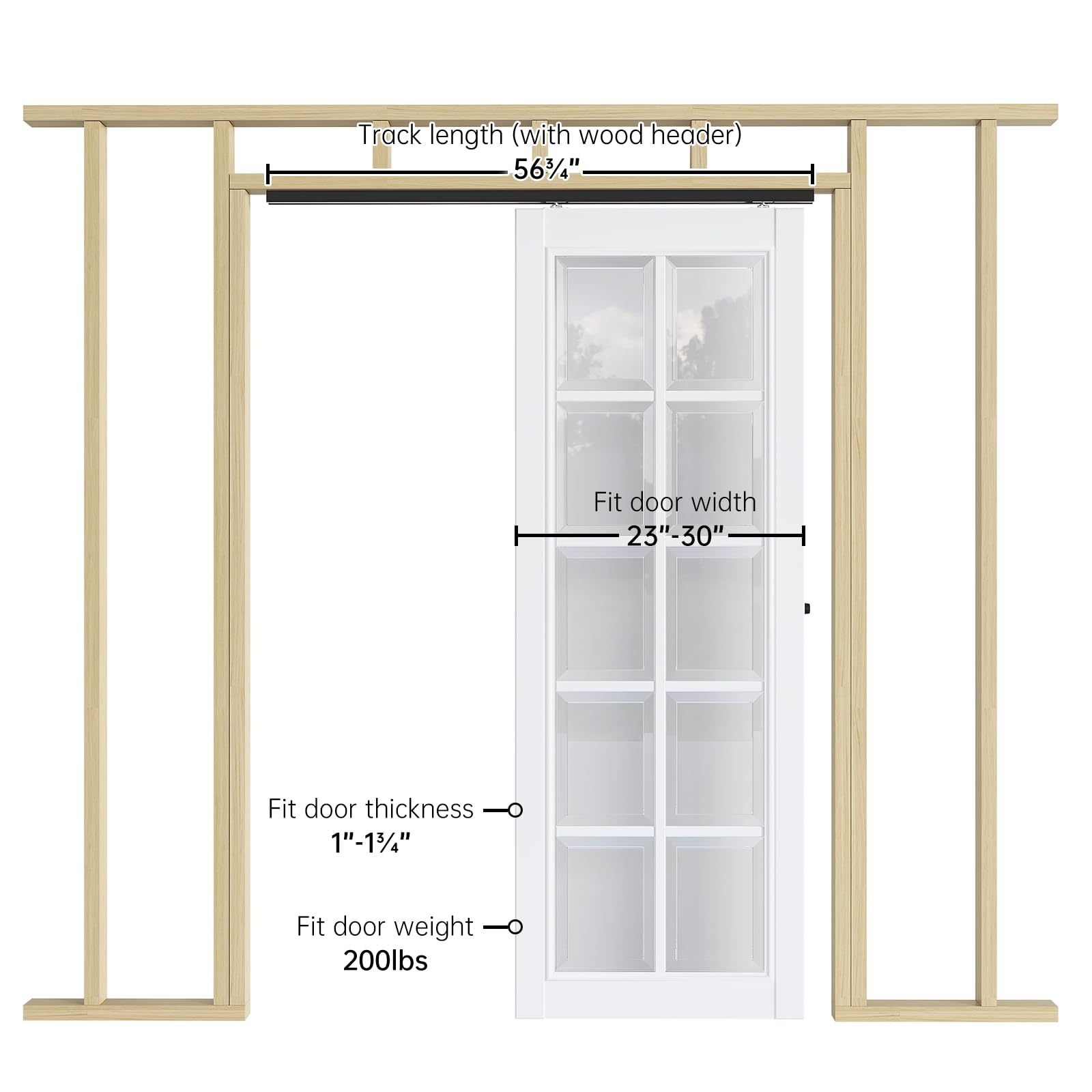 Reminds: Fit door width 23"~30";Fit door thickness 1" ~ 1-3/4"(25mm~45mm);Door weight capacity: 200lbs. Package Includes:(1)56.5" rail,(2)rollers,(1)door stops,(2)floor guide. Track Width: 45mm. DOOR NOT INCLUDED