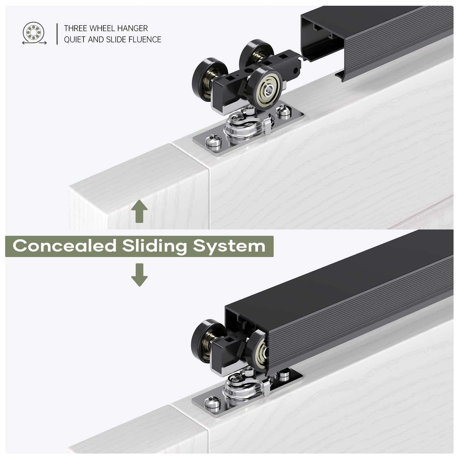 Slide Like Butter: Pocket door kit - Ball bearing three wheel roller slide smoothly and quietly, tested beyond 100,000 rolls. The quick-release locking tab makes it easy to install or remove the door without the need to run the door panel off the rail