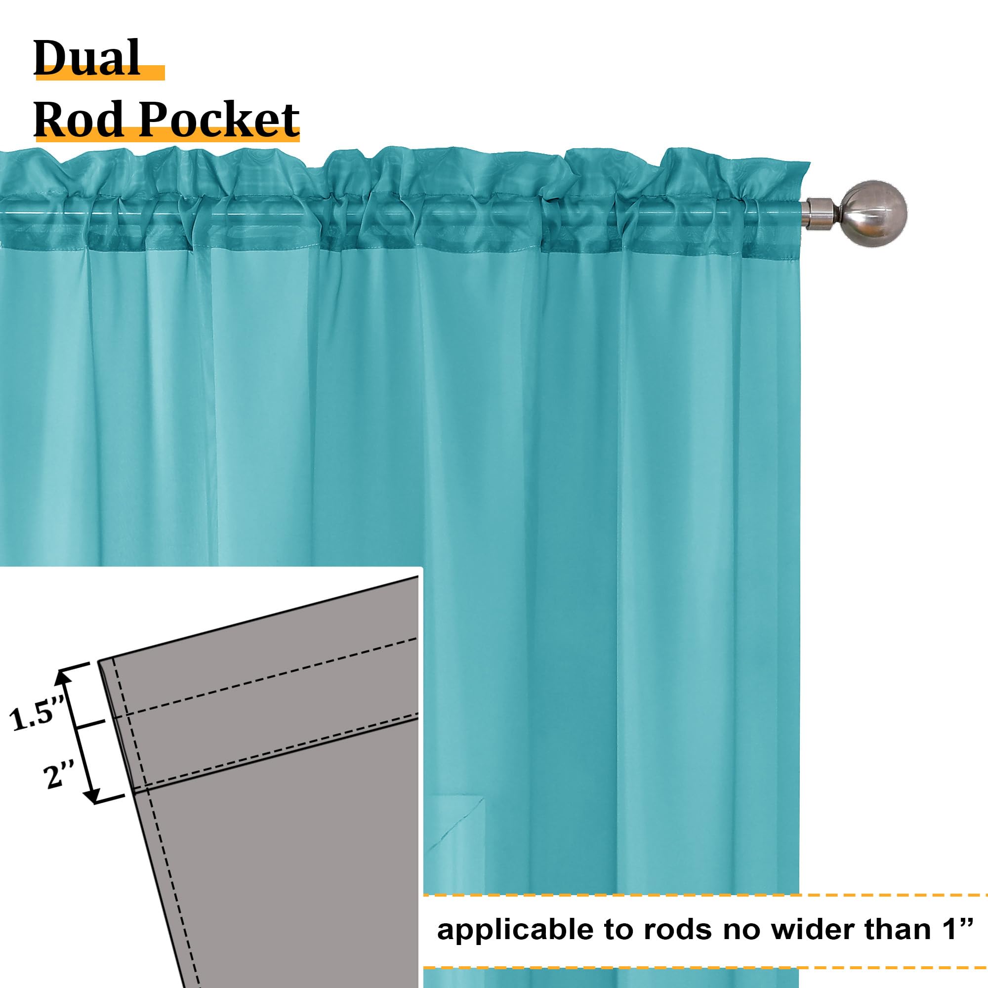 Package and Specification: Each package contains 2 sheer turquoise curtains for bedroom, each 42" wide and 96" long, total width is 84". The top double rod pockets are between 1.5"-2" in size, suitable for curtain rods of most windows, which make curtains easier to hang or slide, feels great to use.