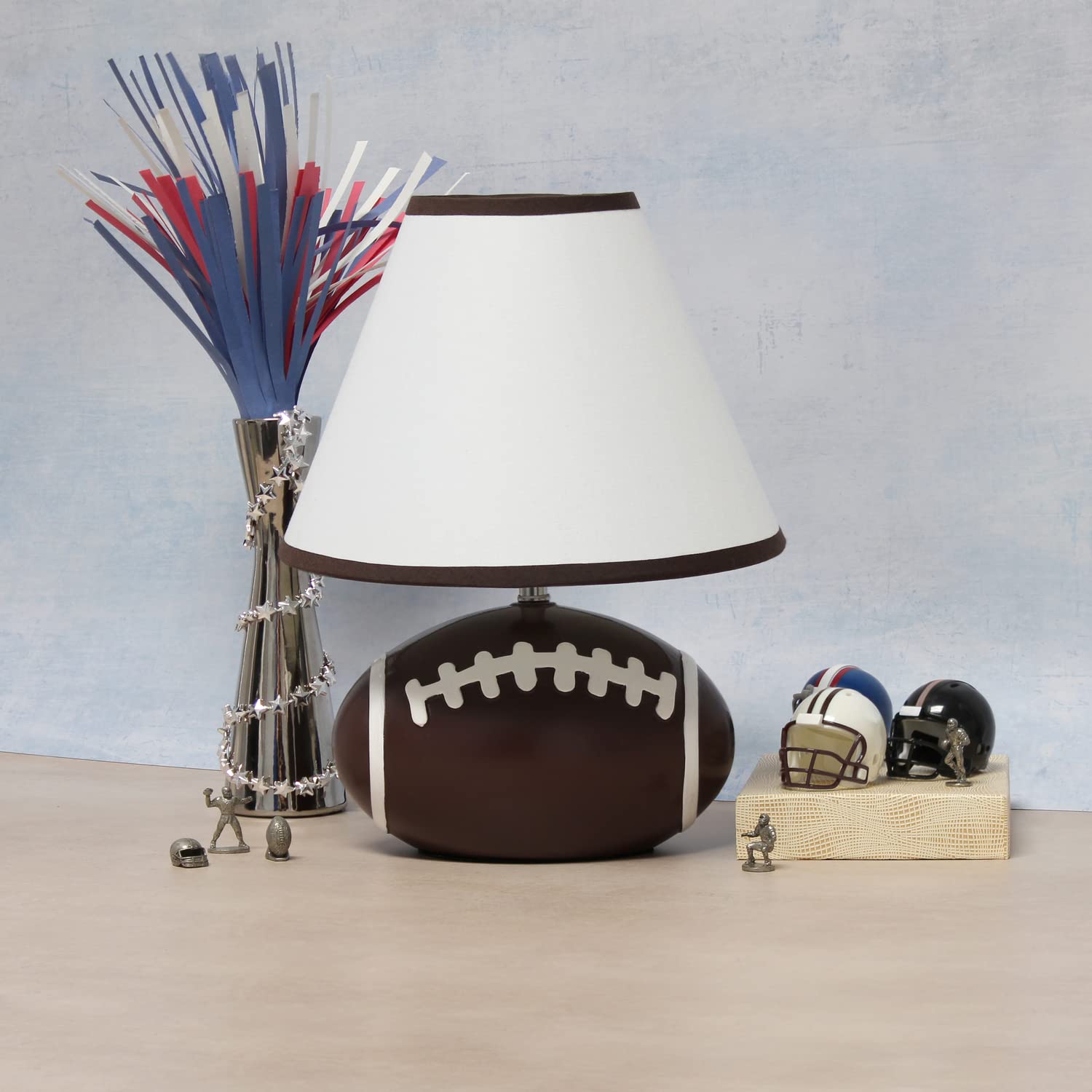 FUN SPORTS STYLED LAMP: A neutral lamp to accommodate all football teams' décor, memorabilia spaces, man cave rooms, and more! This lamp features a realistic football shaped base with a matching brown trim and white fabric shade.