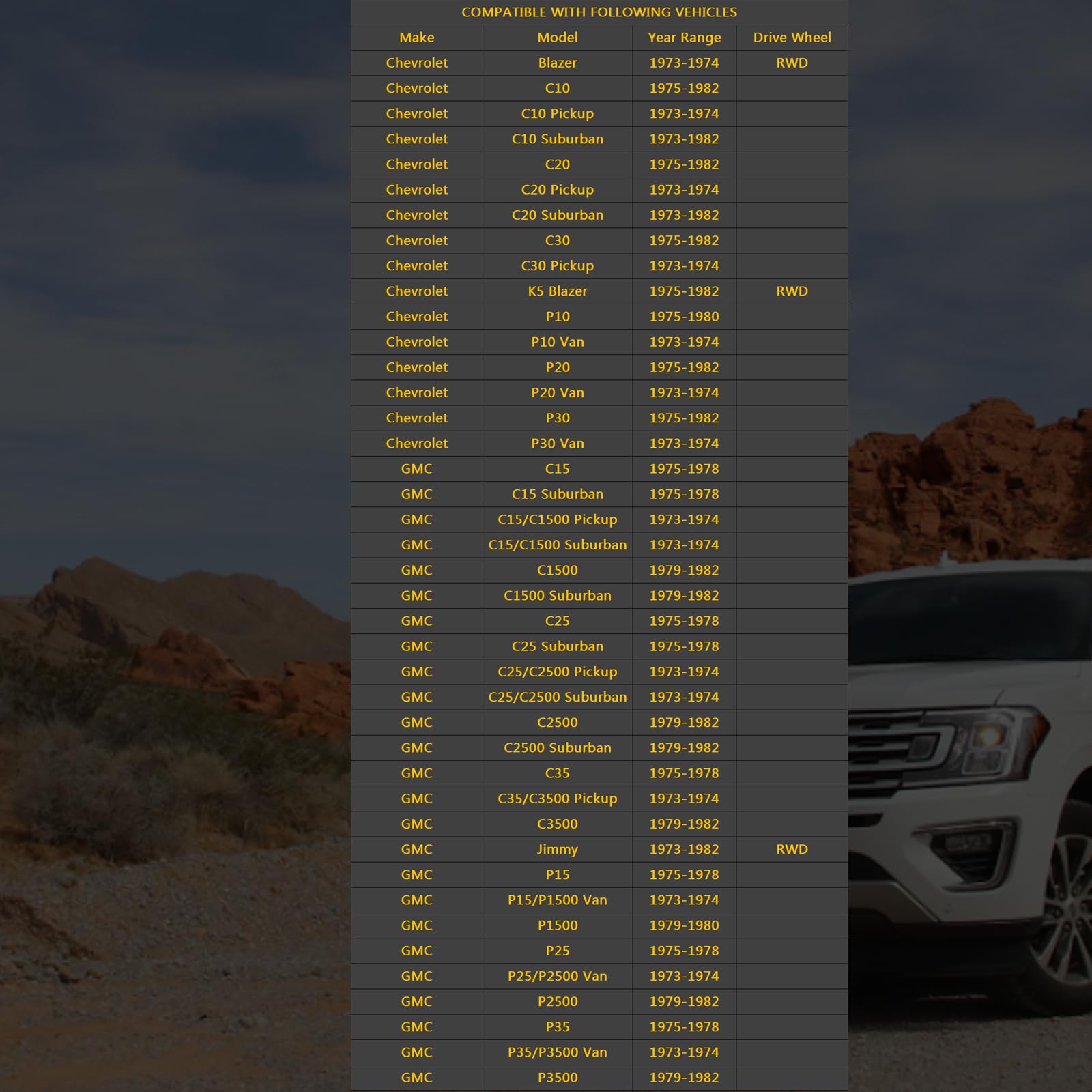 Compatible With: Idler arm and pitman arm fit for Chevrolet C10/C20/C30/P20/P30 1975-1982, C10 Pickup/C20 Pickup/C30 Pickup/P10 Van/P20 Van/P30 Van 1973-1974, C10 Suburban/C20 Suburban 1973-1982, K150 Blazer 1975-1985 RWD, Blazer 1973-1974 FWD, P10 1975-1980; fit for GMC C15/C15 Suburban/C25/C25 Suburban/P15/P25/P35 1975-1978, C1500/C1500 Suburban/C2500/C2500 Suburban/C3500/P3500 1979-1982, Jimmy 1973-1982 RWD and so on.