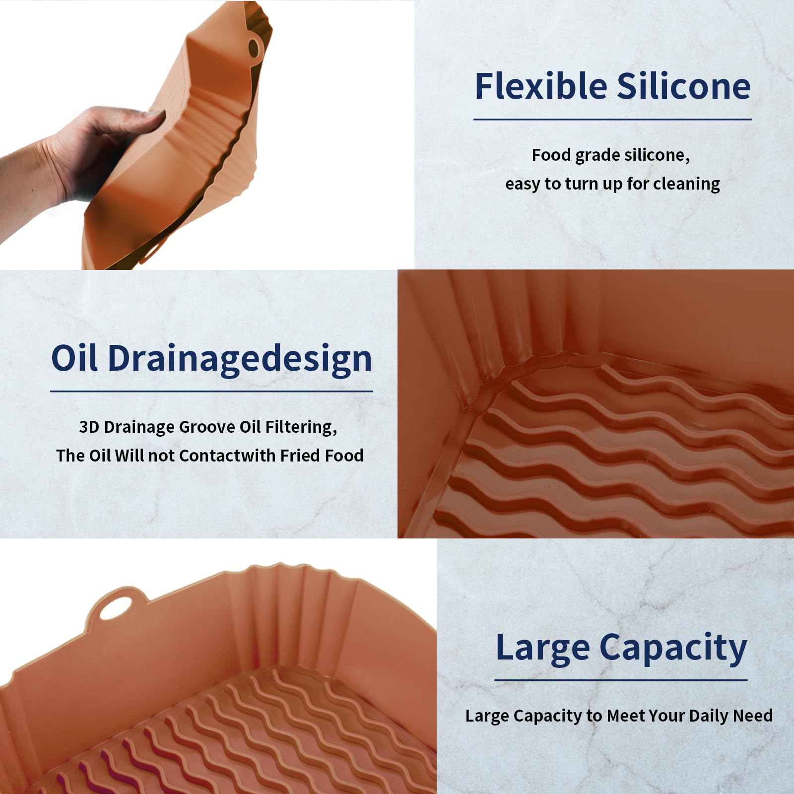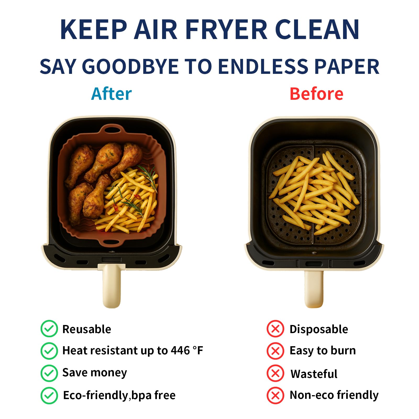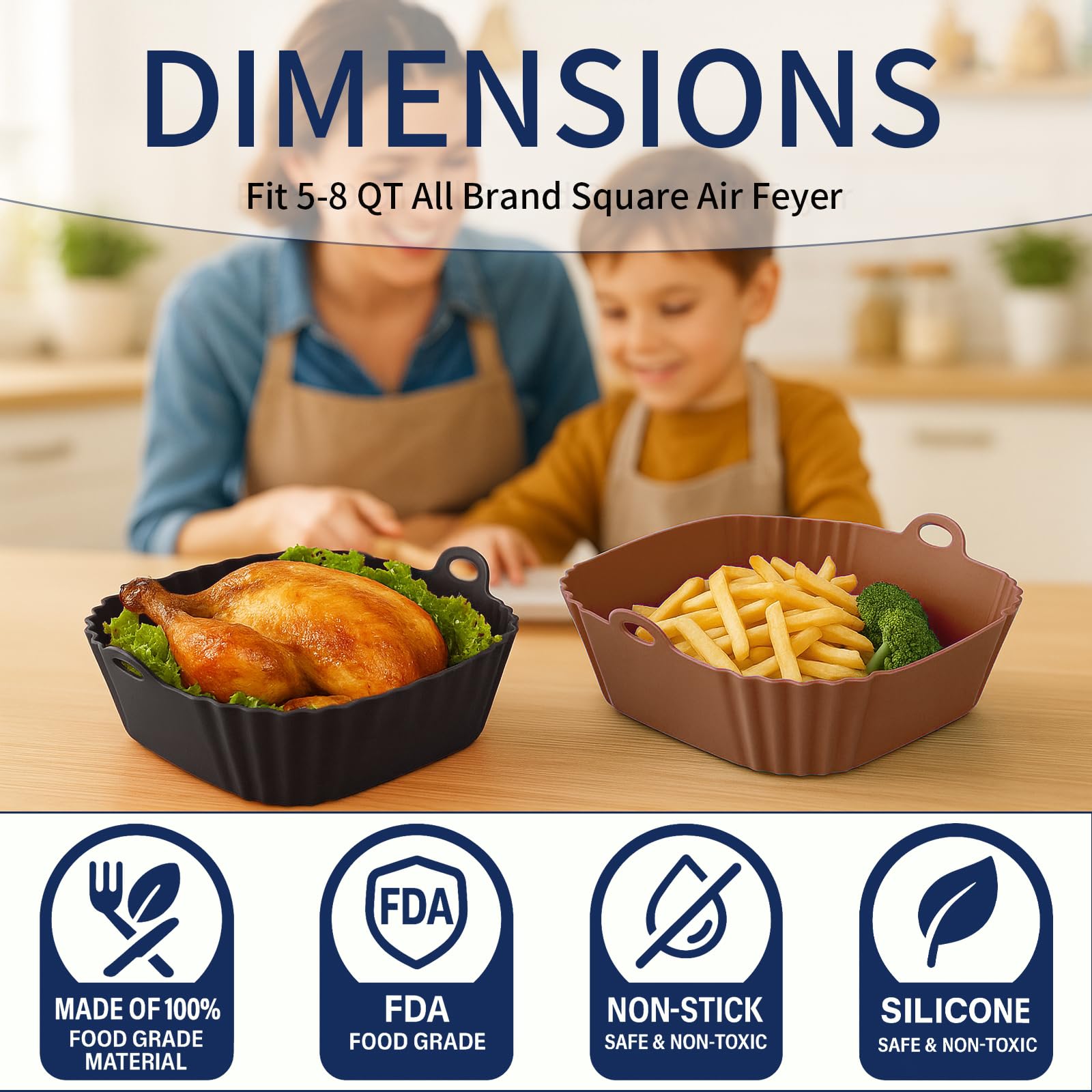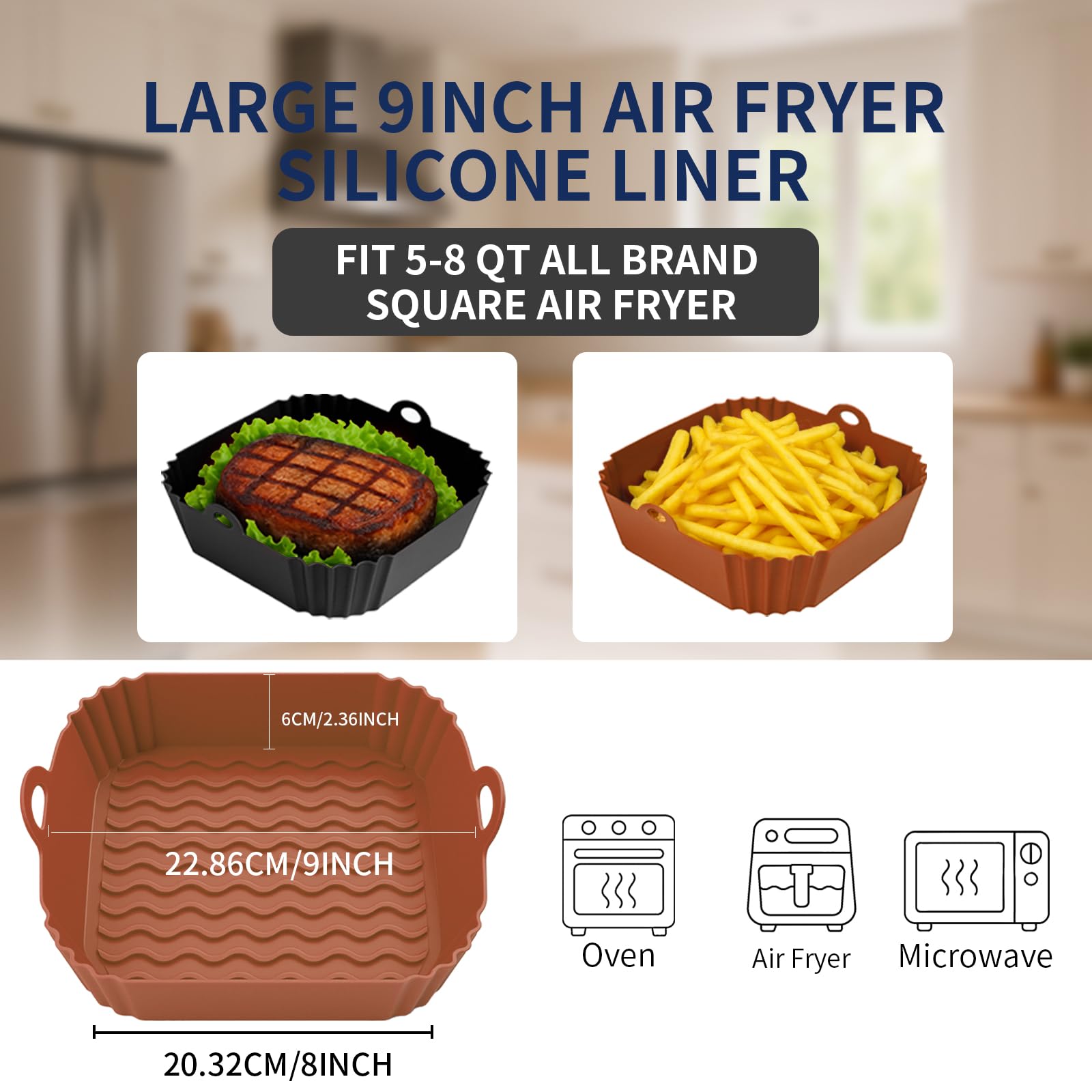[2-PCS Air Fryer Silicone Liners] Our square silicone air fryer liners is thicker, It's about 67mil thick, it's not fragile. Upper size 9 inches, bottom size 8 inches, 2.36 inches/ 6 cm in height, Fits 5 to 8 QT Air Fryer.