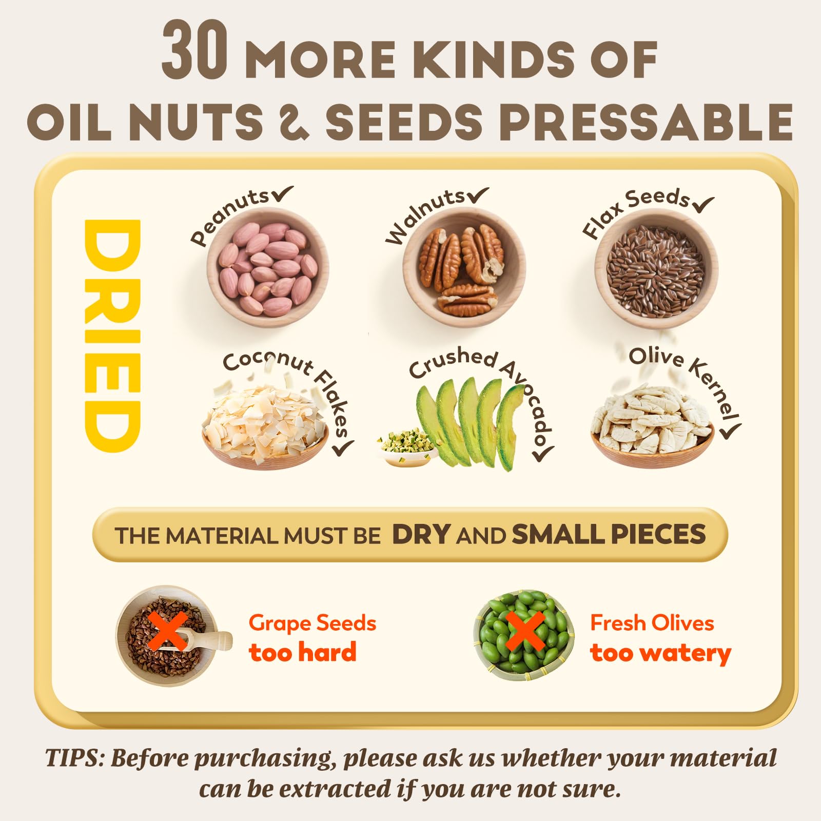 SQUEEZABLE MATERIAL:Varieties of materials including Coconut, Sunflower Seed, Walnut, Okra, Soybean, Peanuts, Moringa Seed, Kiwi Seed, Winged Oil Fruit, Perilla Seed, Shelled Hemp Seed, Flax Seed, Camellia Seed, Rapeseed, Black Sesame, White Sesame, Almond Powder, Pepper Seeds, Pumpkin Seeds, Pine Nuts, Licorice, etc(raw materials with oil content > 15% are suitable for oil extraction). If you want to press other kind of seeds, please contact us and we will press it first as a tes.