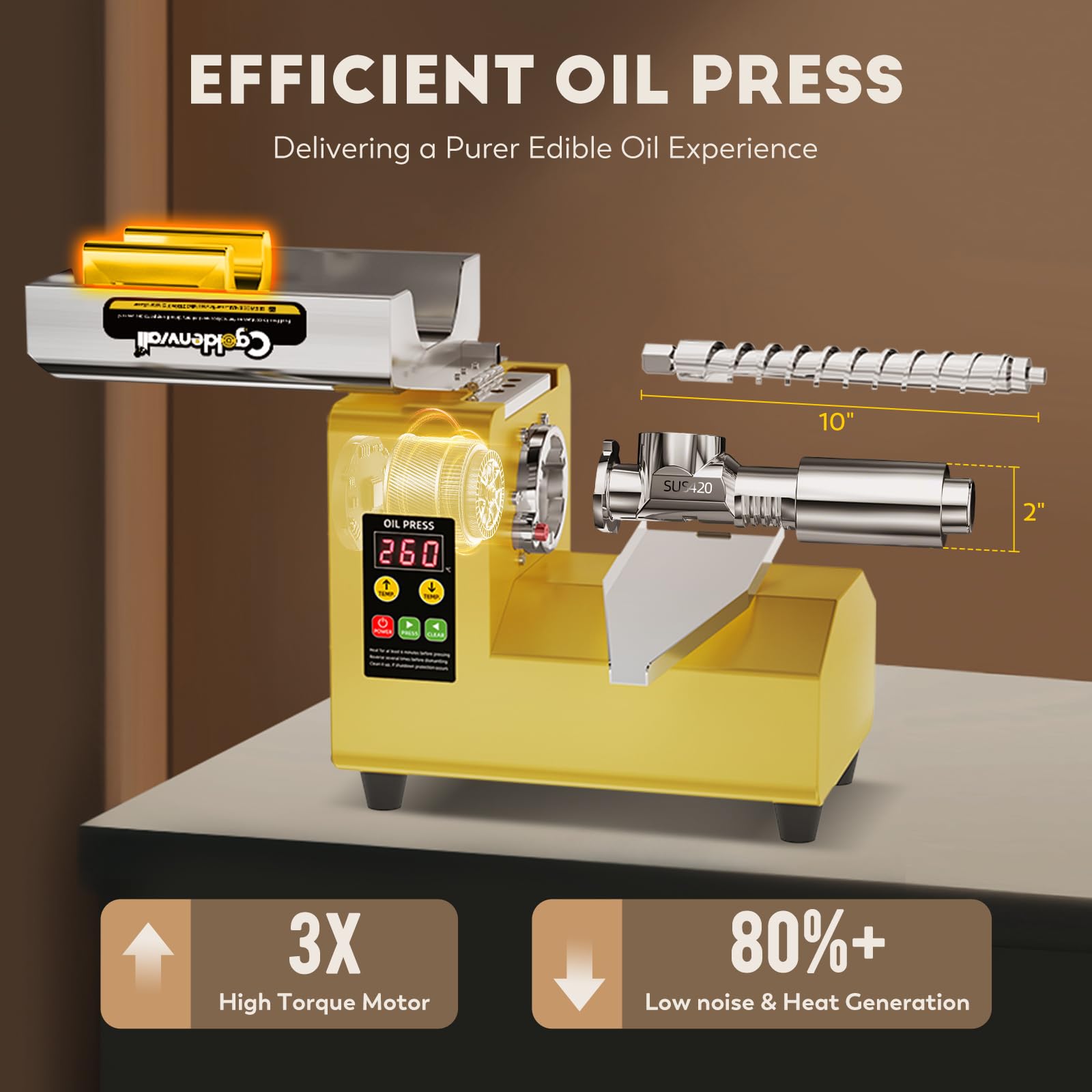 PRECISE TEMPERATURE CONTROL:The Automatic Oil Press with the combination of the intelligent temperature controller and the machine's heating device, the oil presser can achieve a real-time monitoring and adjustment of the temperature. Regulate temperature according to different raw materials, you will to get More and Better Oil. Temperature Setting: 32-572°F.