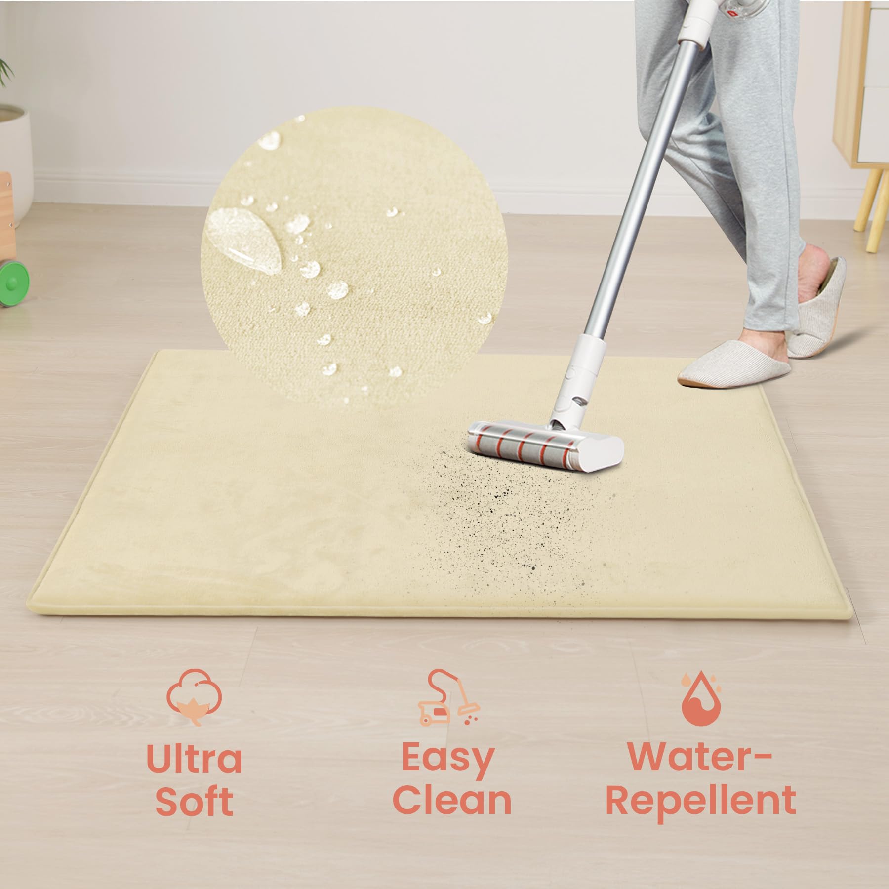 Water-Repellent& Easy-Clean Coral Velvet:The soft, water-repellent coral velvet fabric repels spills and messes, making cleanup effortlessβideal for infants and toddlers during feeding, play, or tummy time mat activities.