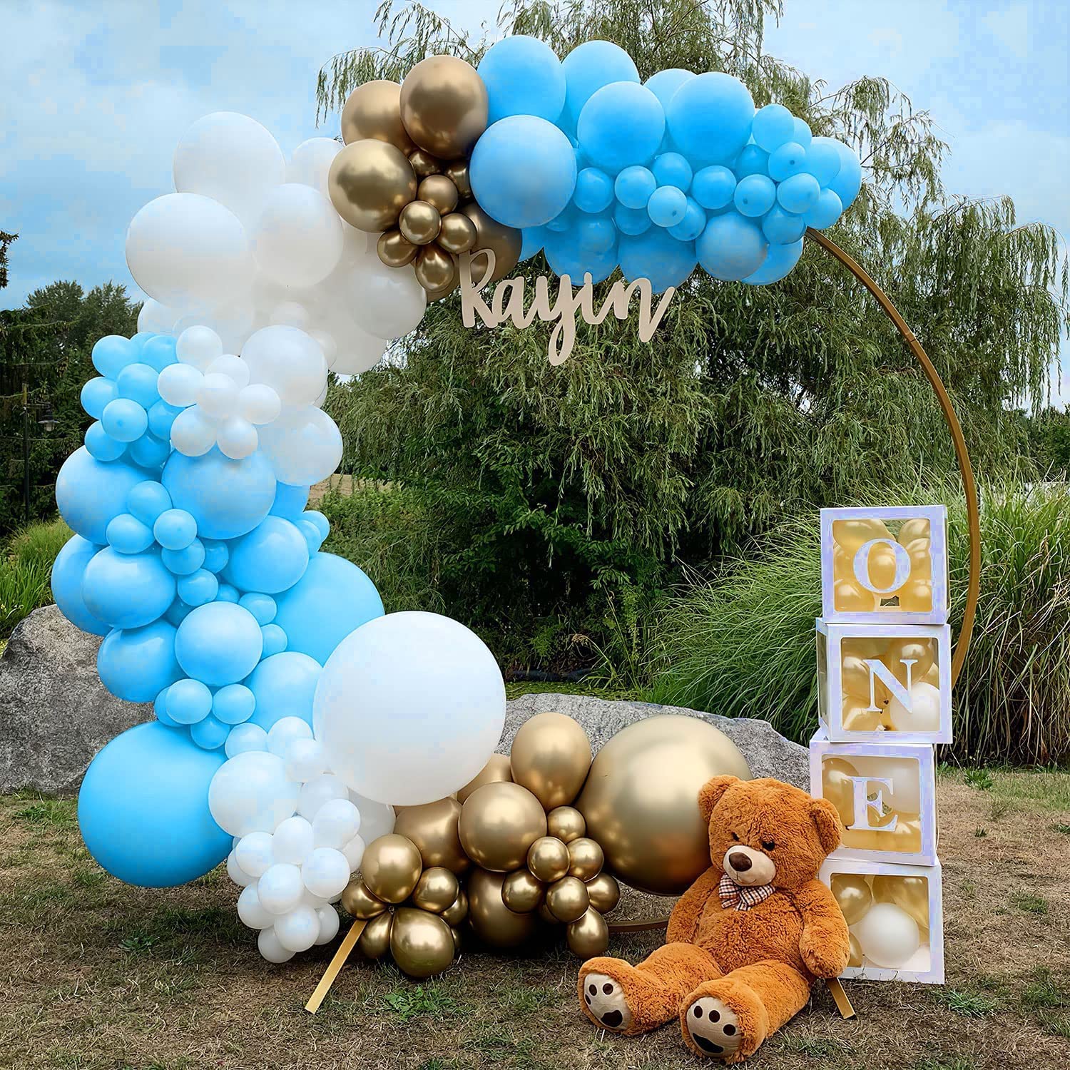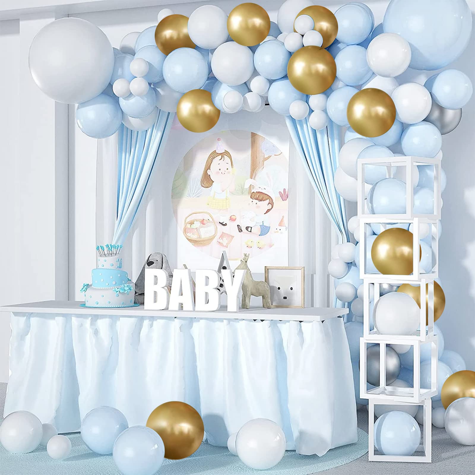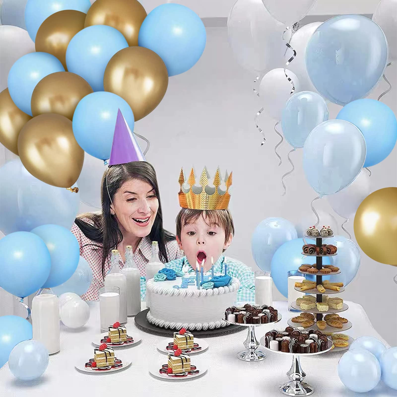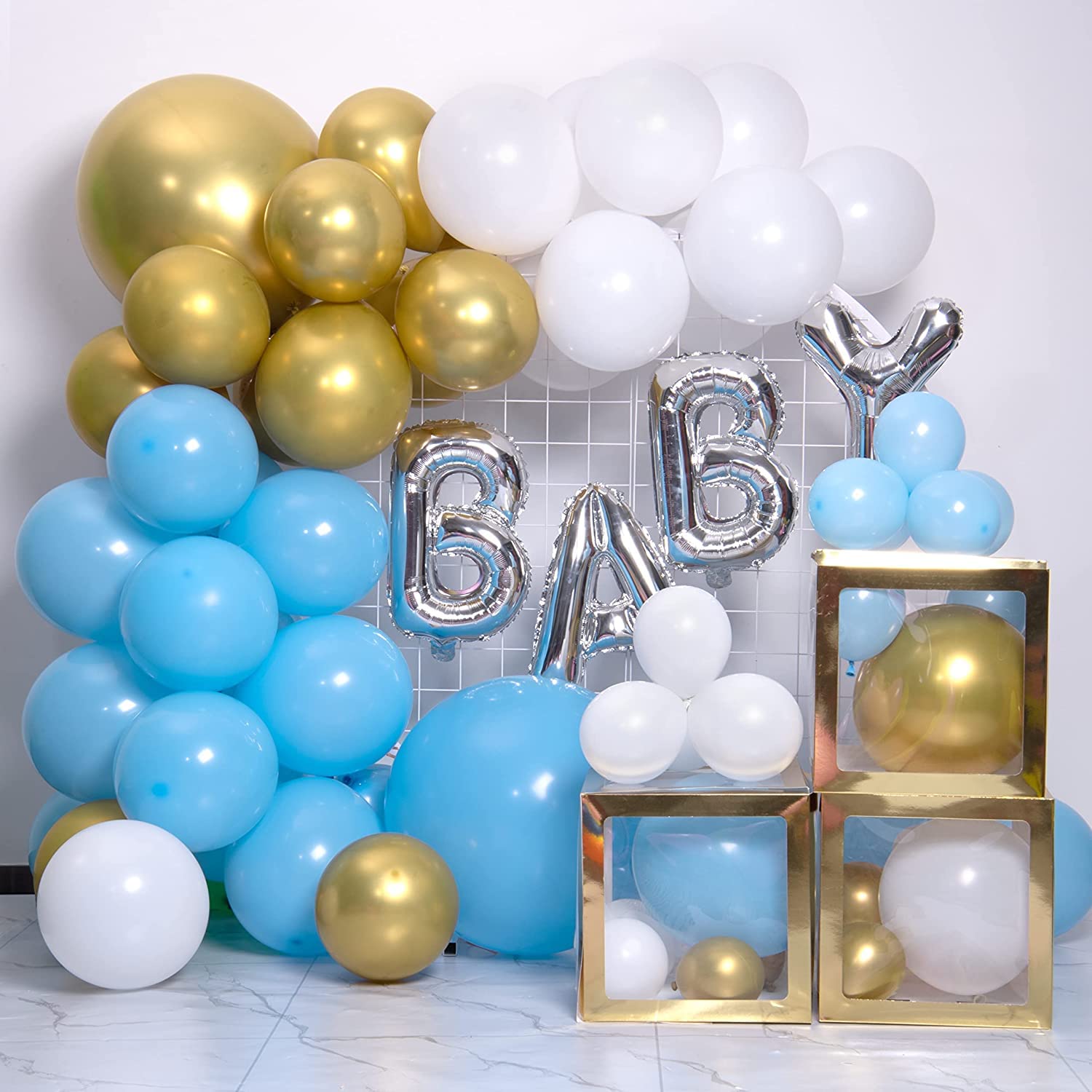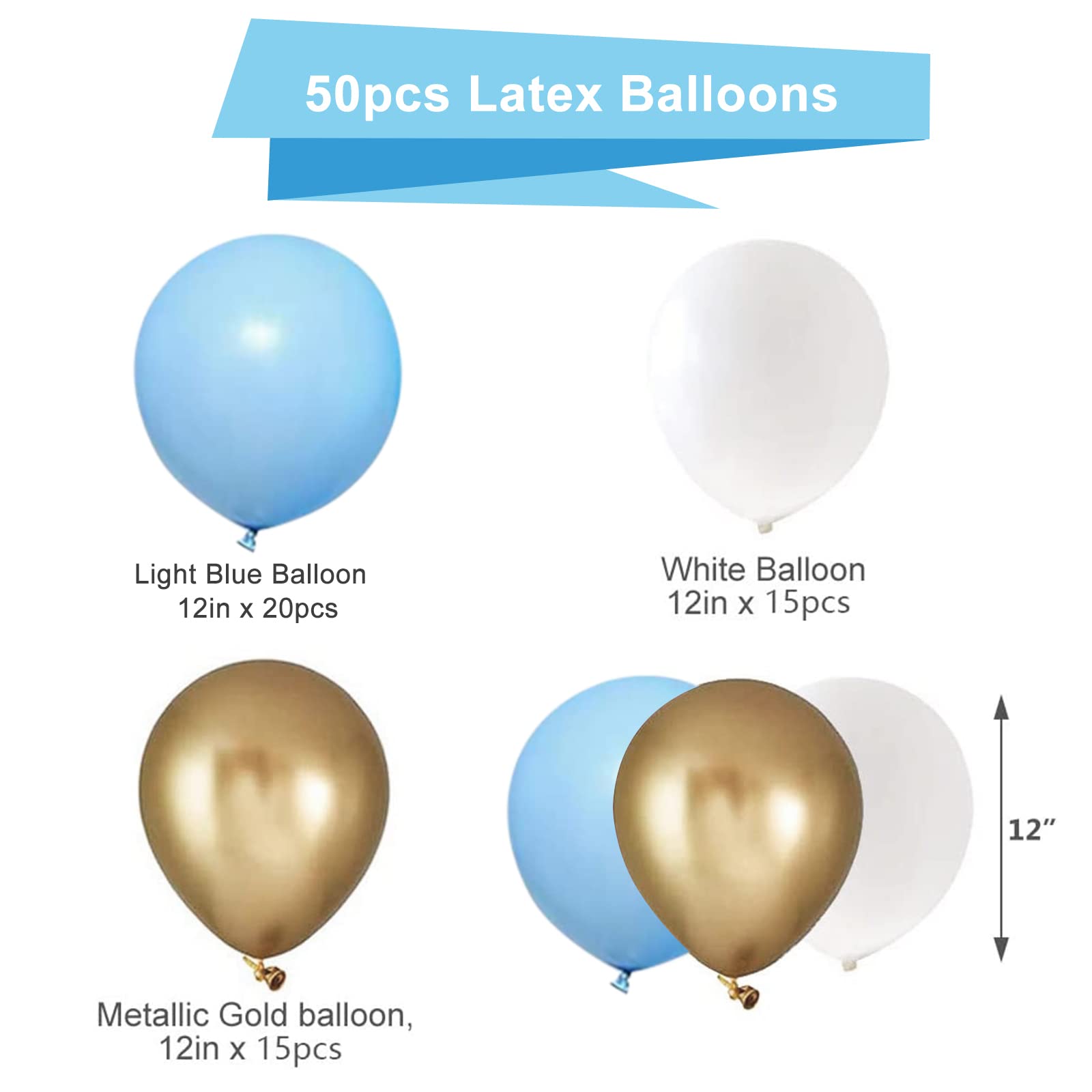 【What You will Get】: The main color of party balloons is blue. The baby shower balloon sets come with 20pcs macaron blue balloons, 15pcs white balloons, 15pcs metallic gold balloons. Party balloons are all 12 inches, and the uniform size can provide consistency for your party equipment.
