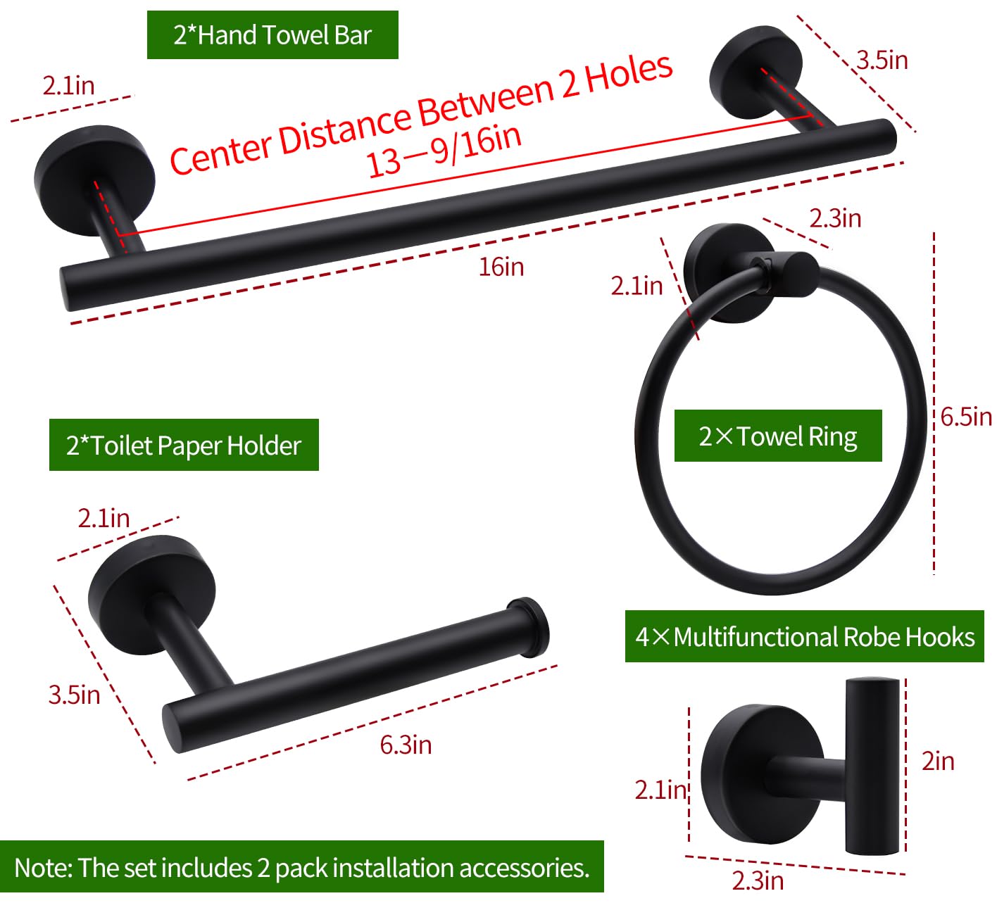 Features: 1. There are 2 towel bars, 2 toilet paper holders, 2 towel rings, 4 robe towel hooks and other accessories. 2. Round shape without sharp edges avoids scratching the skin, built-in hex screws can prevent rotation. 3. 10pcs bathroom accessories kit is mainly made of high quality stainless steel with black matted surface. 4. Bathroom hardware set is easy to install and their max weight capacity range from 11-22lb(5-10kg). 5. Towel Bar Set is designed with sleek simple lines and concealed mounting hole for modern and tidy décor. Specifications: Item Name: Bathroom hardware set Item Material: Black matted stainless steel Hand Towel Bar Length: 16in Toilet Paper Holder Length: 6.3in Towel Ring Diameter: 6.5in Item Color: Black Package Weight: 3lb Package List: 2 × Hand towel bar 2 × Toilet paper holder 2 × Towel ring 4 × Robe hook