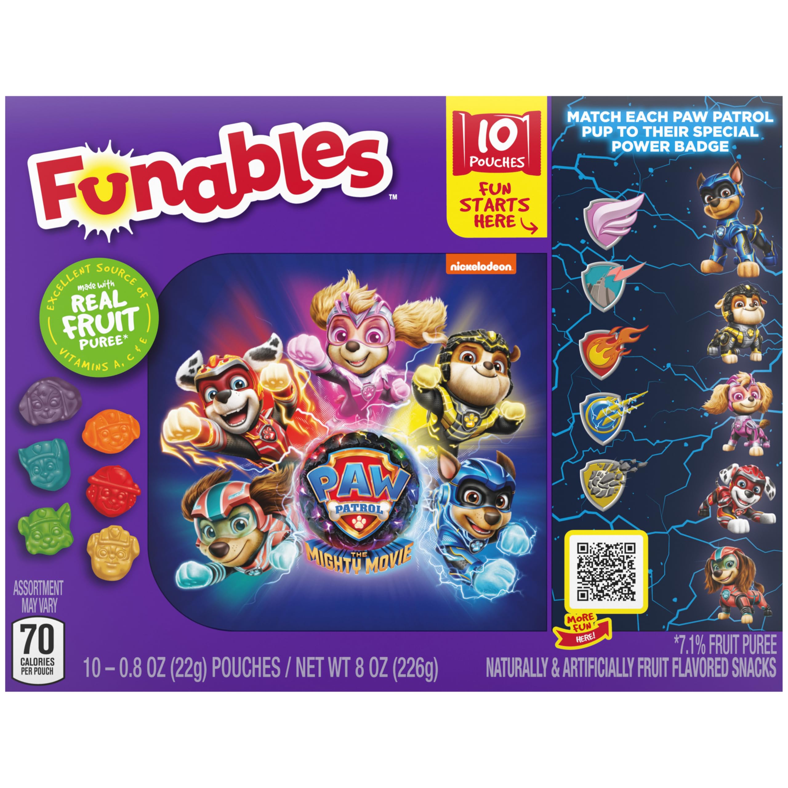 No hunger is too big, and no snack is too small for Funables fruit flavored snacks featuring PAW Patrol rescue pup characters from Nickelodeon Spin Master. Each box of snacks includes an assortment of ten individually wrapped 0.8 packs of fruity snacks featuring PAW Patrol characters. The cute bags include a delicious variety of flavors and of Ryder’s favorite pup-kicks. These are snack time’s best friend, packing a lot of fruity bark into every little bite. In addition to being made with 7.1% real fruit puree they're fat free and an excellent source of Vitamin A, C, and E. Is your snack tag blinking? Head to the Lookout! PAW Patrol Funables fruit flavored snacks in individual packs are ready to report for snack duty. Funables PAW Patrol fruit flavored snacks are part of the Funables fruity snacks range that brings you flavor-packed fun. In vibrant, fruity flavors, these fruity snacks are ideal for road trips, going to the movies or giving as a gift to your favorite people. Have fun and eat it too with Funables fruit flavored snacks. Convenient for everyone, Funables makes snacking easy at any time and anywhere.