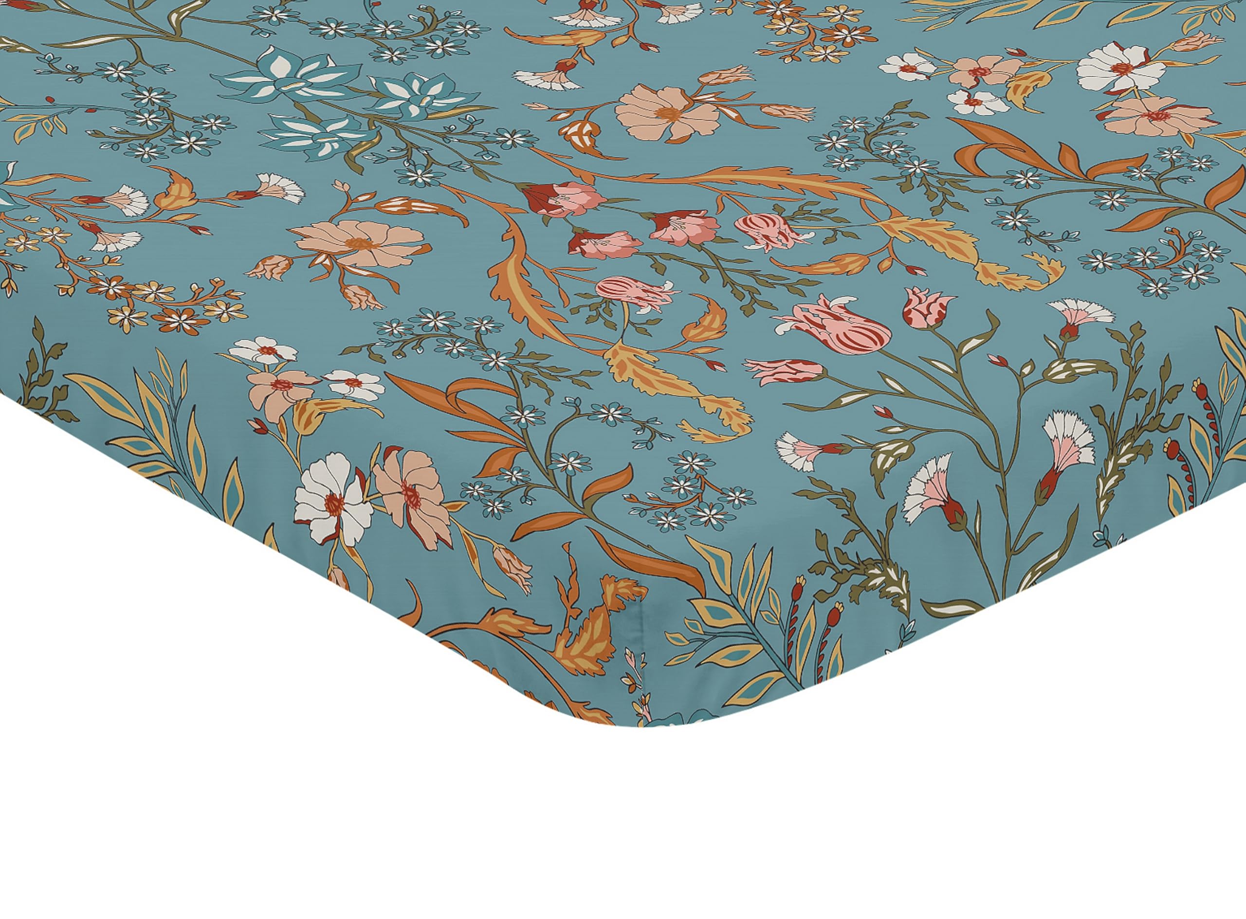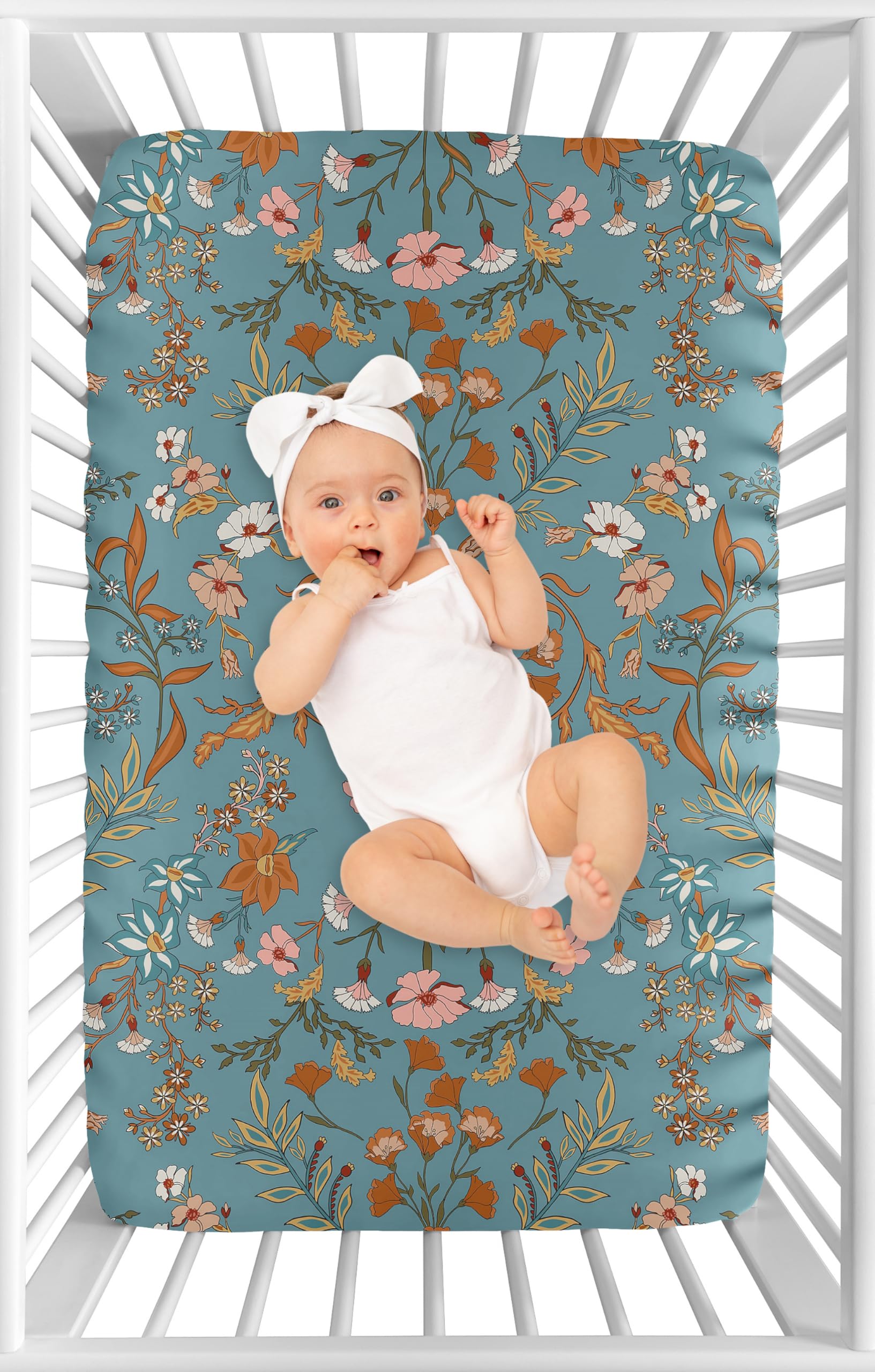 SNUG FIT: Includes (1) Mini Crib Mattress Sheet 24in. x 38in. x 5in. Our newborn mini crib sheets fit snugly, with premium elastic sewn around the entire bottom edge for a secure fit on most smaller size cribs, play yards, & portable cribs to reduce shifting & bunching. This brushed microfiber pack and play sheet features an exclusive design of a turquoise blue, green, pink & yellow bohemian, daisy, paisley, garden wild floral print & is gentle on delicate skin. WILL NOT FIT STANDARD SIZE CRIBS.