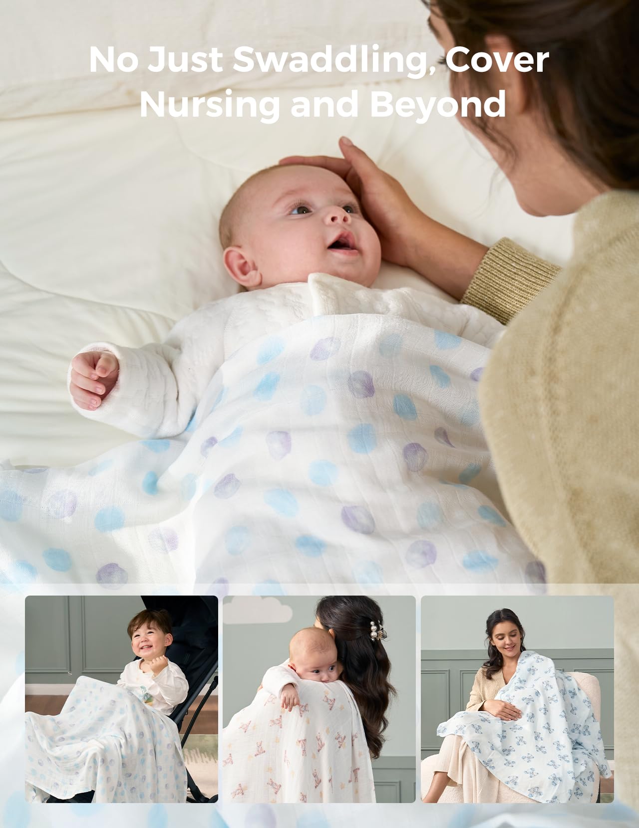 【Large Size Muslin Blankets Can be Folded Creating Different Warmth】 The size of Momcozy 47''x47'' swaddle blanket is larger than most receiving blankets which can help mothers a lot when swaddling babies, super comfortable and stay cool in summer, huge enough and just double or triple it up for another layer of warmth creating a thicker and warmer wrap for the winter. Suitable for all seasons, warm in winter and no hot sleeping in summer.