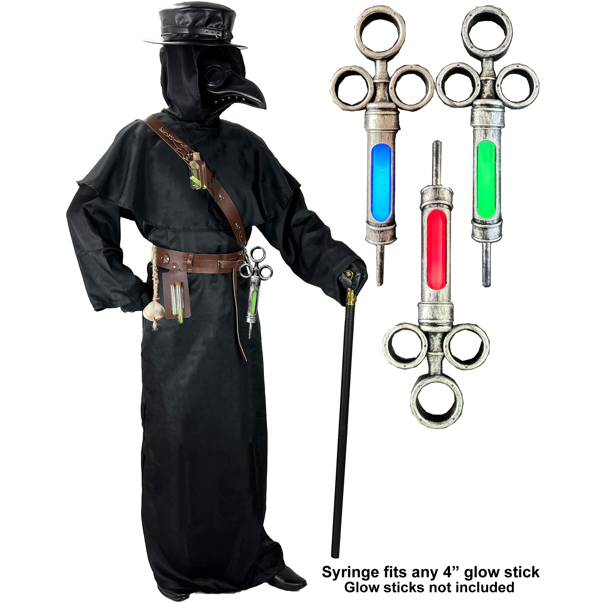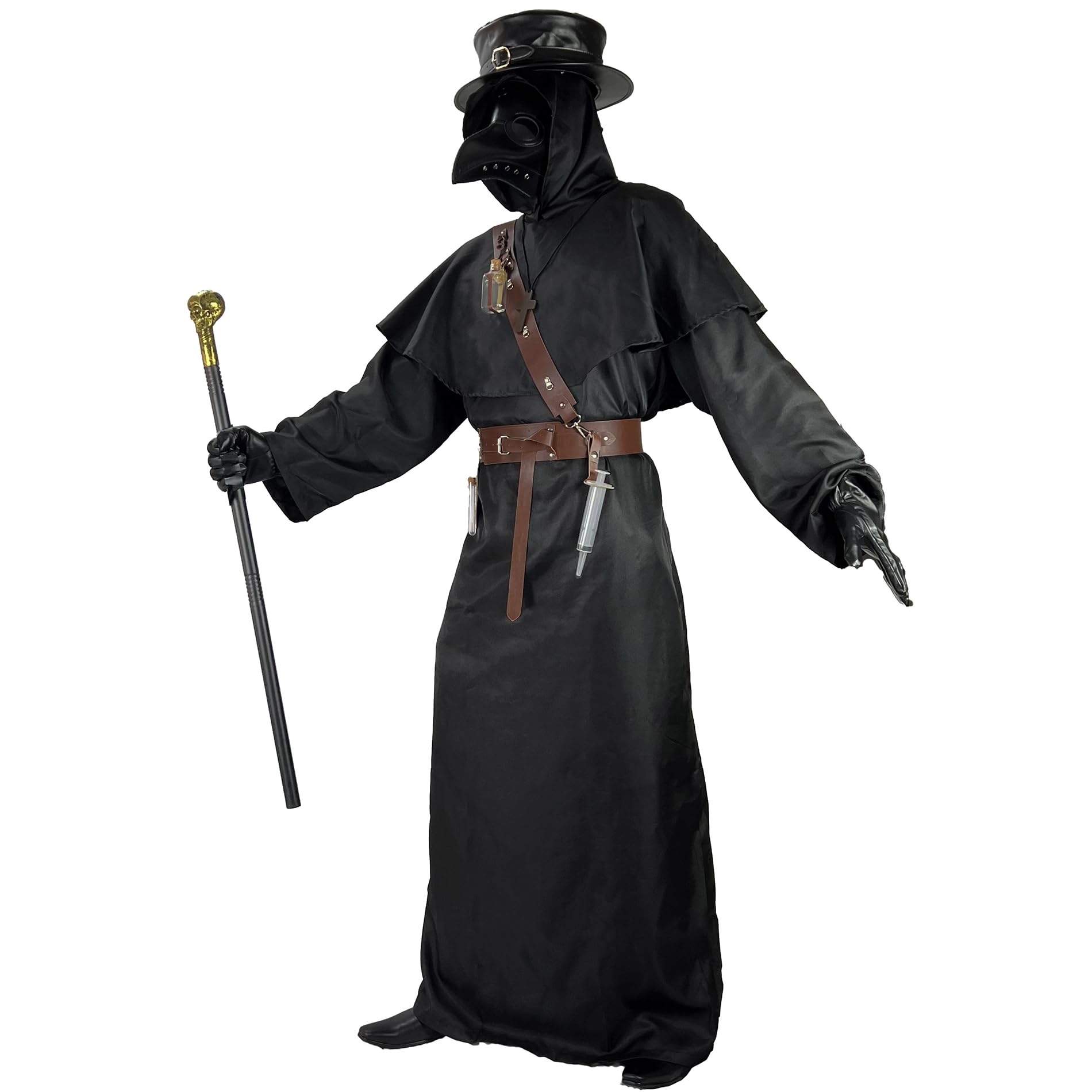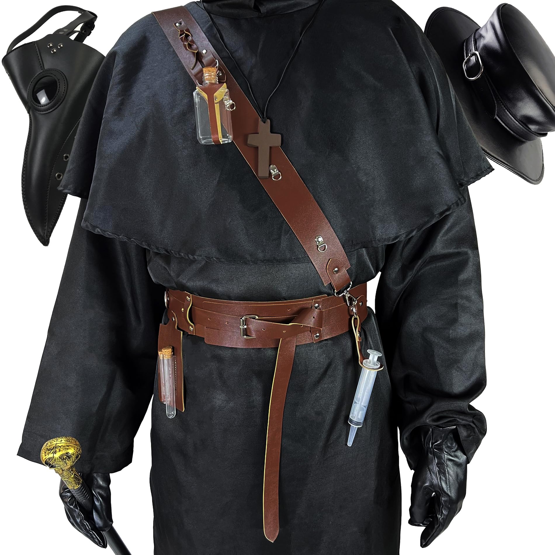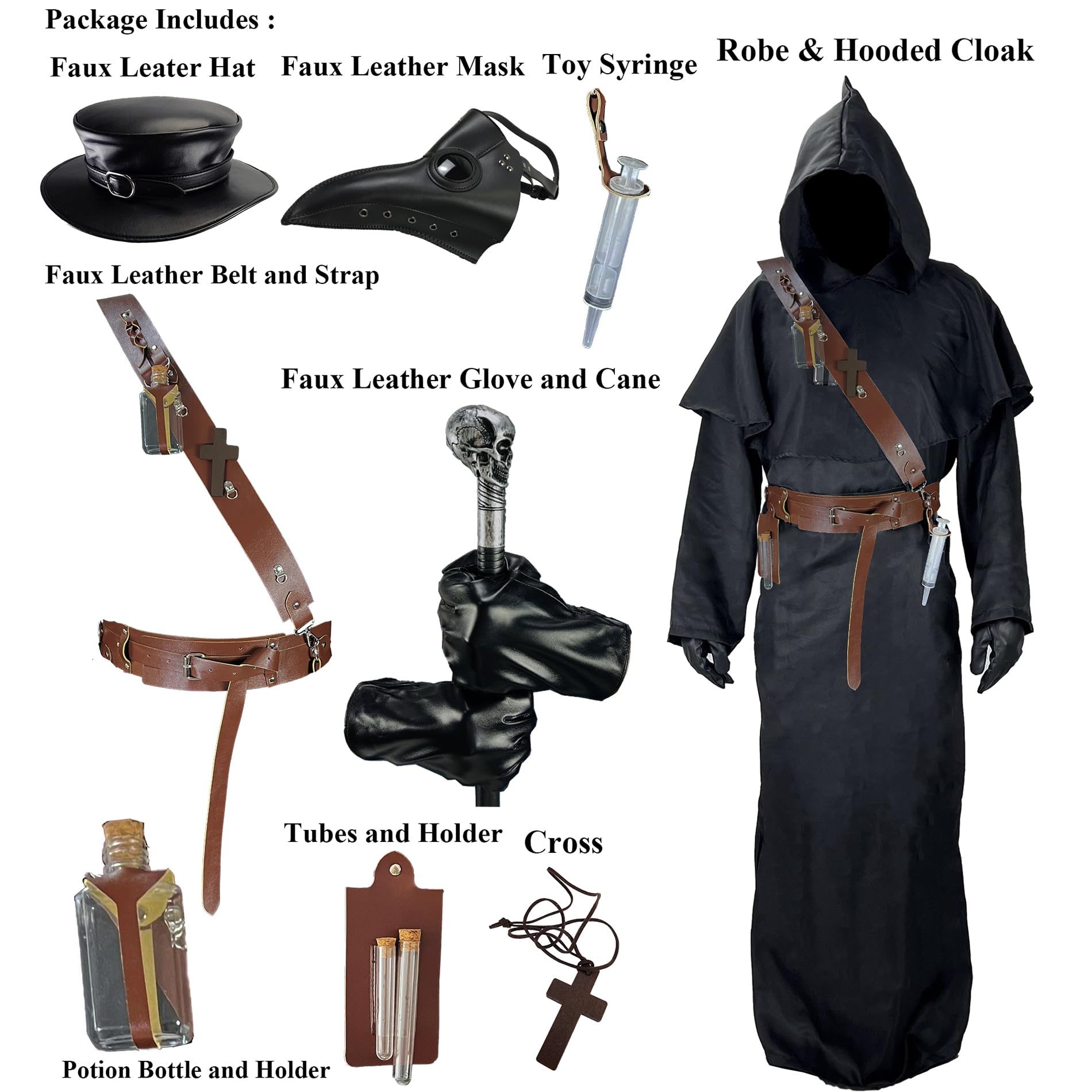 Package included : 1pc Faux Leather Mask , 1pc Faux Leather Hat, 1pc Robe, 1pc Hood Cloak, 1pc Walking Cane, 1set Gloves, 1pc Faux Leather Strap and Belt, 2pc Tubes and holder, 1pc ToySyringe and Holder, 1pc Potion bottle and Holder, 1pc Cross Necklace. Please also see size chart in Product Description.