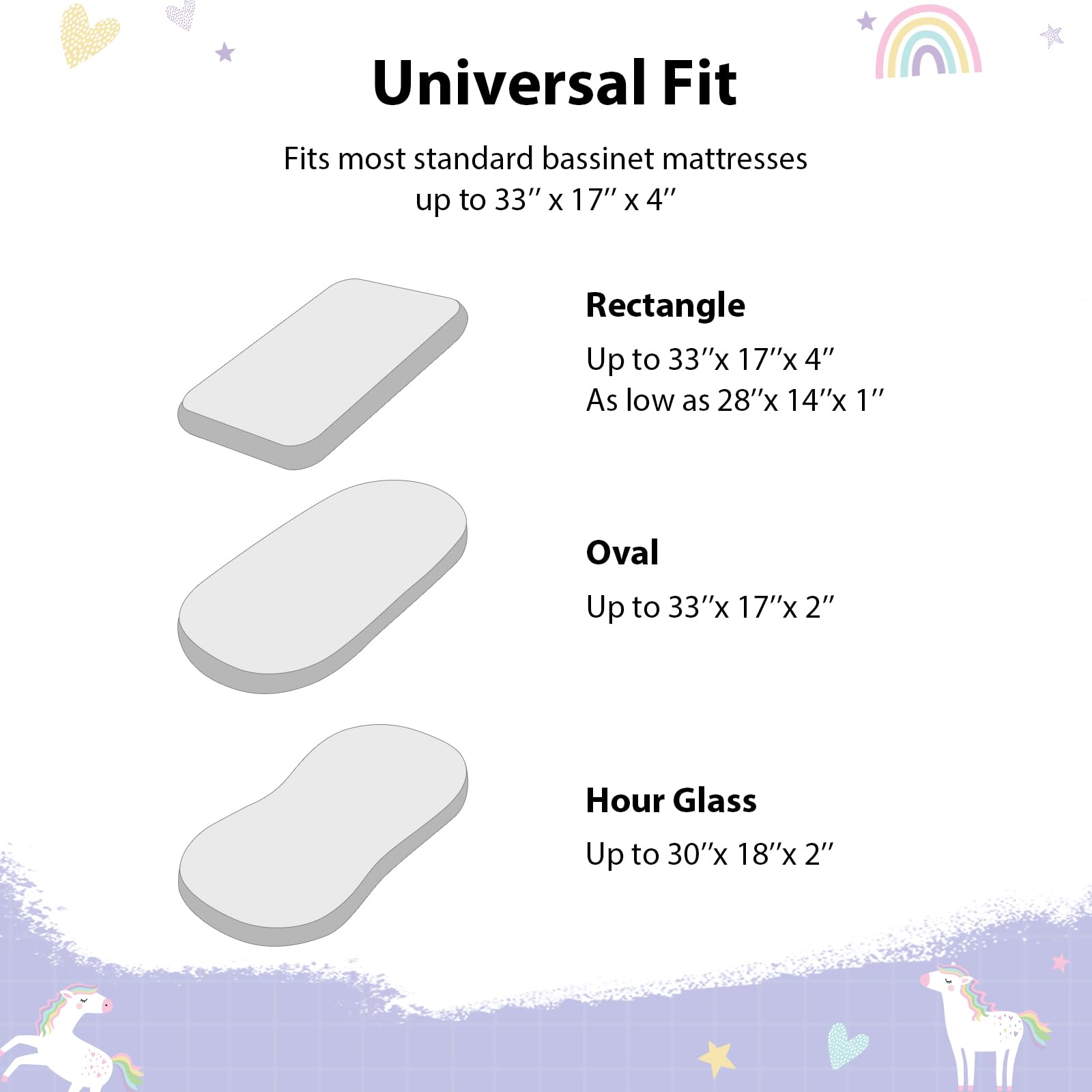 Snug Fit: Measuring 32” x 16”, the 3 pack bassinet fitted sheets fit most oval, round, rectangle, hourglass shaped bassinet mattresses. With full elastic edges of the bassinet sheets, a 5-inch deep pocket, and stretchy fabric, they ensure a snug, wrinkle-free fit that stays securely in place, even during your baby’s most active nights.