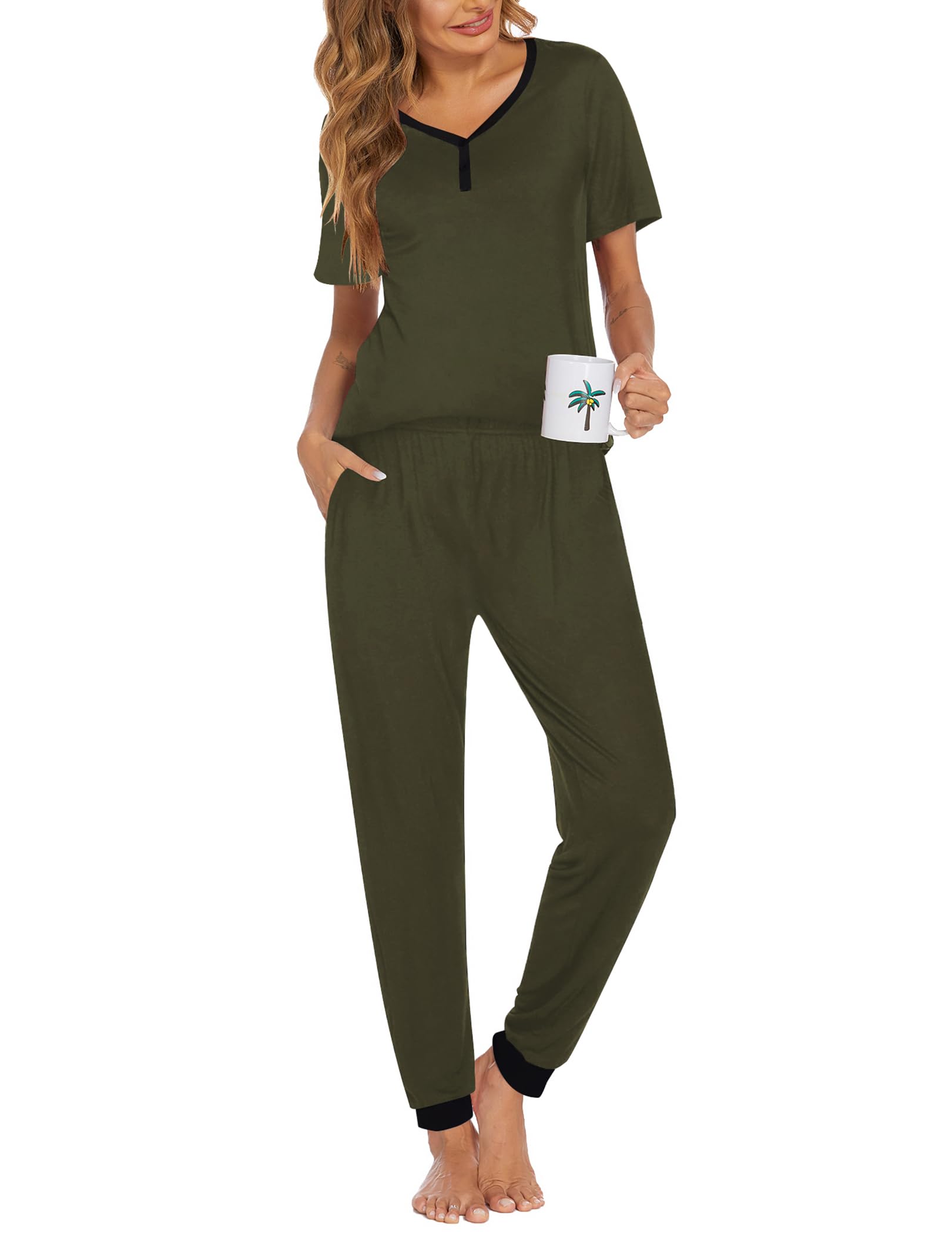 Short Sleeve Tops: The sleepwear pj features with v-neck and button tops. Simple pullover styling for easy fit. Stylish and elegant ladies sleepwear night set