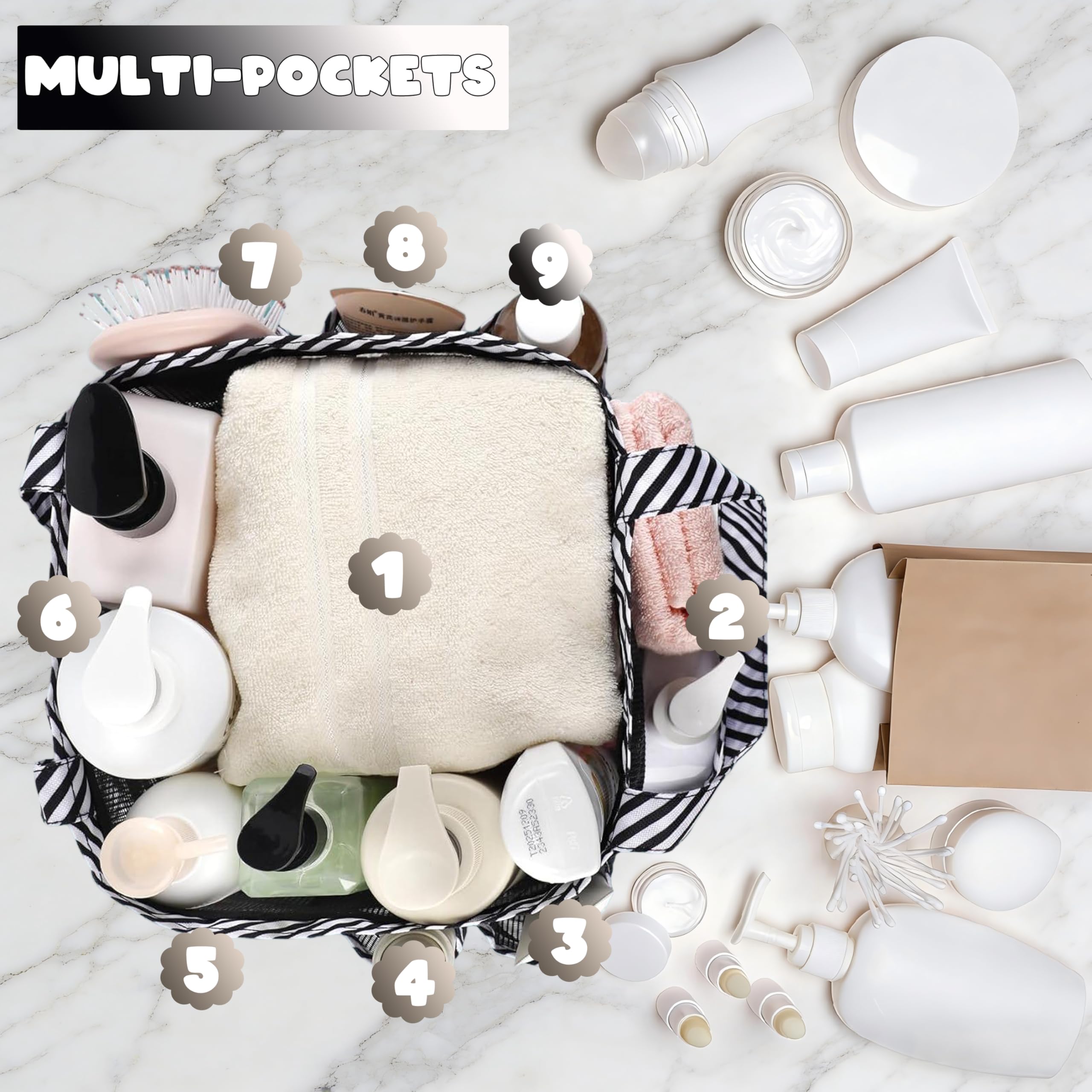 Ample Storage Space : Shower bag has eight outer pockects and a large center one, the main pockets can keep bigger stuffs easily accessible like shampoo,towel, toiletries, hair dryer. Side pockets can contain toothbrush, shaver and keeps them organized