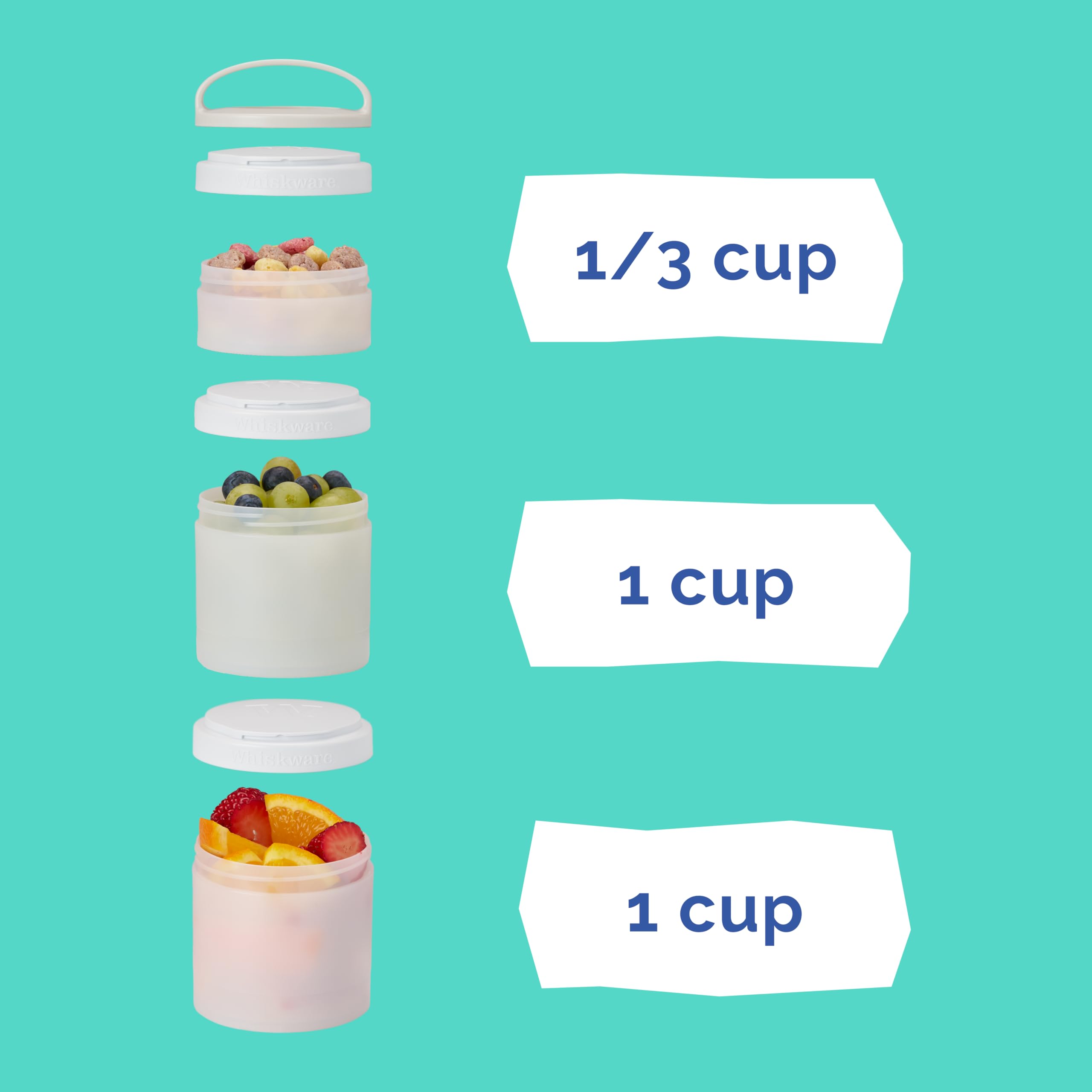 Includes 3, cupholder friendly jars, measuring 1/3 cup, 1 cup, and 1 cup