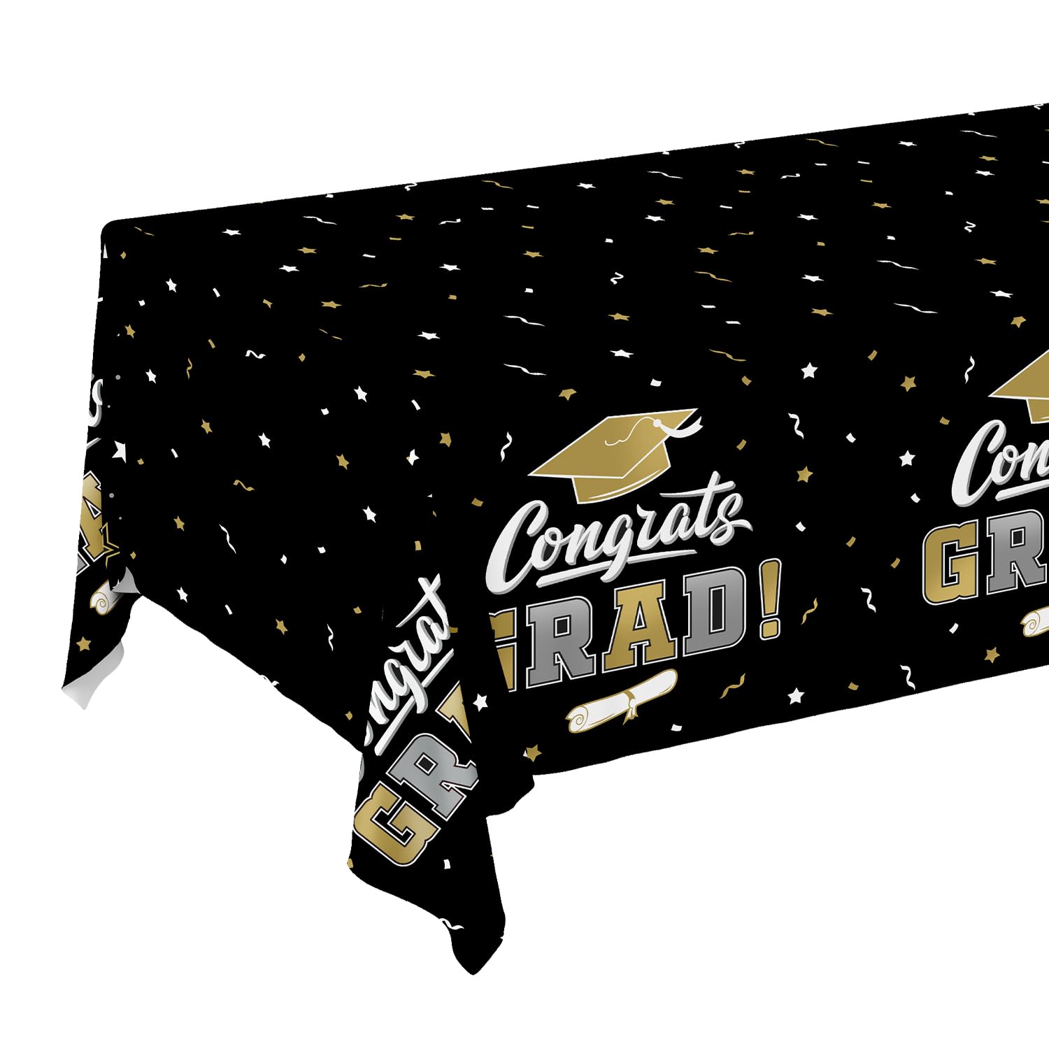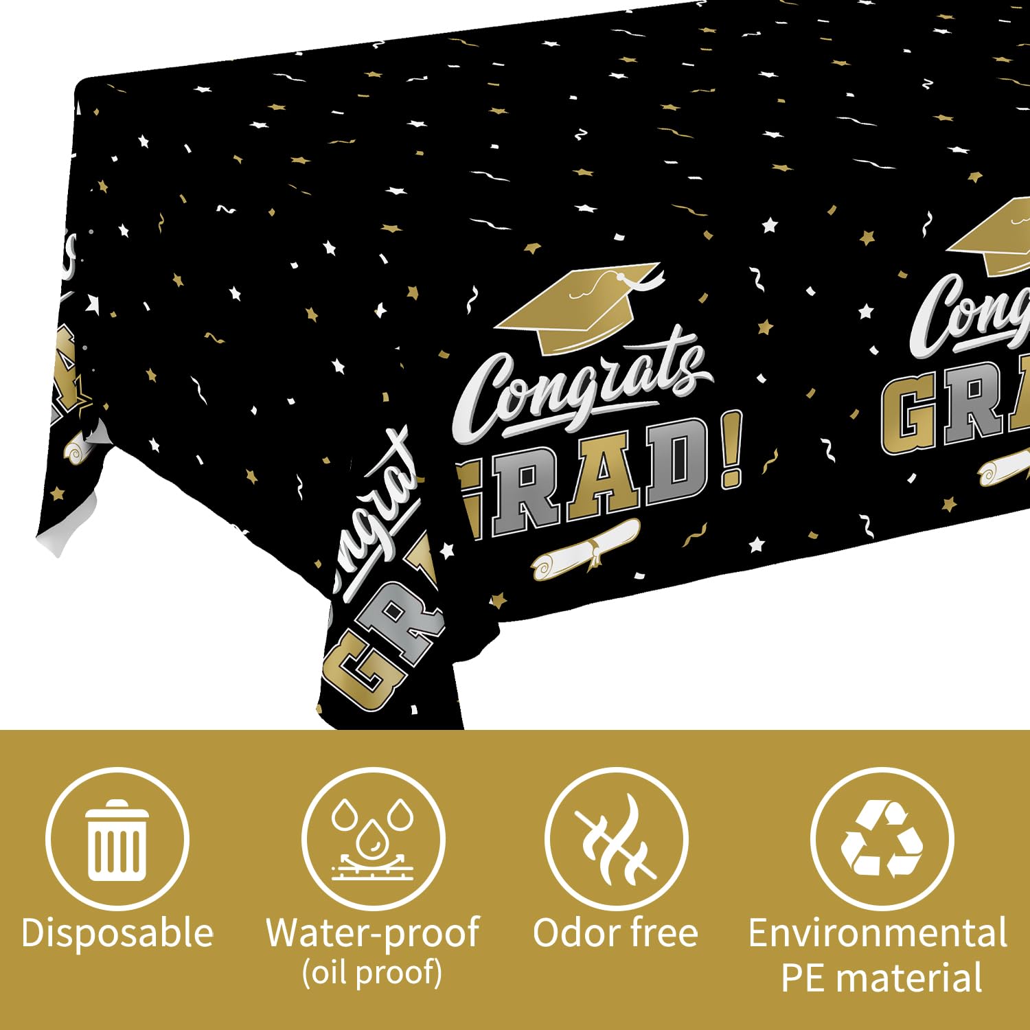 Distinctive Design: Featuring a sophisticated Black and Gold color scheme adorned with mortarboards and the uplifting "CONGRATS GRAD" message, our tablecovers are crafted to spark joy and school spirit at your graduation party.