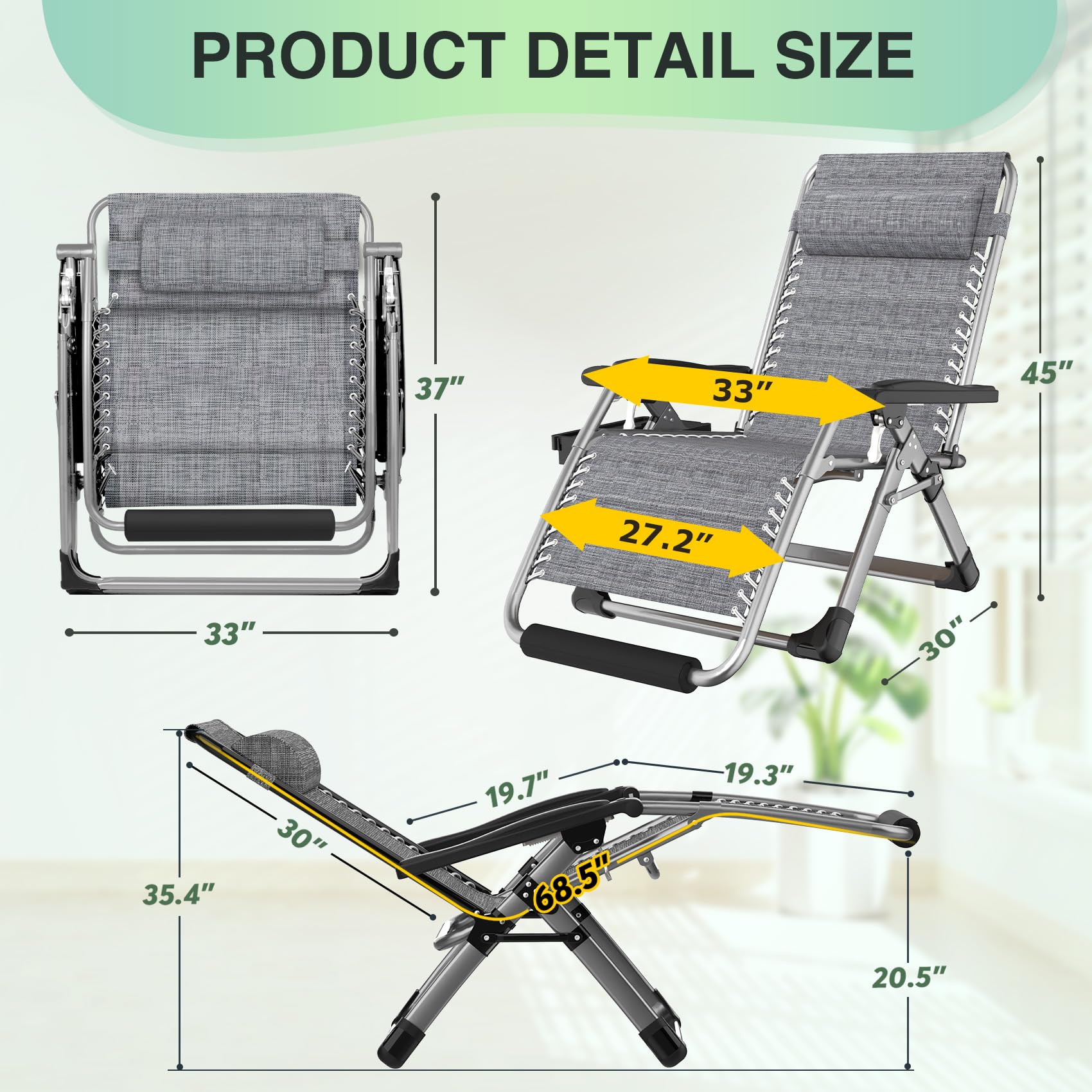 【Portable and Versatile】This foldable zero gravity chairs need no assembly and can be folded and unfolded in seconds. The lightweight folding design is easy to carry, suitable for yards, lawns, terraces, decks, gardens, courtyards, balconies, pools and beaches